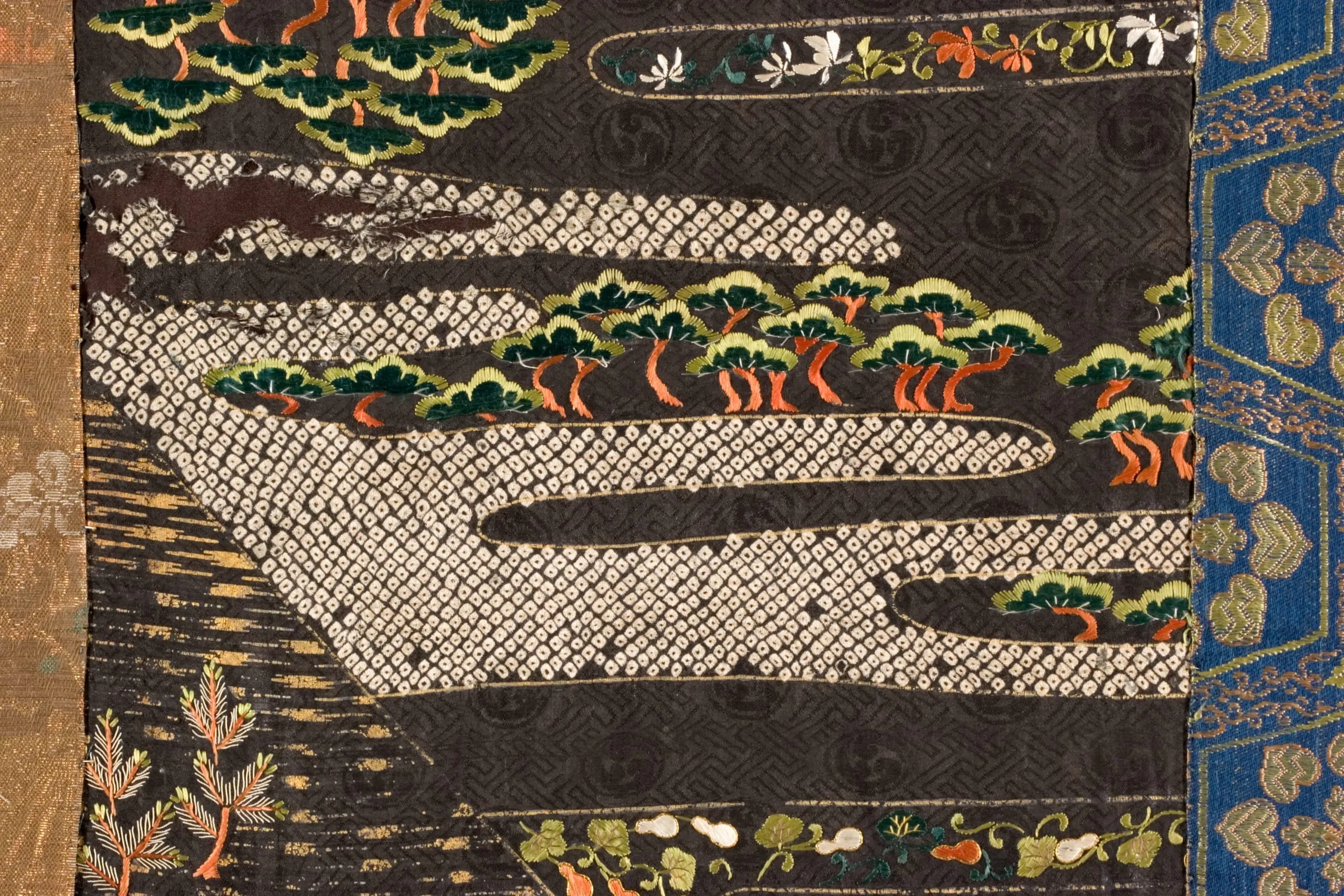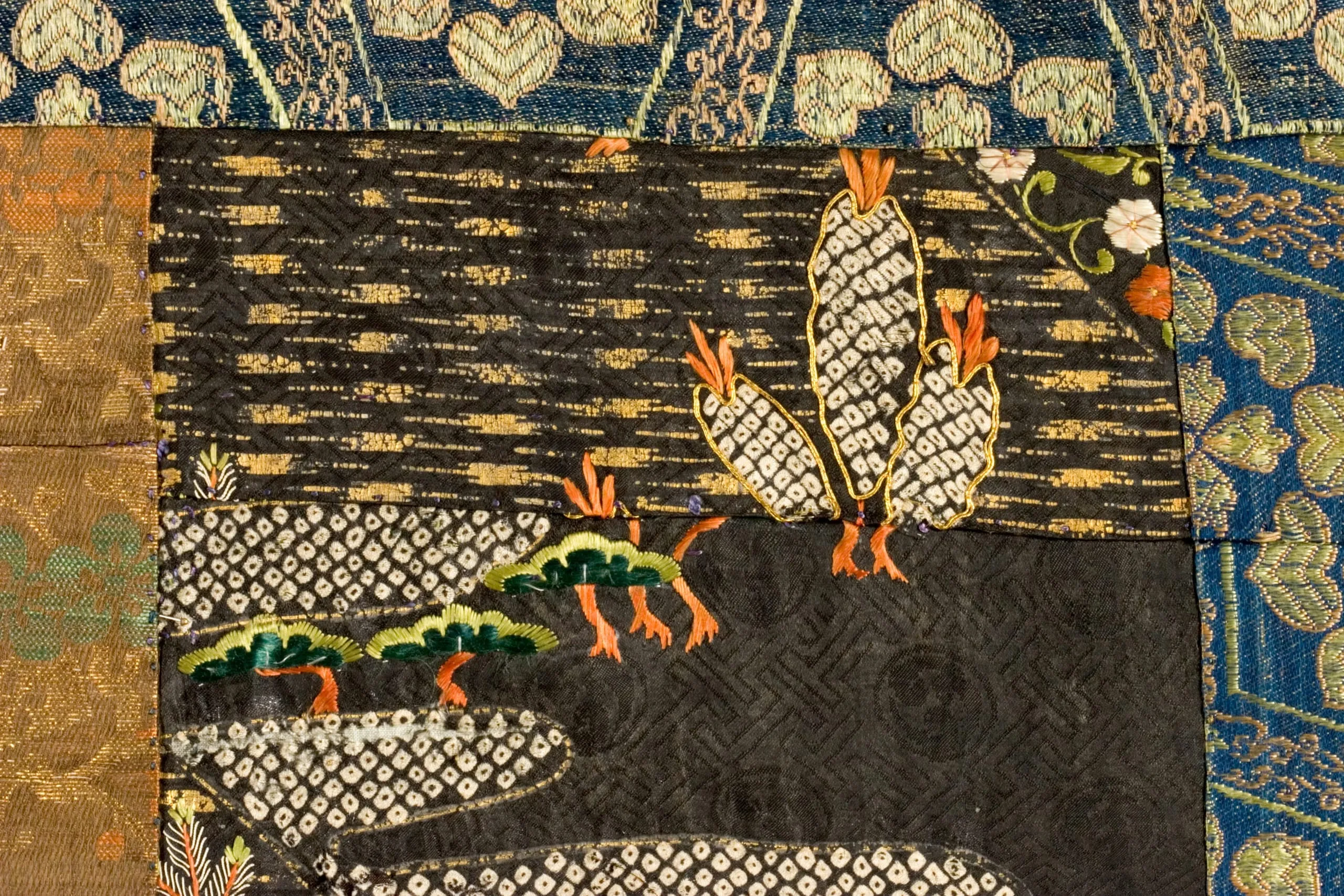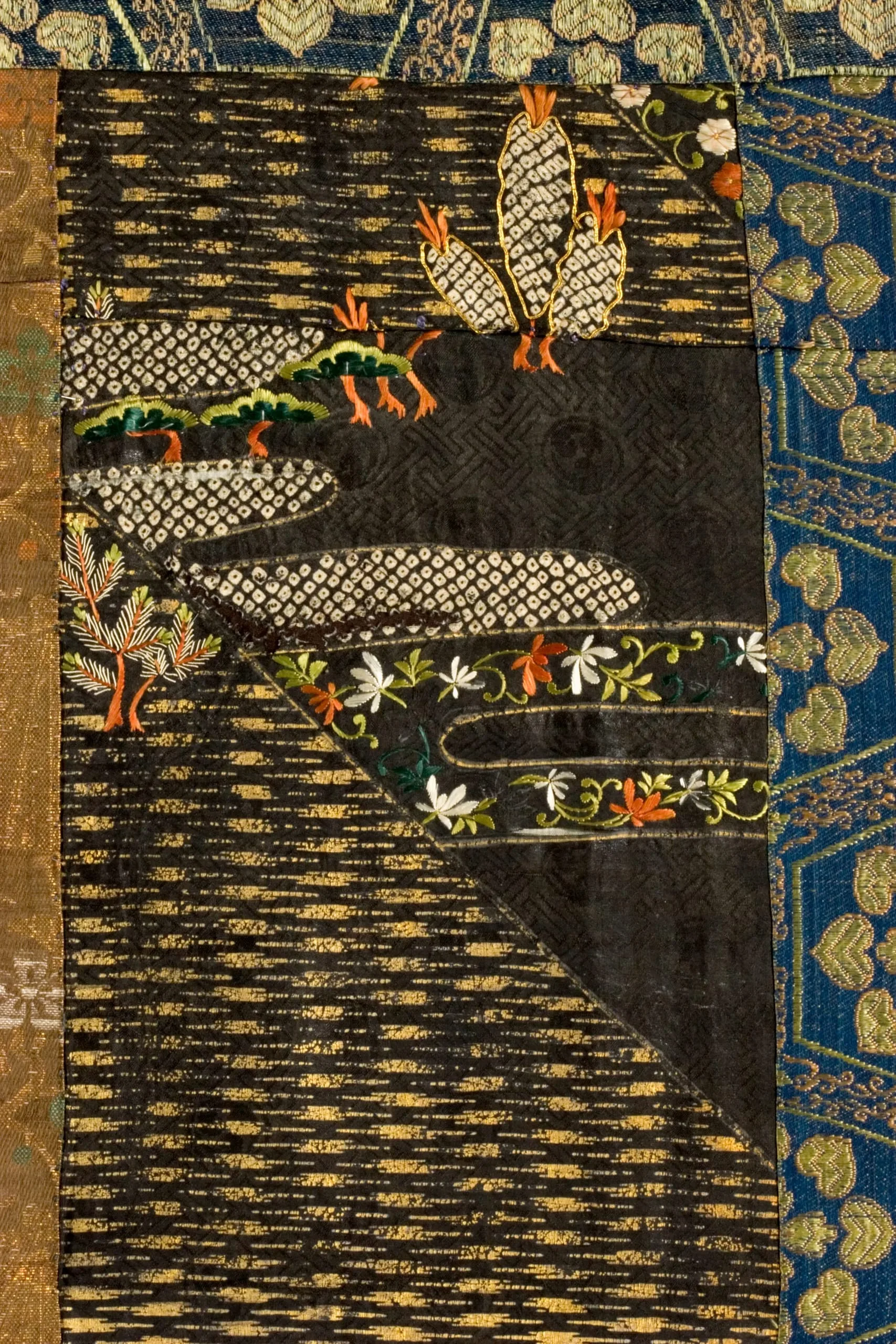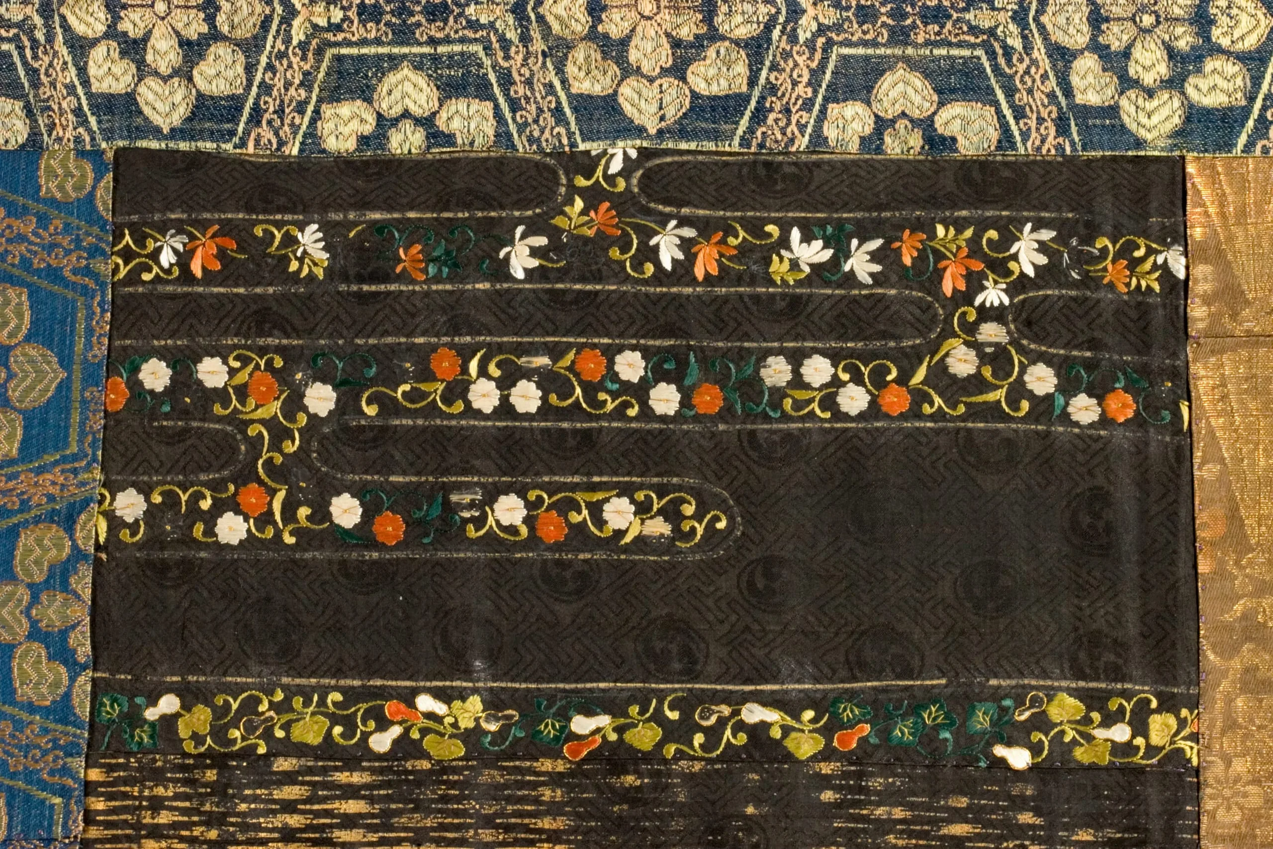 The way in which this rare, early 17th-century kimono came to be an integral part of a sacred garment can be explained by the tradition of donating a woman's most beloved kimono (along with prayers for the repose of her soul) to a temple at the time of her death. Her robe would later be taken apart, cut into pieces, and re-sewn into ritual textiles such as altar cloths and banners or religious clothing such as kesa. Simple in its typically rectangular shape, kesa are composed of contrasting pieces of donated cloth sewn together in a pre-determined symbolic layout. This prescribed arrangement of cloth is believed to have evolved from the Buddha instructing a disciple to create a garment based on the orderly rows of planted rice fields. The assembly of a kesa by monk, nun, priest, disciple or layperson is a meditative act of merit.