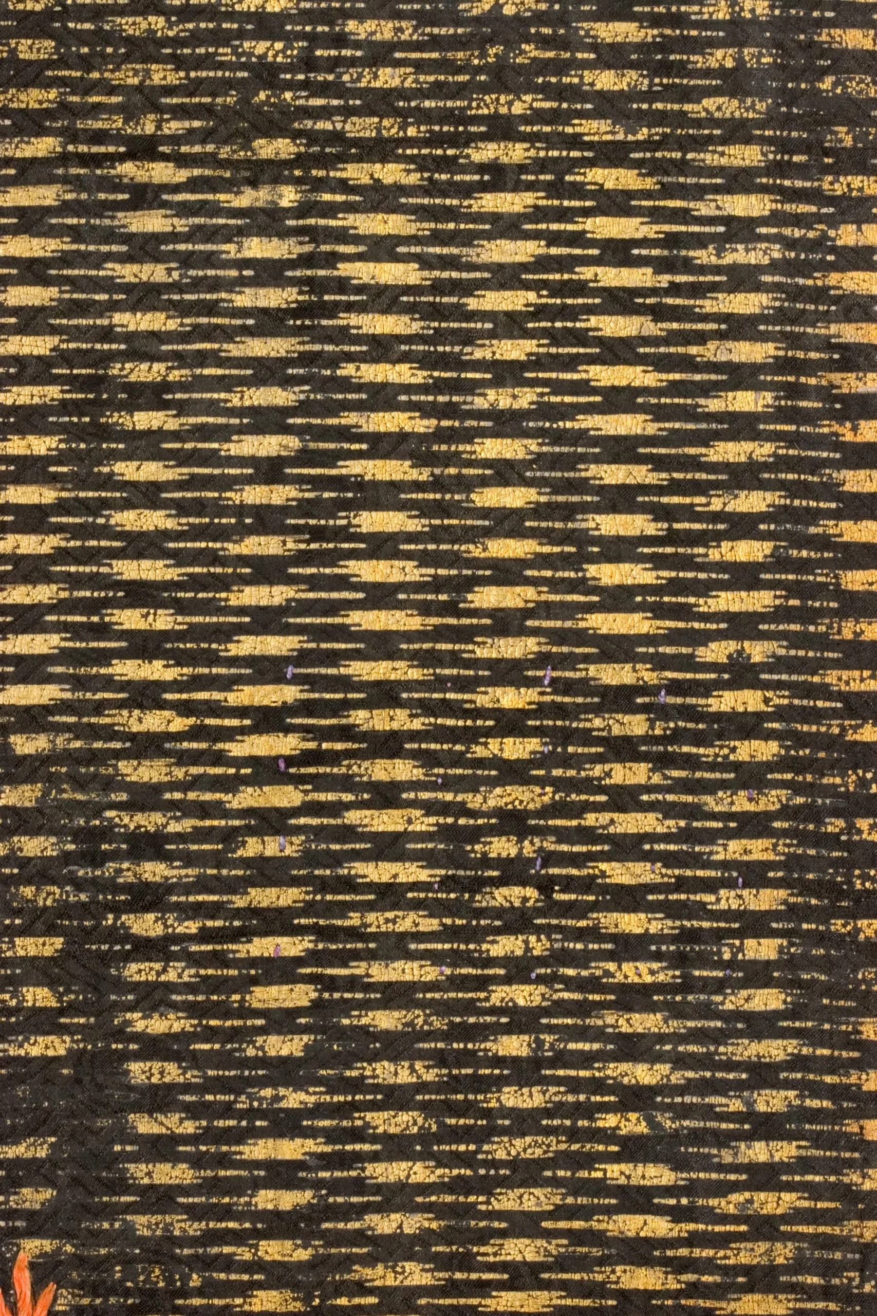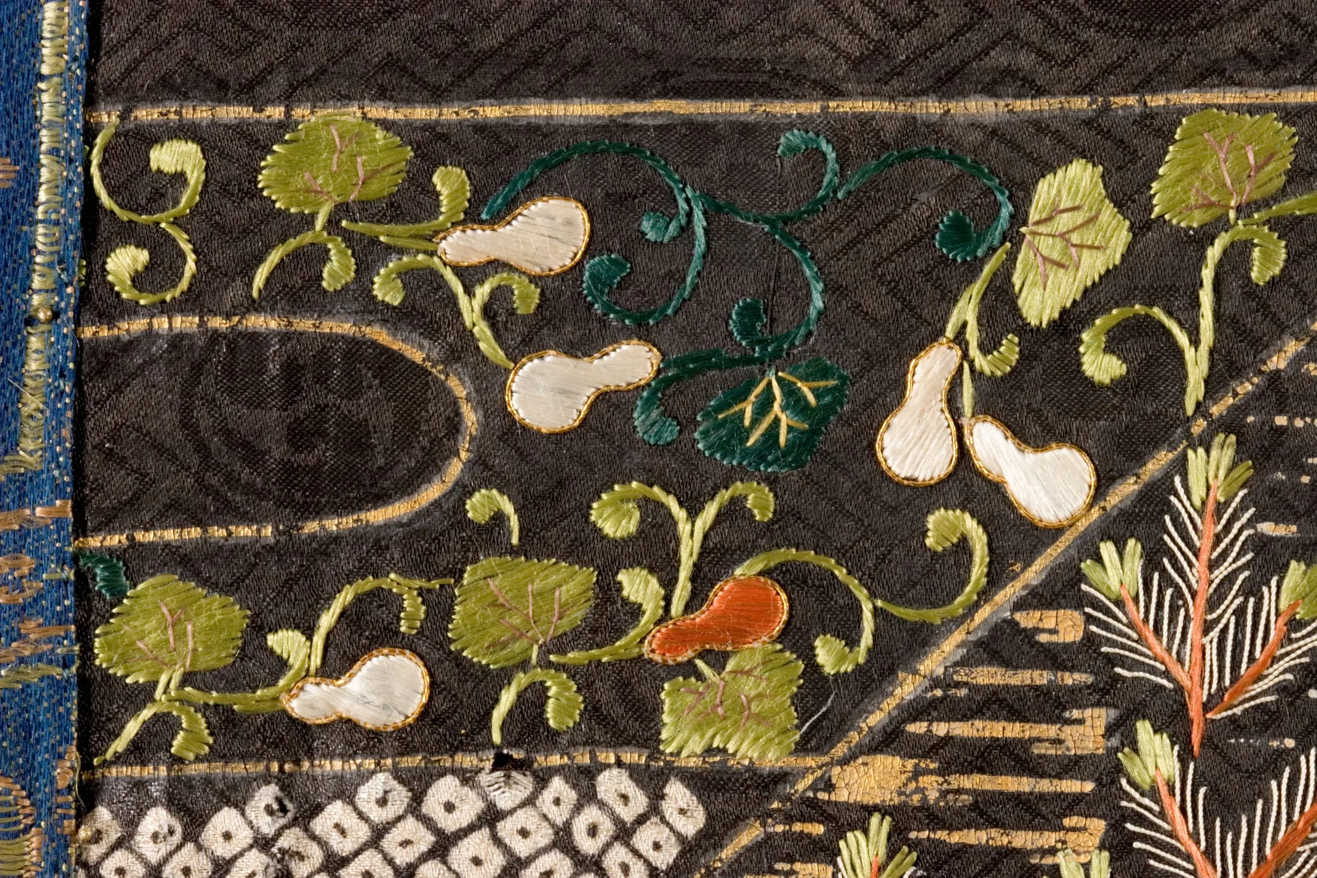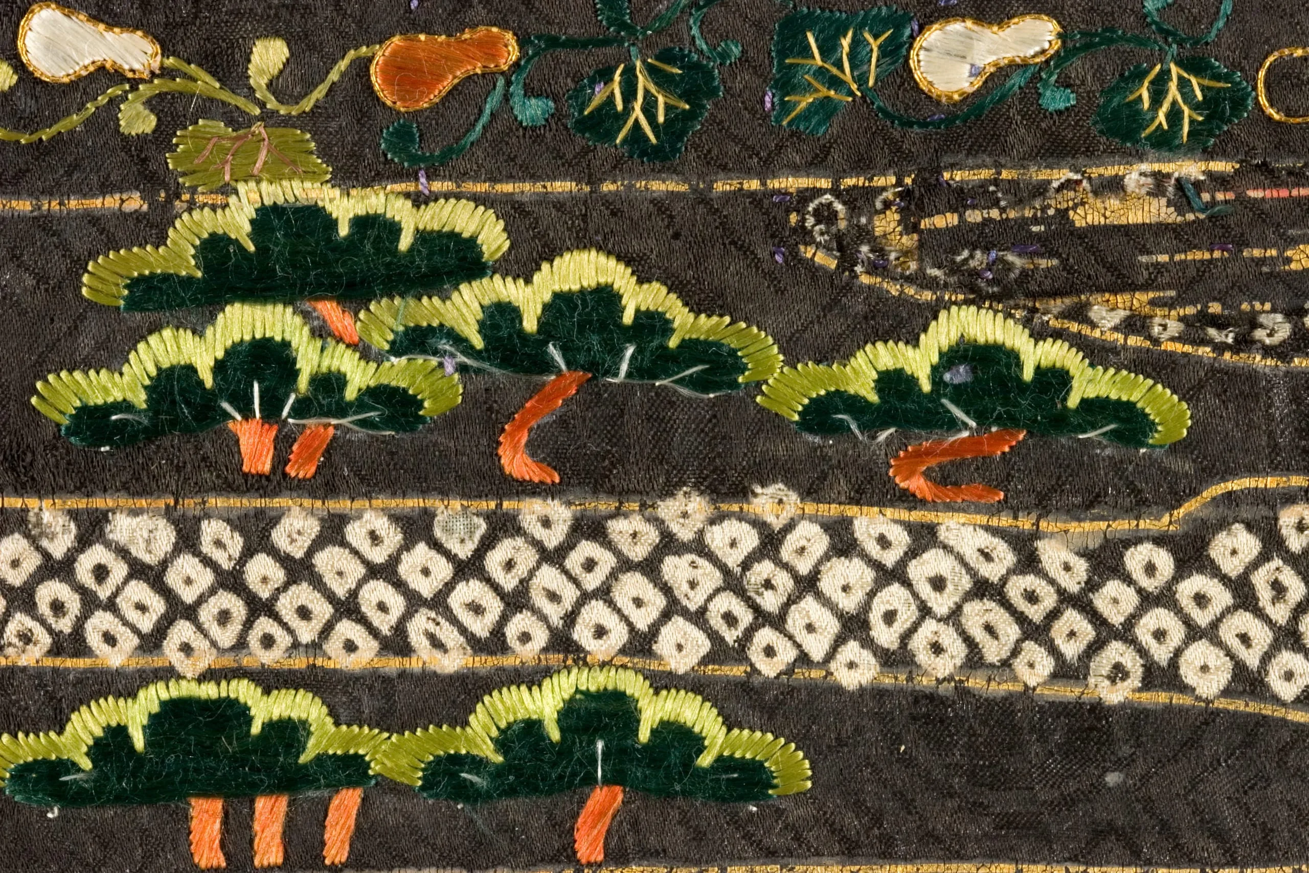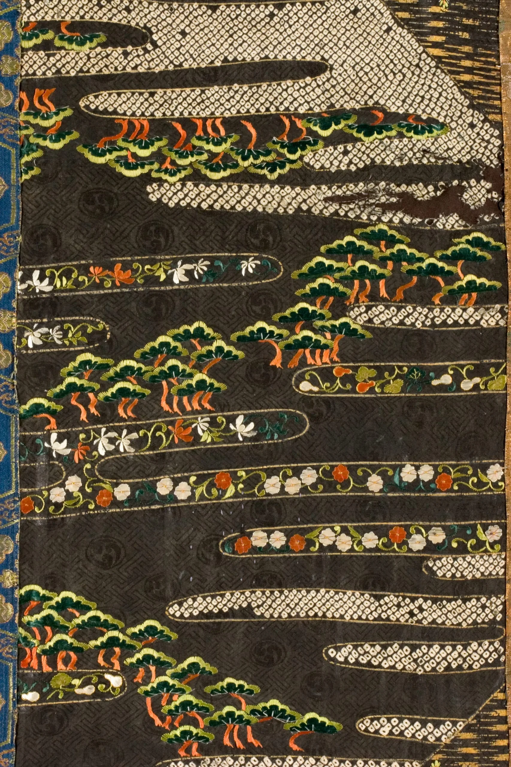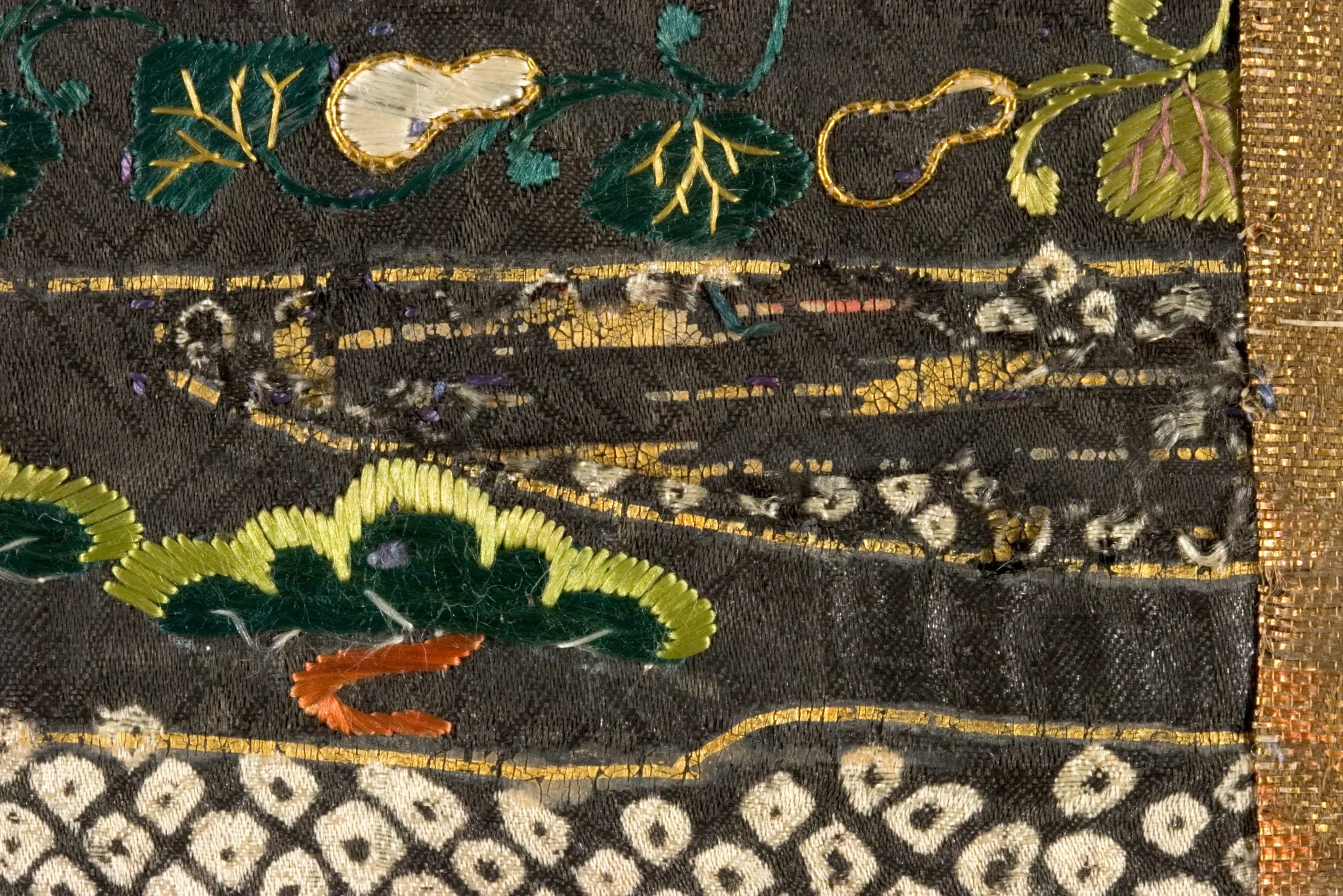 The way in which this rare, early 17th-century kimono came to be an integral part of a sacred garment can be explained by the tradition of donating a woman's most beloved kimono (along with prayers for the repose of her soul) to a temple at the time of her death. Her robe would later be taken apart, cut into pieces, and re-sewn into ritual textiles such as altar cloths and banners or religious clothing such as kesa. Simple in its typically rectangular shape, kesa are composed of contrasting pieces of donated cloth sewn together in a pre-determined symbolic layout. This prescribed arrangement of cloth is believed to have evolved from the Buddha instructing a disciple to create a garment based on the orderly rows of planted rice fields. The assembly of a kesa by monk, nun, priest, disciple or layperson is a meditative act of merit.