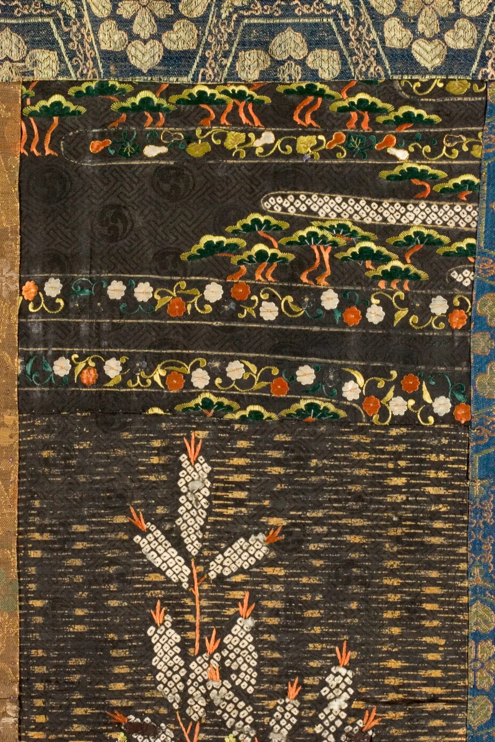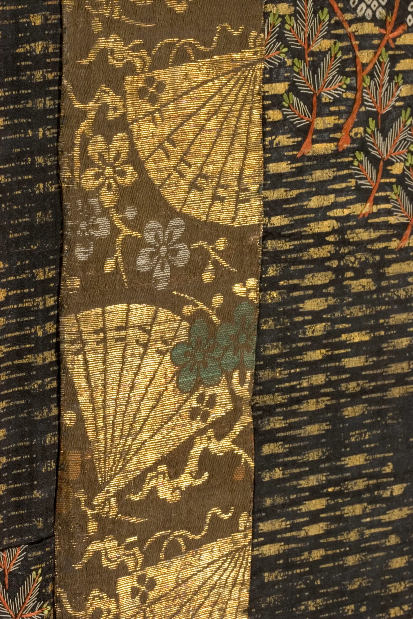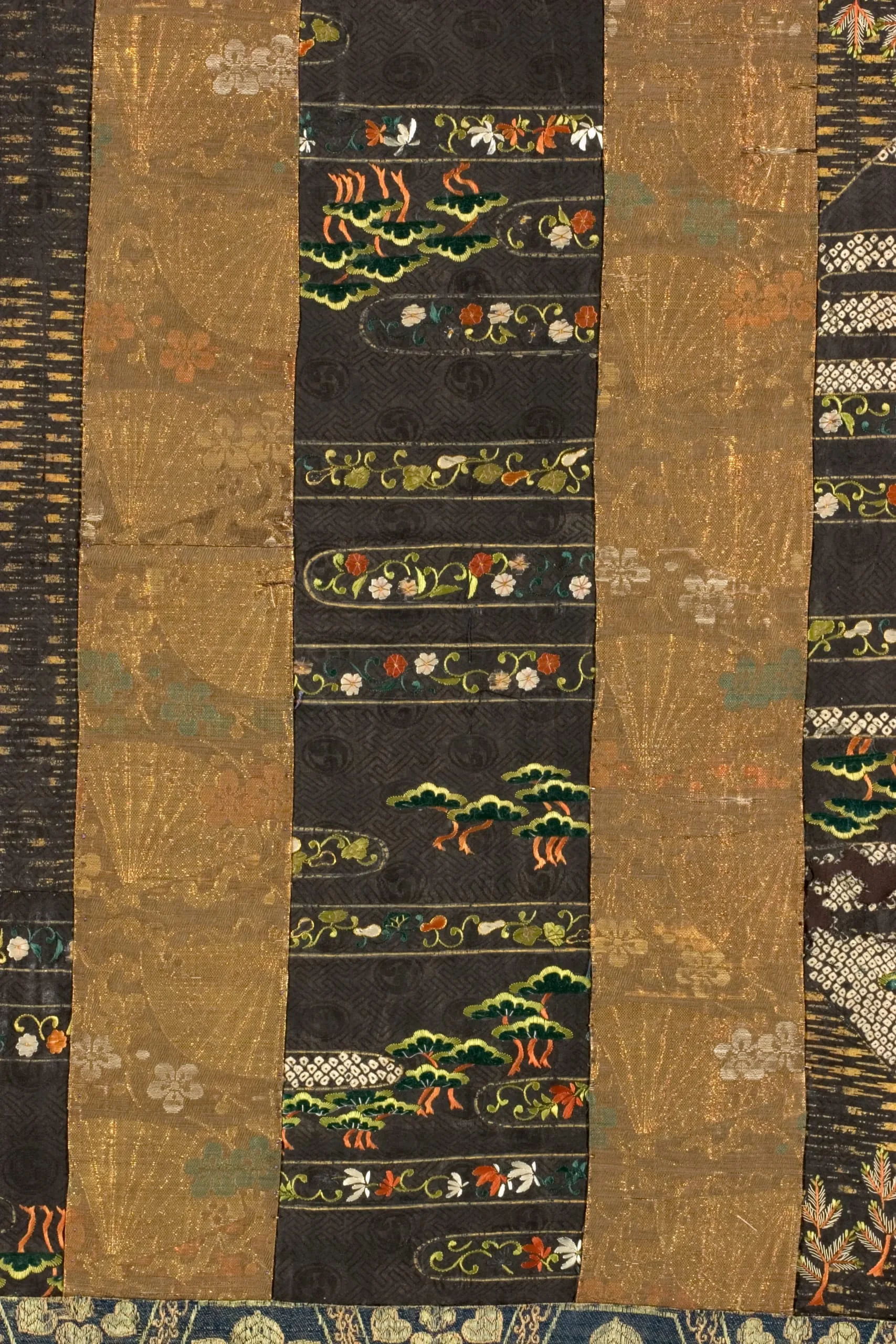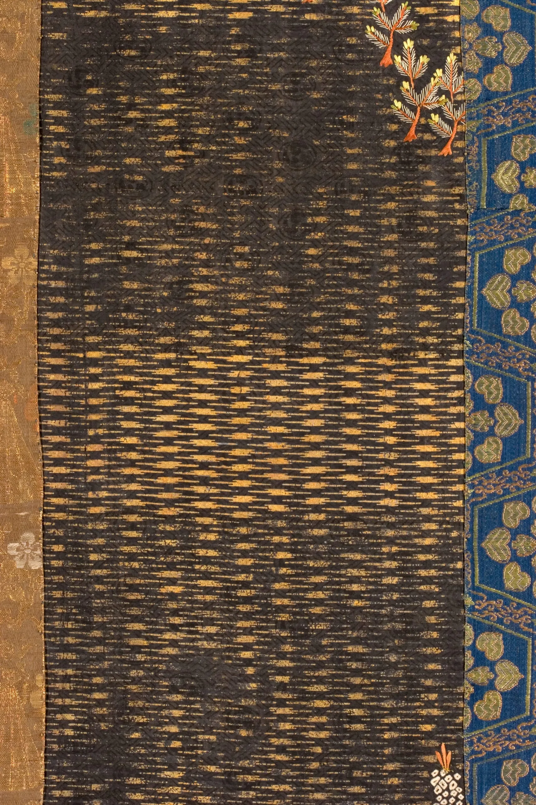 As Buddhism expanded into a major religious institution in Japan, the kesa evolved into a sophisticated and often resplendent garment incorporating expensive cloth of silk and gold. Elegantly embellished lengths of fabric from a high-ranking samurai-class woman's robe are preserved in the Edo period (1615-1868) Buddhist Priest's Mantle (kesa). Characteristic of fashionable Keicho-era (1596-1615) style, the dark brown-black-figured silk satin ground dramatically complements the light, decorated areas, which are defined by clusters of tiny tie-dyed circles, delicate motifs rendered in fine silk and metallic thread embroidery, and an overall repeat mist pattern in gold-foil. Extremely expensive even in its day, only a handful of Keicho-style kimono exist in Japanese national museum collections today.