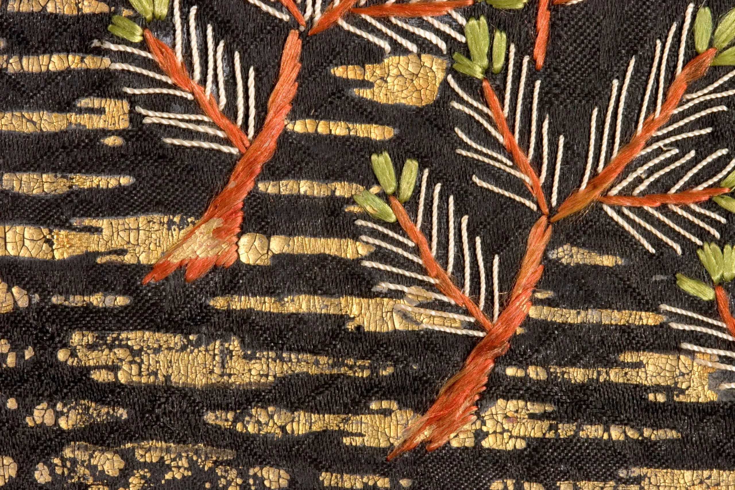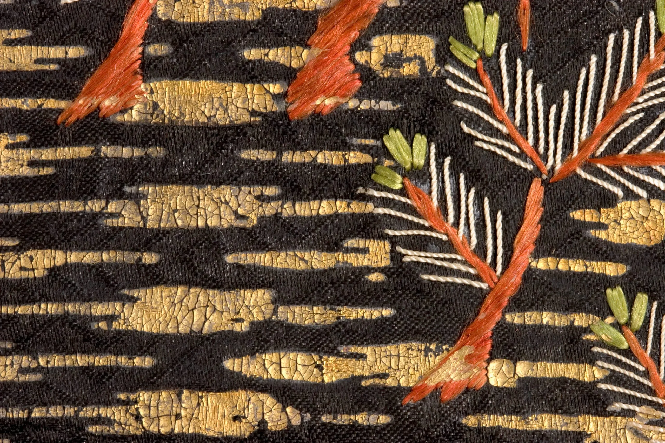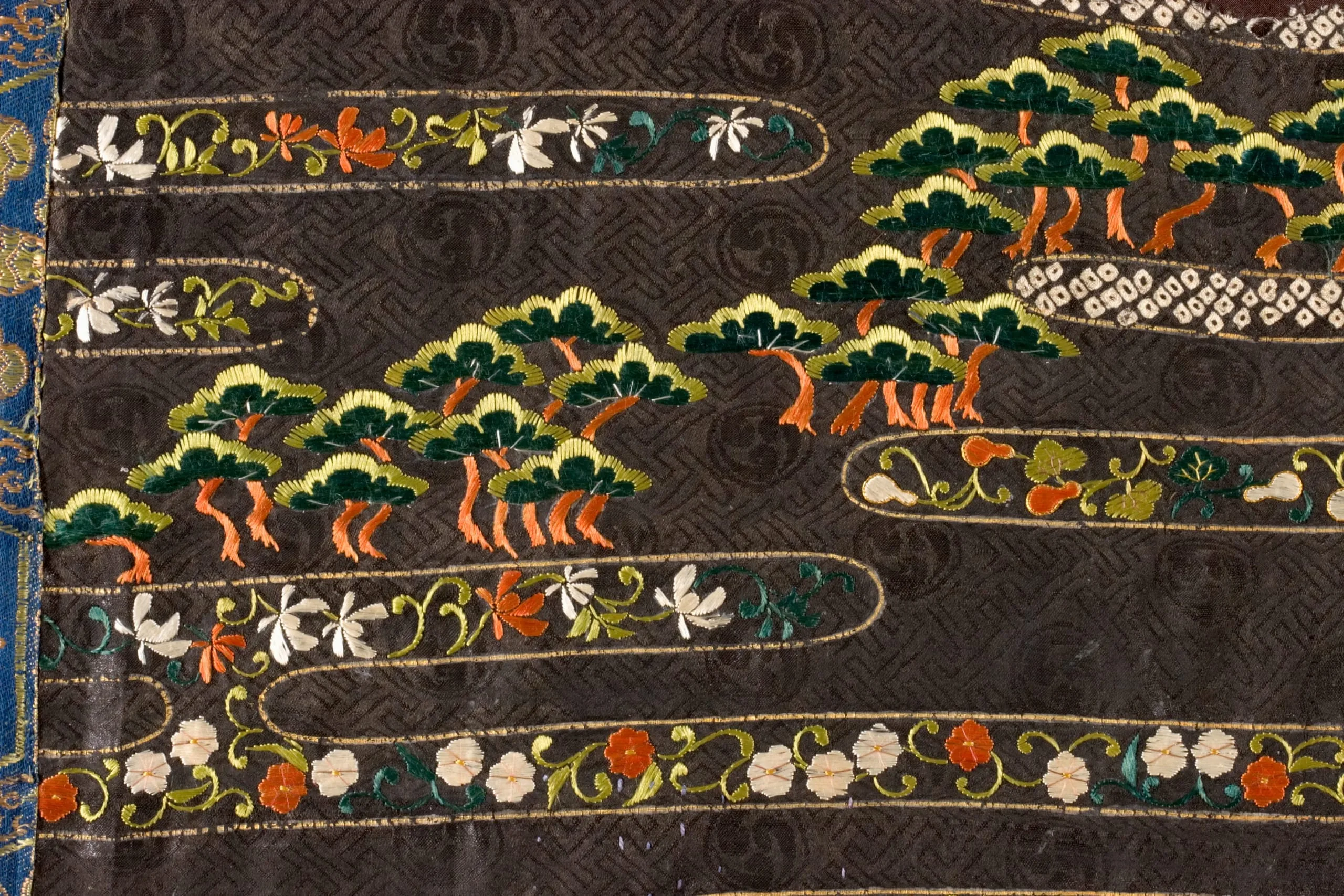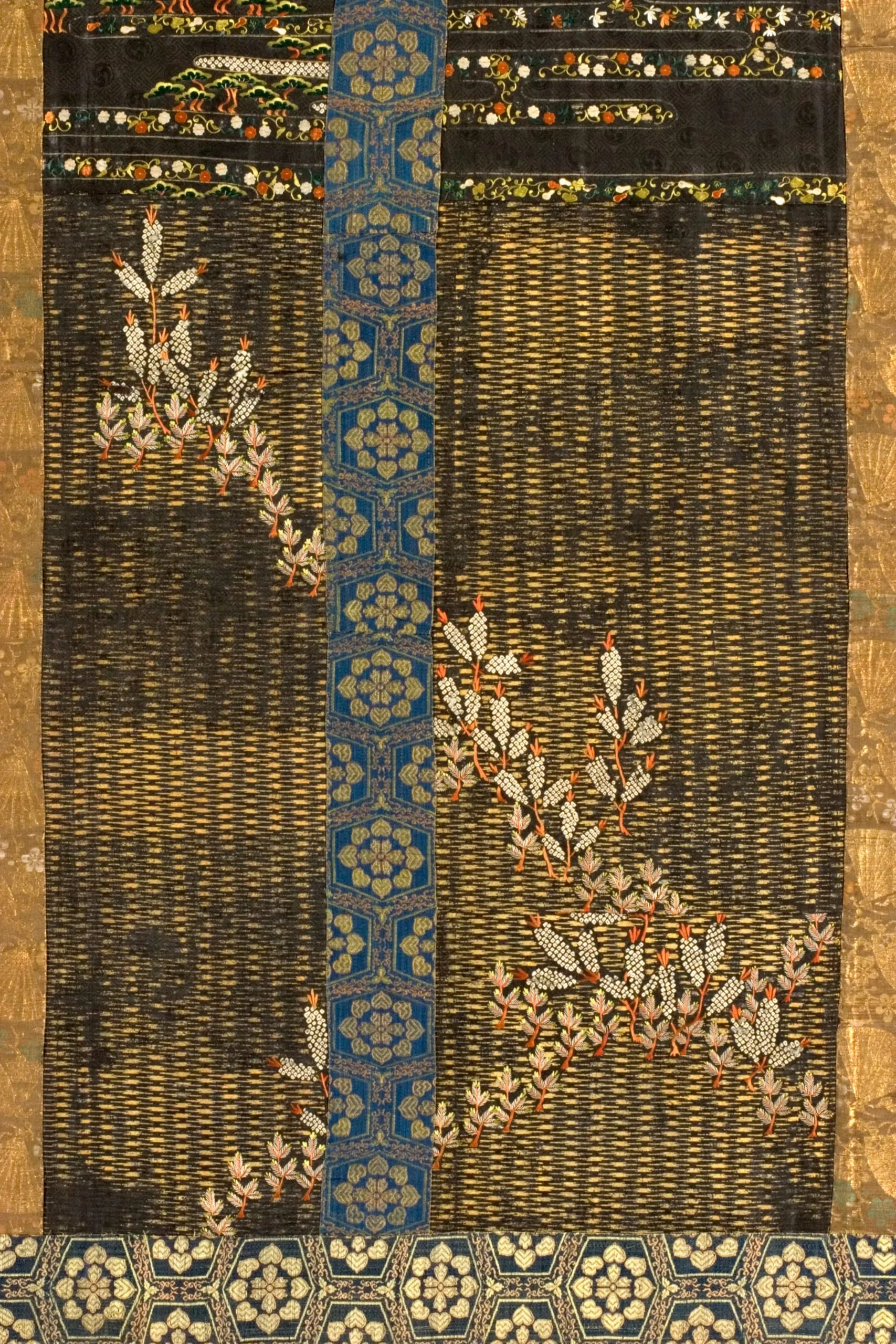 As Buddhism expanded into a major religious institution in Japan, the kesa evolved into a sophisticated and often resplendent garment incorporating expensive cloth of silk and gold. Elegantly embellished lengths of fabric from a high-ranking samurai-class woman's robe are preserved in the Edo period (1615-1868) Buddhist Priest's Mantle (kesa). Characteristic of fashionable Keicho-era (1596-1615) style, the dark brown-black-figured silk satin ground dramatically complements the light, decorated areas, which are defined by clusters of tiny tie-dyed circles, delicate motifs rendered in fine silk and metallic thread embroidery, and an overall repeat mist pattern in gold-foil. Extremely expensive even in its day, only a handful of Keicho-style kimono exist in Japanese national museum collections today.