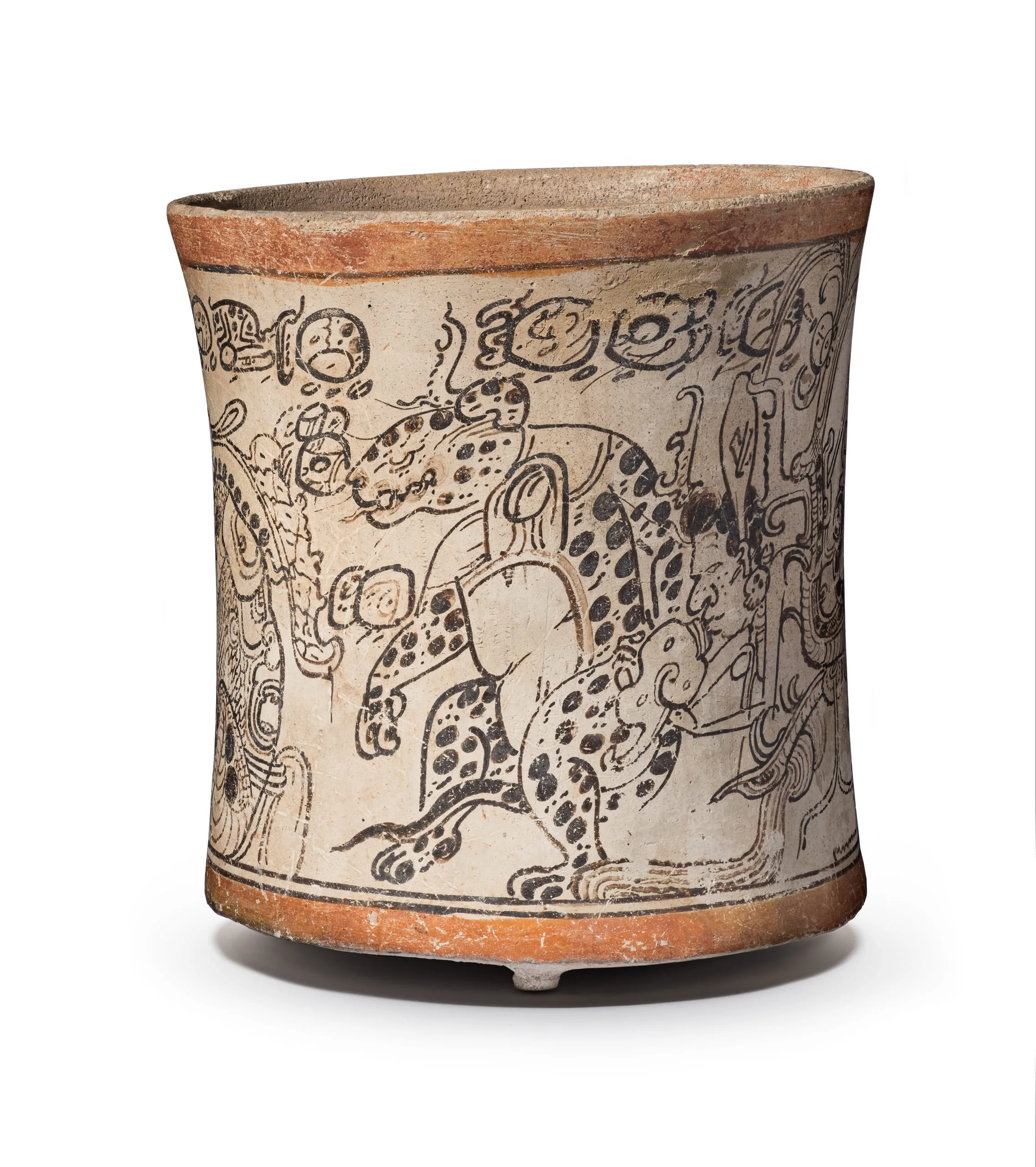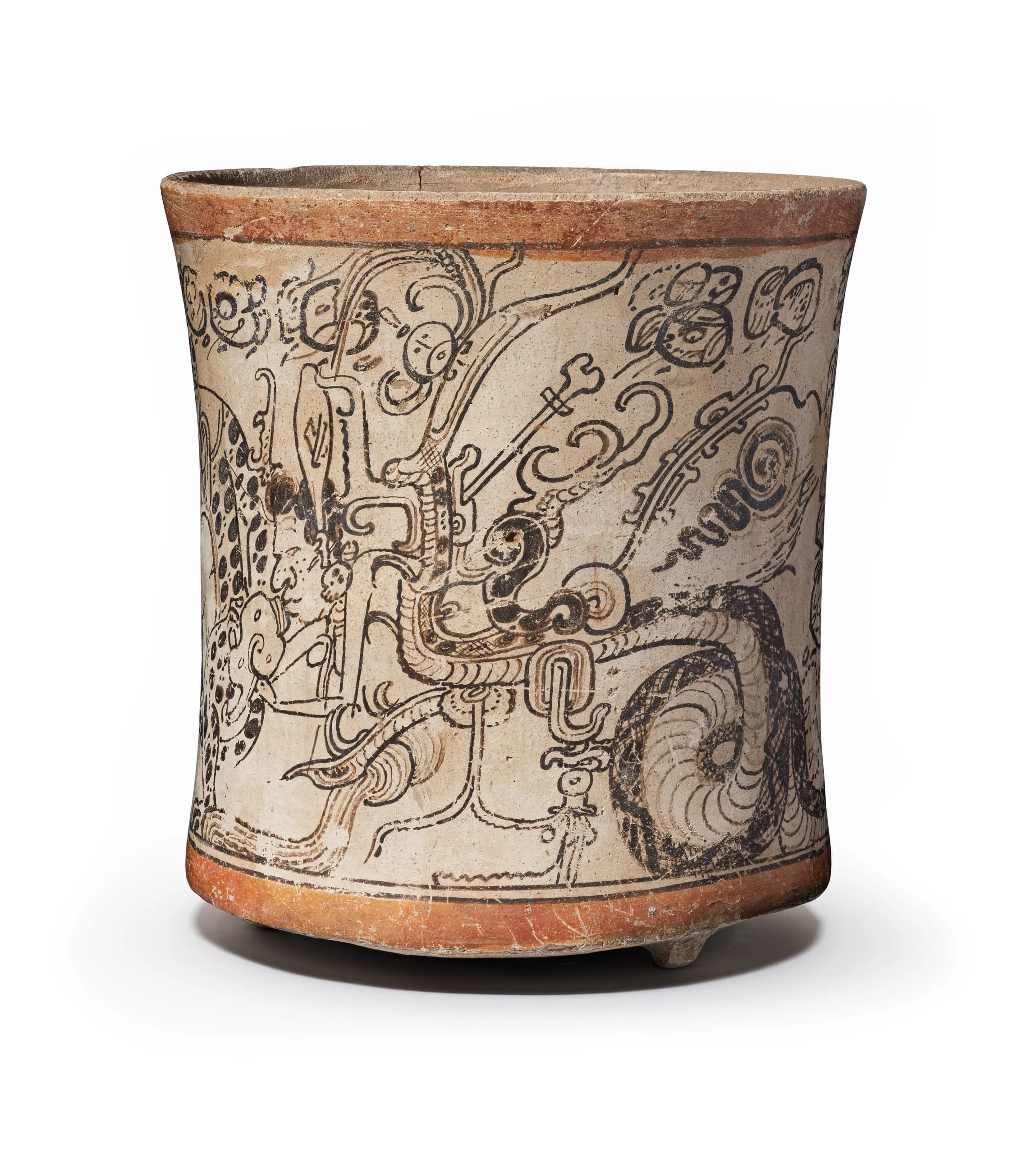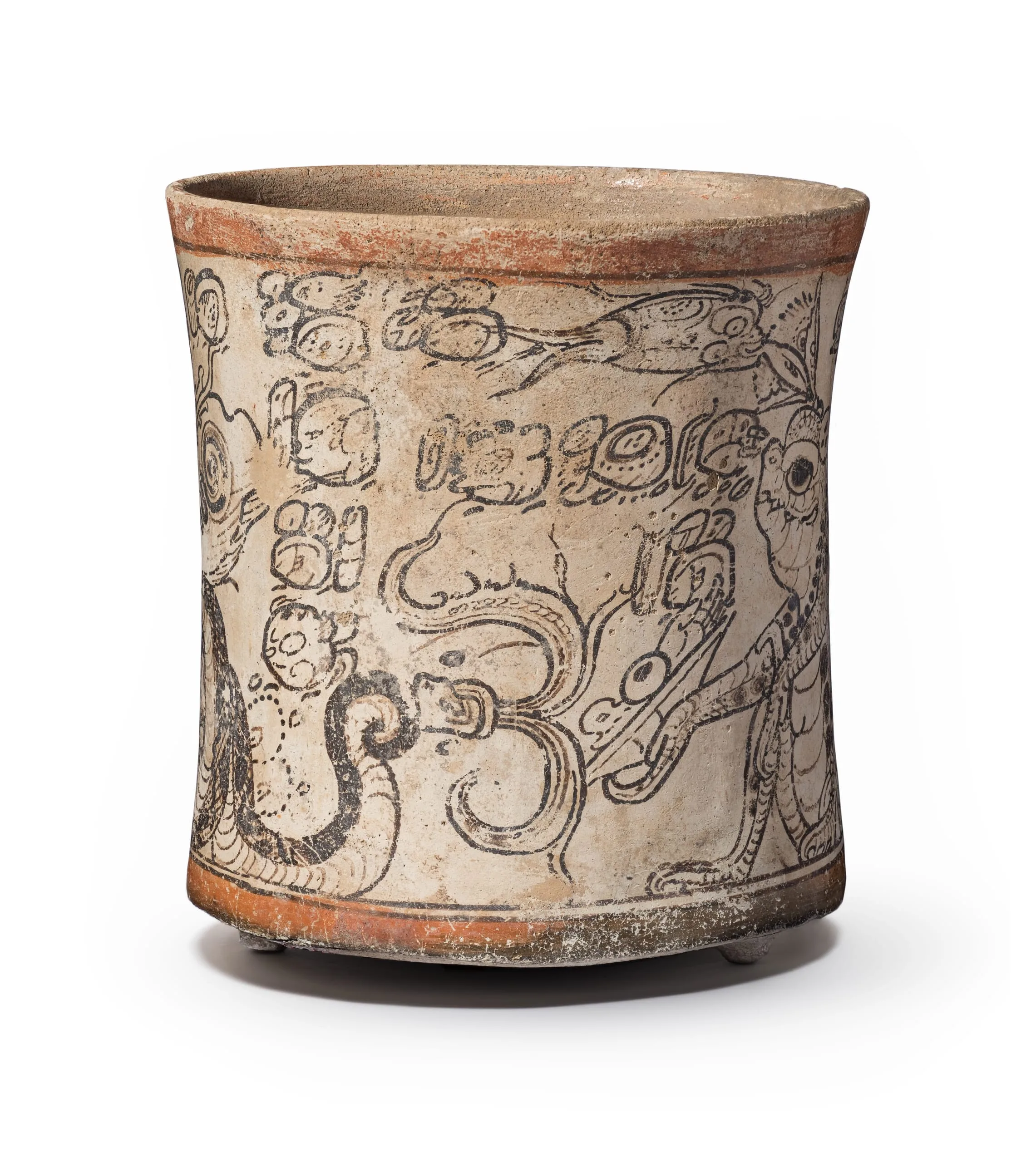 Elegantly painted ceramic vessels constituted the premier form of artistic expression during the Late Classic period (550-850 AD) of ancient Maya civilization, and none were more beautifully painted than those known as codex style. Named for their resemblance to the Maya codices, or painted books, codex style ceramics such as this Drinking Vessel depict highly esoteric scenes describing the fundamental concepts of Maya religious belief and practice and the special role of kings as participants in the supernatural realm. These concepts are embedded within a layered matrix of complex imagery and hieroglyphic writing that describe the ritual actions of rulers, who engaged with ancestors and supernatural beings in order to maintain the delicate balance of the cosmos.