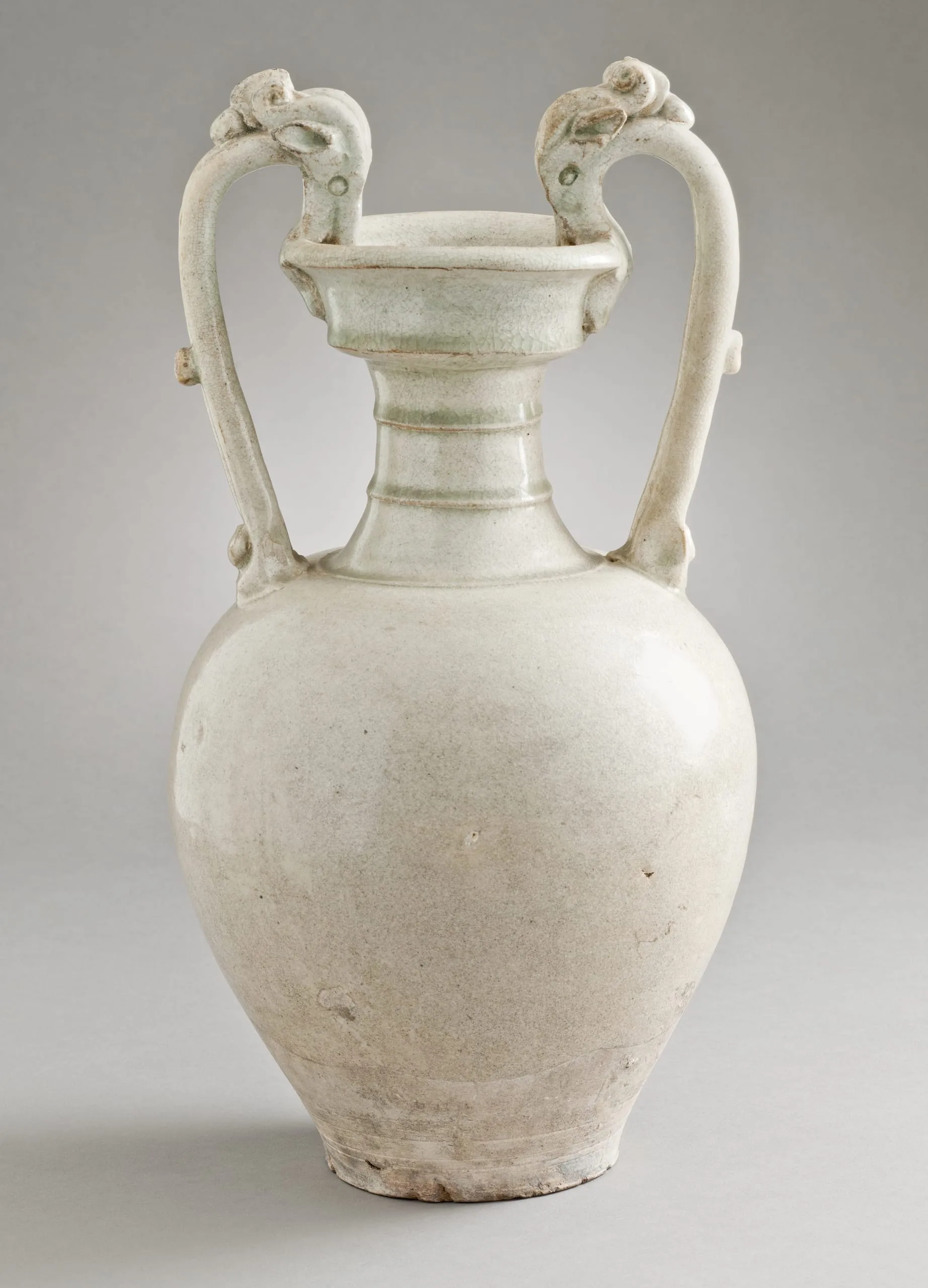 - Wheel-thrown stoneware with modeled and applied decoration and pale green glaze