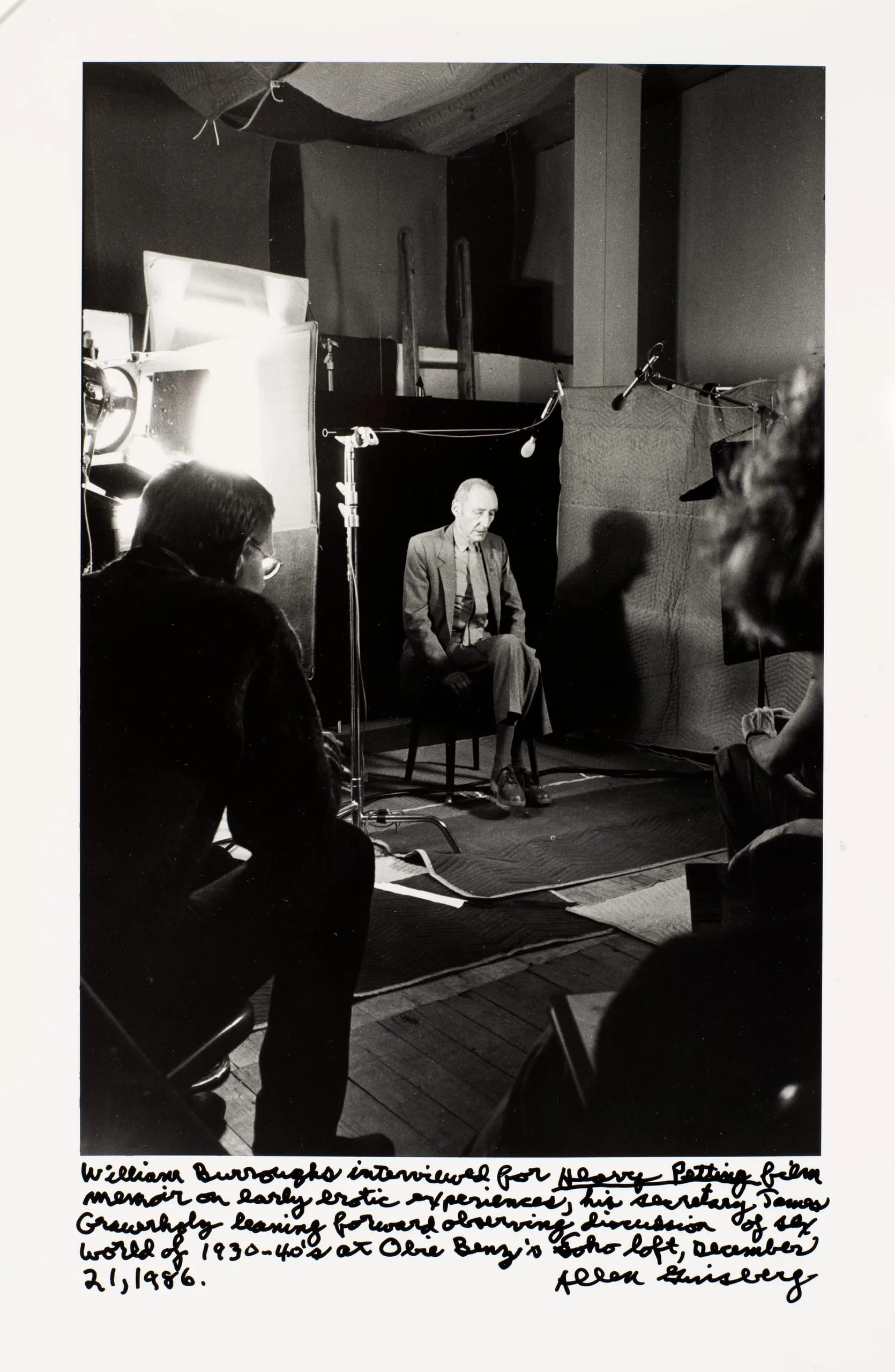 - William Burroughs, film interview Soho, New York, December 21, 1986, secretary Jim Grauerholz leaning forward observing discussion of world of 1940s, memoirs