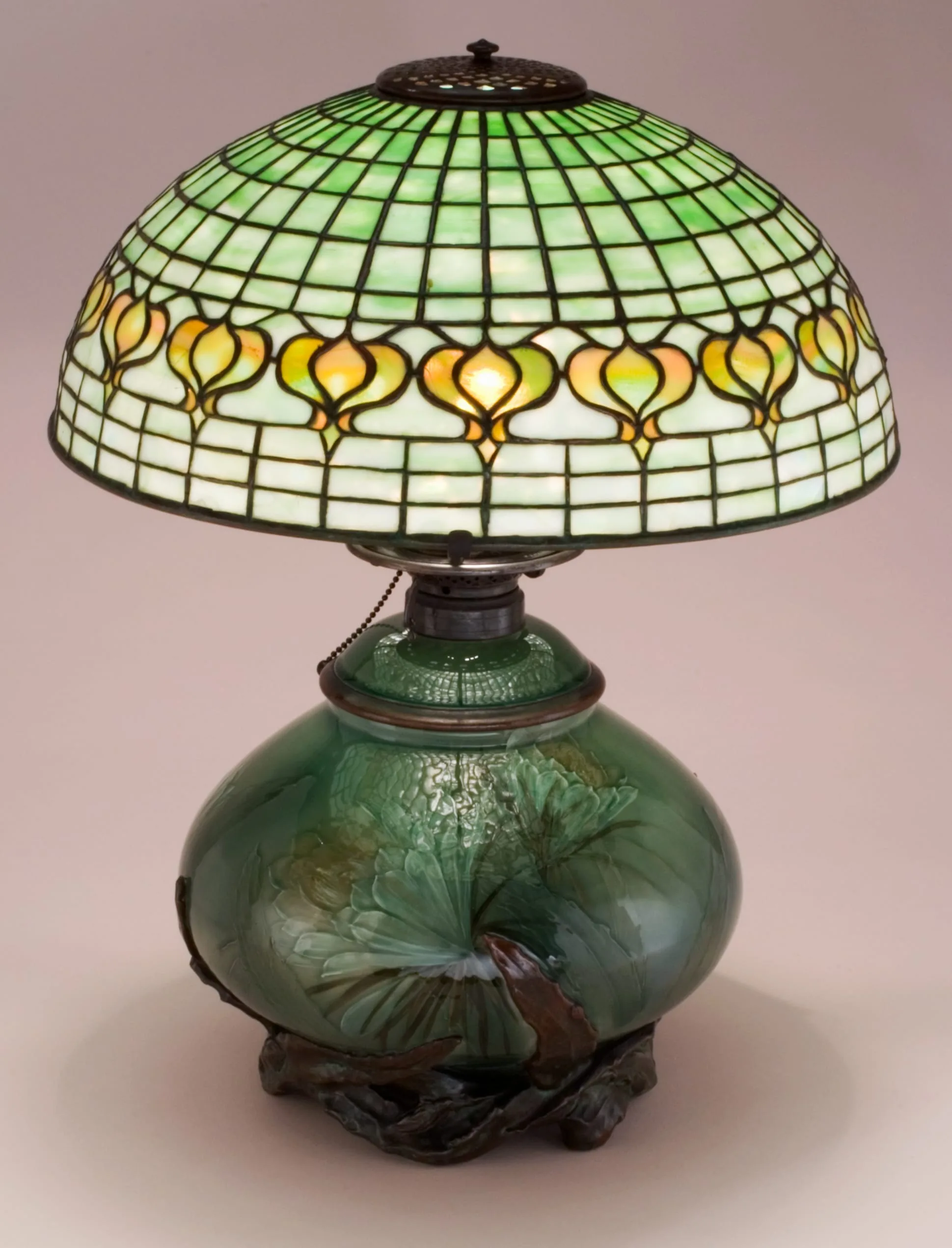 - Glazed earthenware with copper electrodeposit; "Pomegranate" leaded glass shade, and bronze fittings