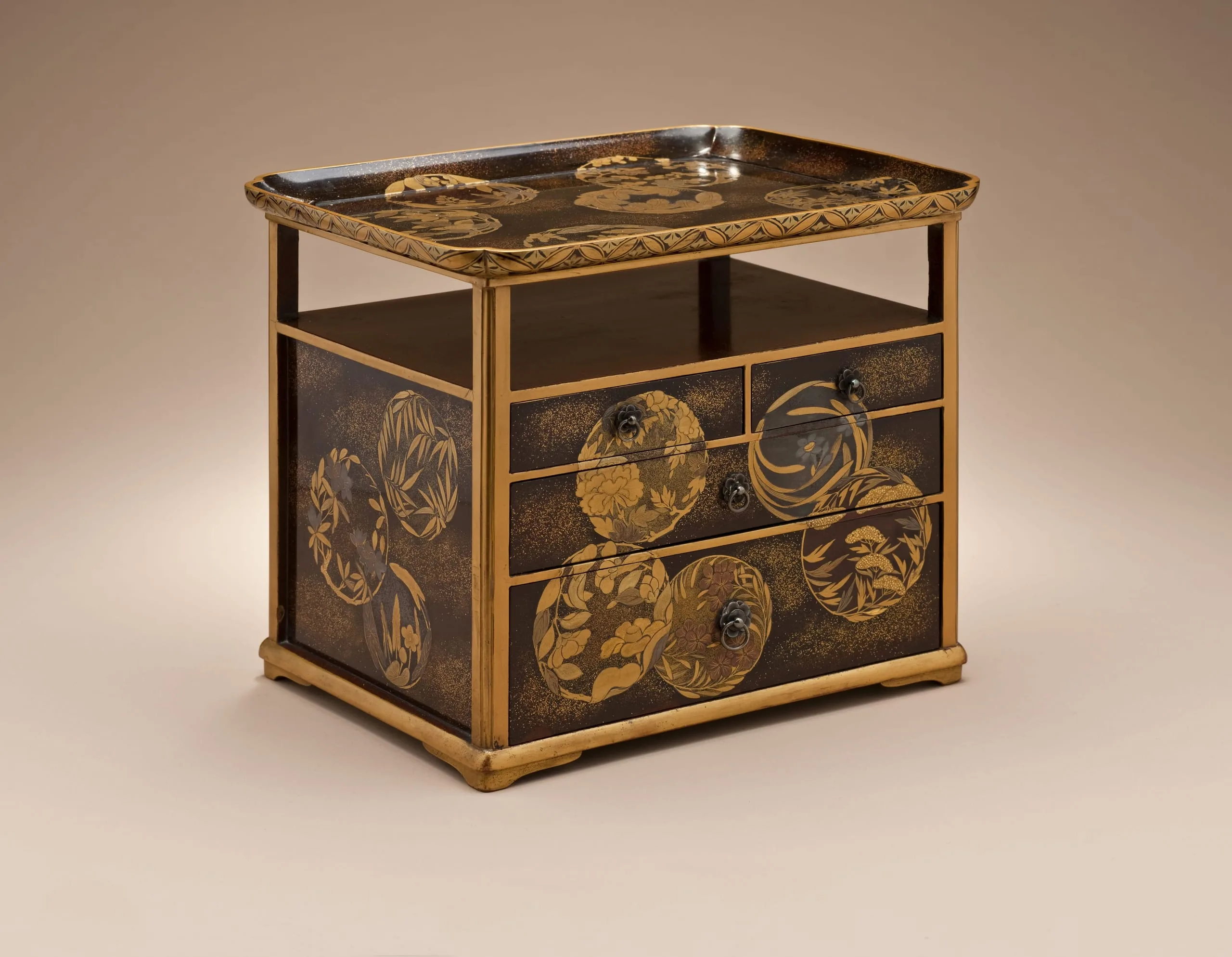 - Lacquer with gold-sprinkled design (maki-e) and metal fittings