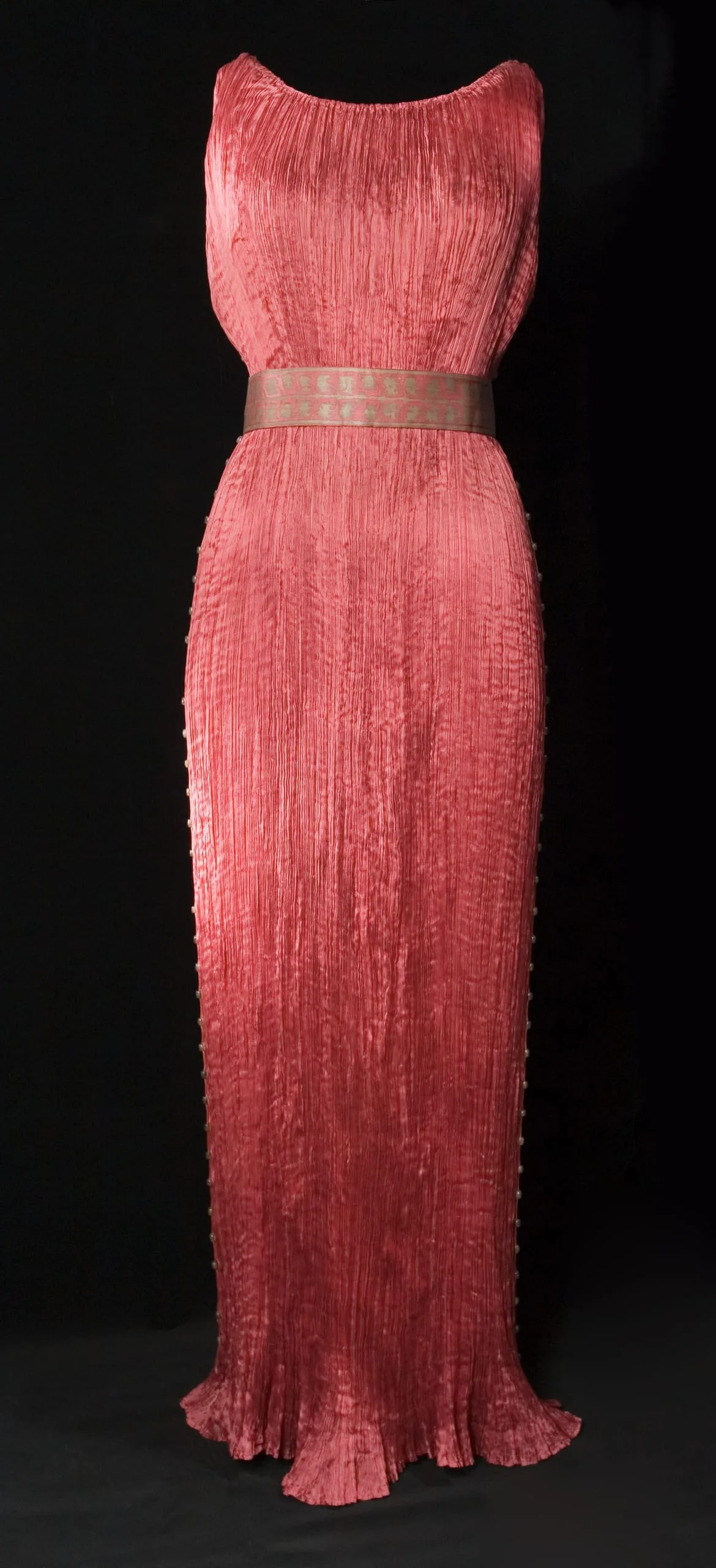 - Dress: Silk plain weave, pleated, with silk cord and glass beads. Belt: Silk plain weave, printed.