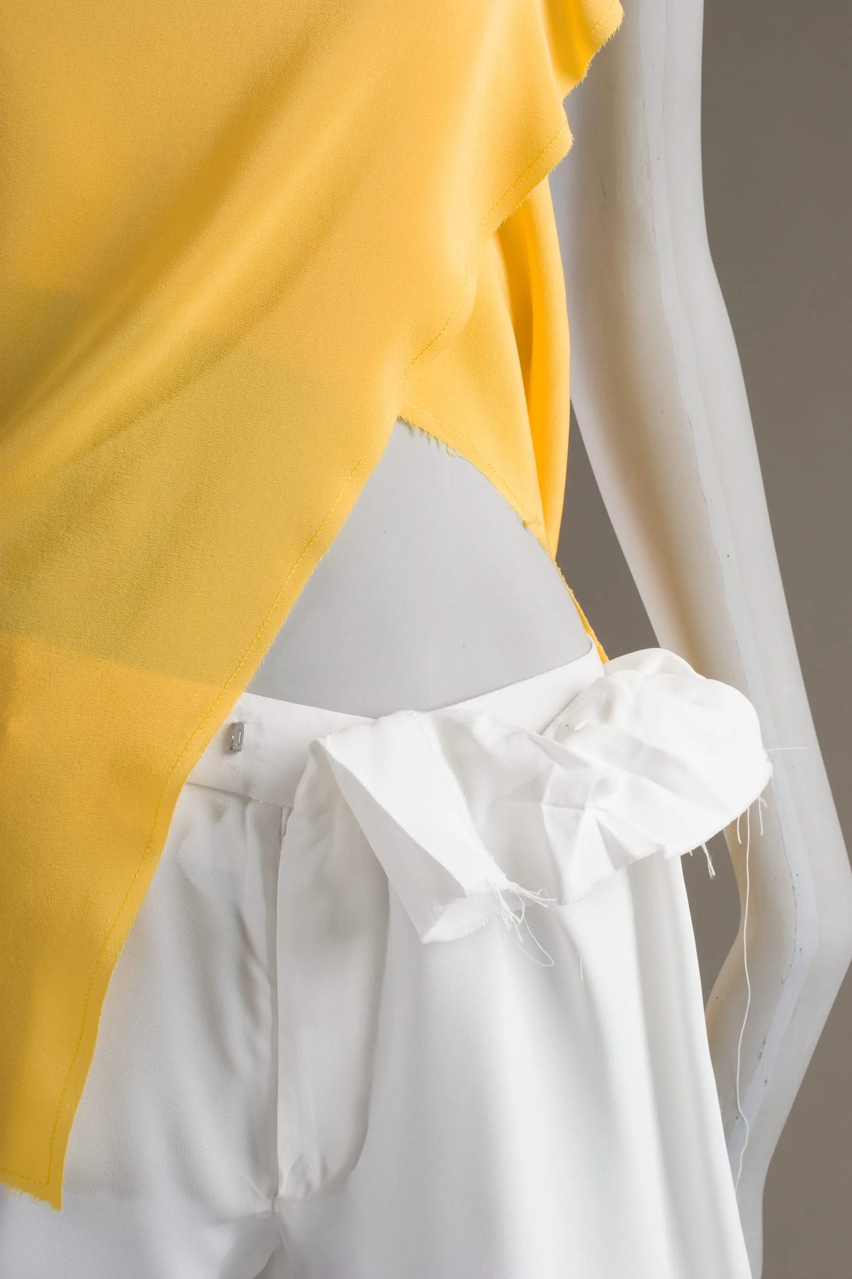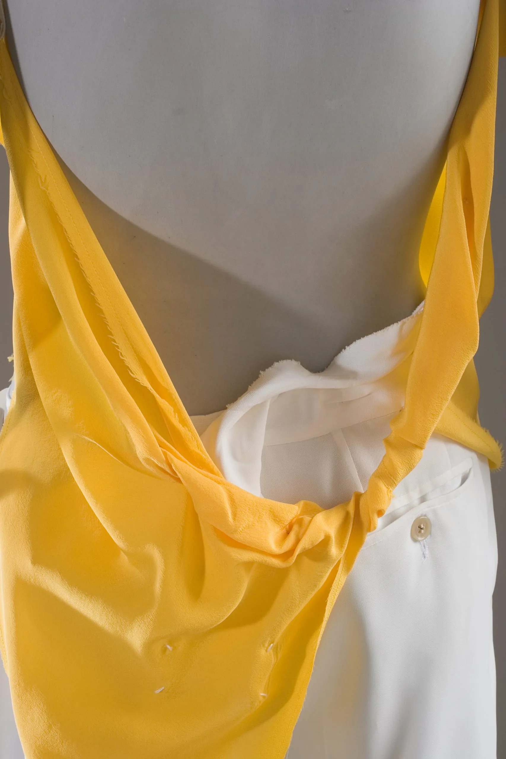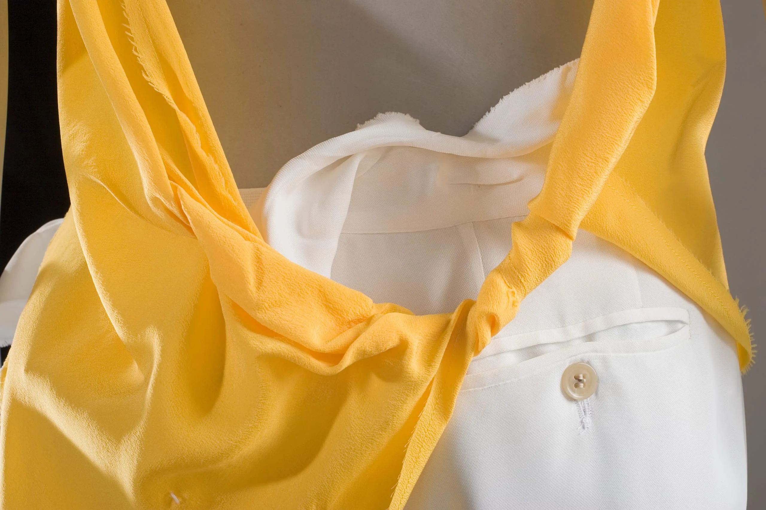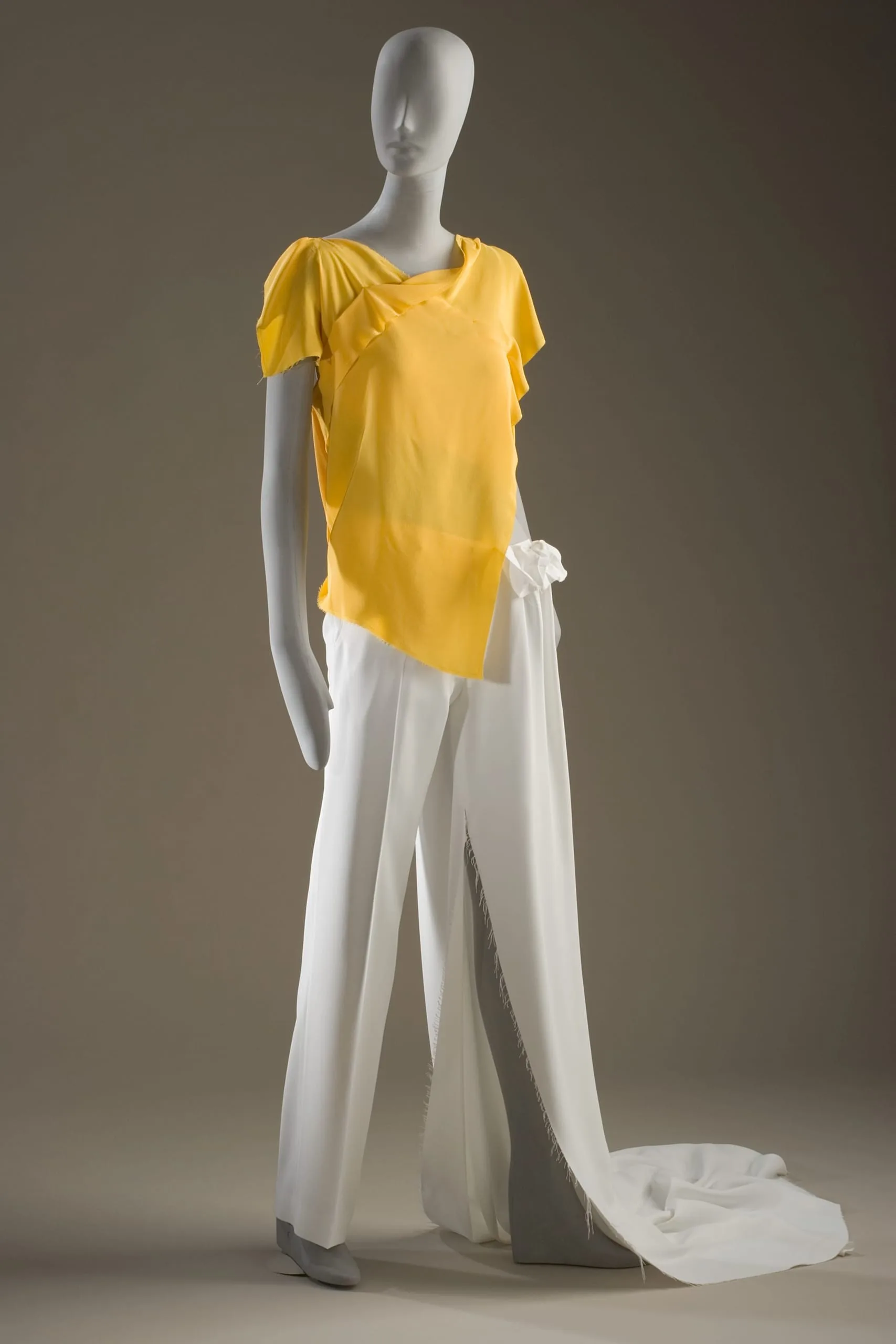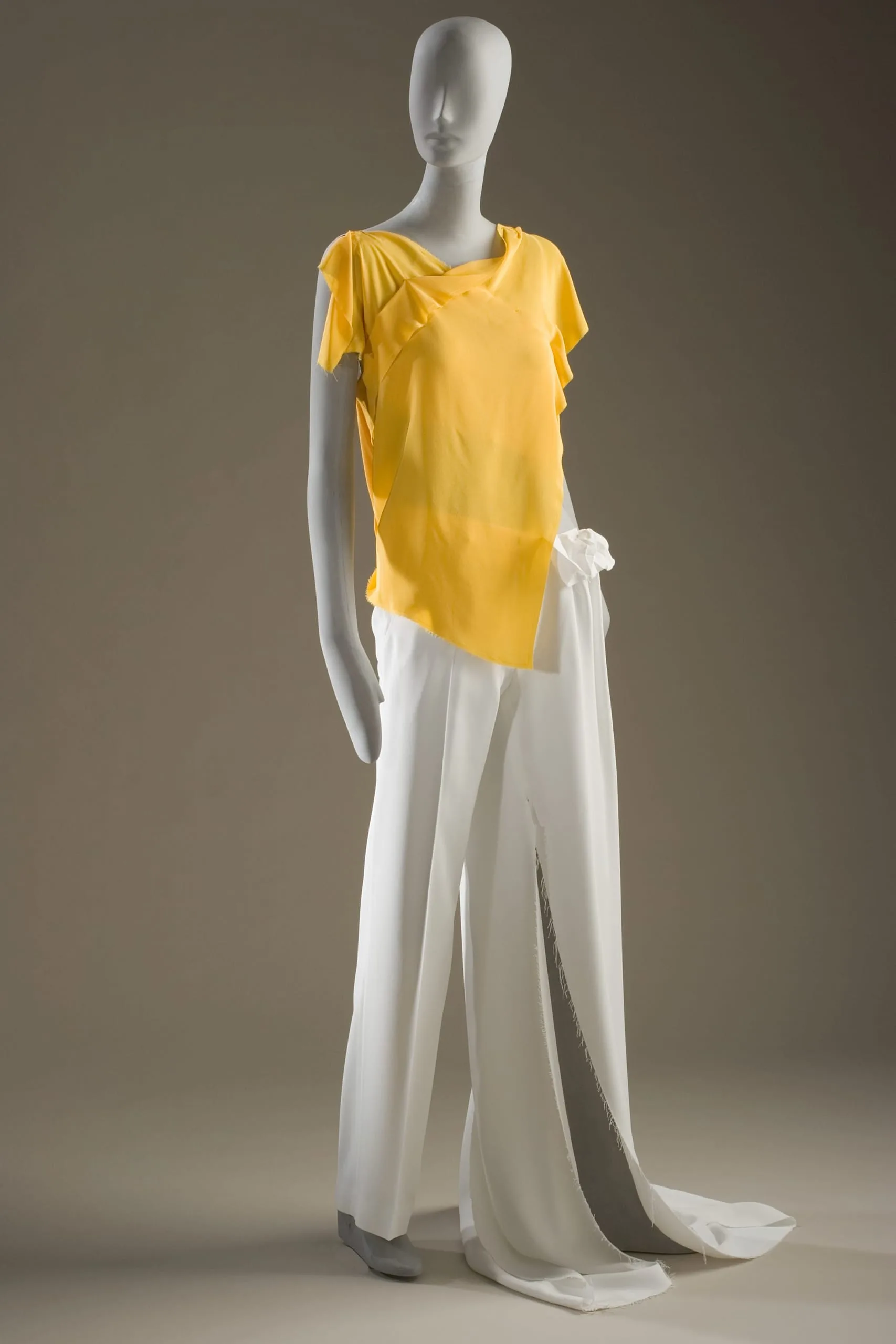 - Blouse: silk plain weave (crepe), elastic; Pants: polyester plain weave