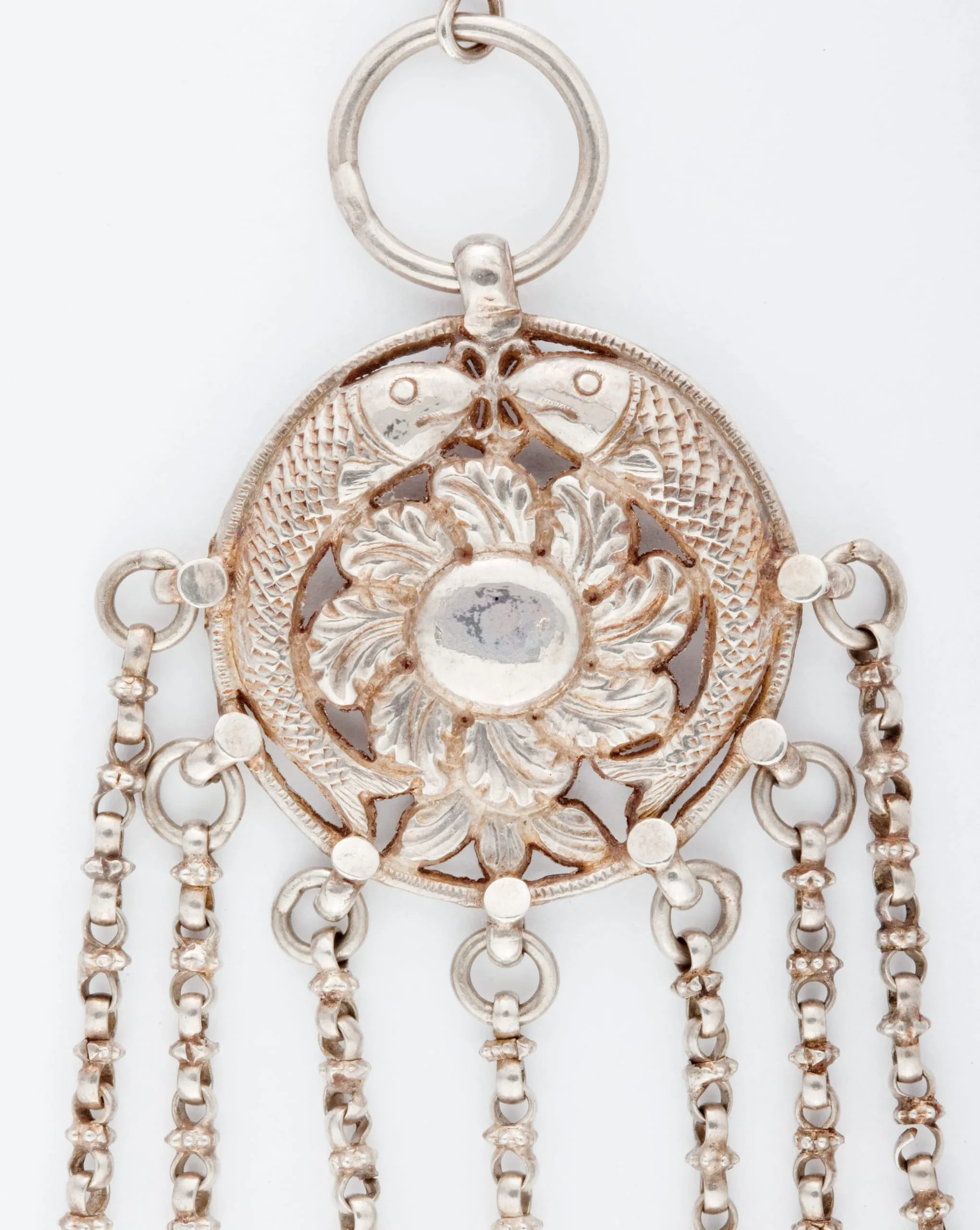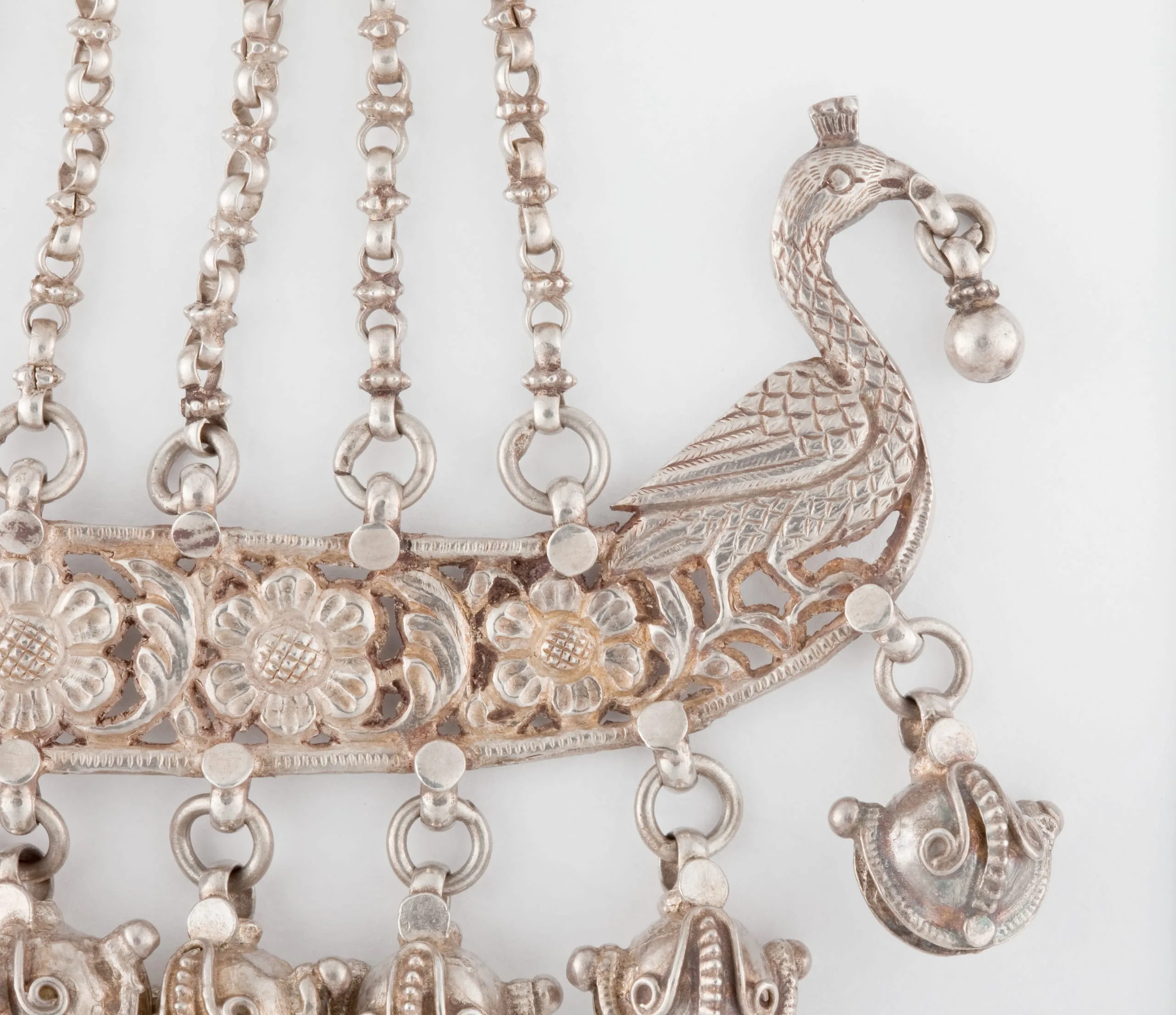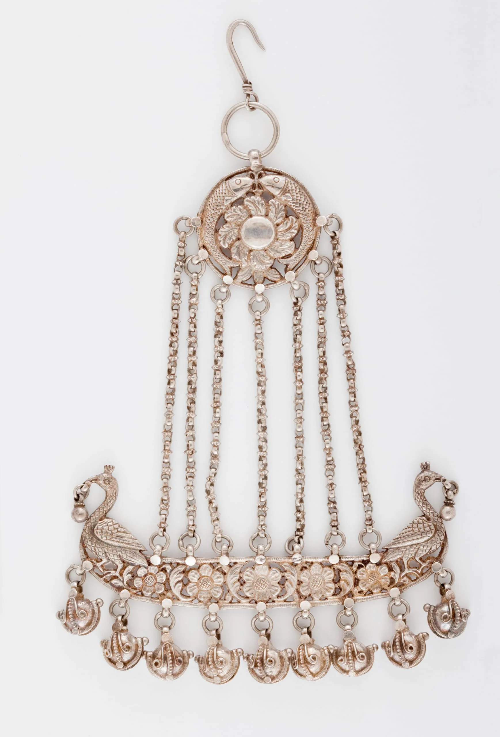 This woman's silver head ornament is called a jhumar (chandelier), which is typically worn on the left side of the head by Muslim brides, noble women, or court dancers. The top medallion is adorned with a symbolic pair of fish, arranged head-to-head with their curved bodies forming a circle. The fish surround a foliate blossom, which is echoed by the five flowers and leaf clusters embellishing an openwork pendant in the shape of a royal barge adorned with twin figureheads of peacocks. Silver bells dangle from the barge, which hangs from the medallion by light chains. Known as a peacock barge, this type of royal pleasure boat was used for river outings by the Lucknow and other Mughal governors. The head ornament epitomizes Lucknow jewelry, which is traditionally described as being exceptionally delicate and graceful.