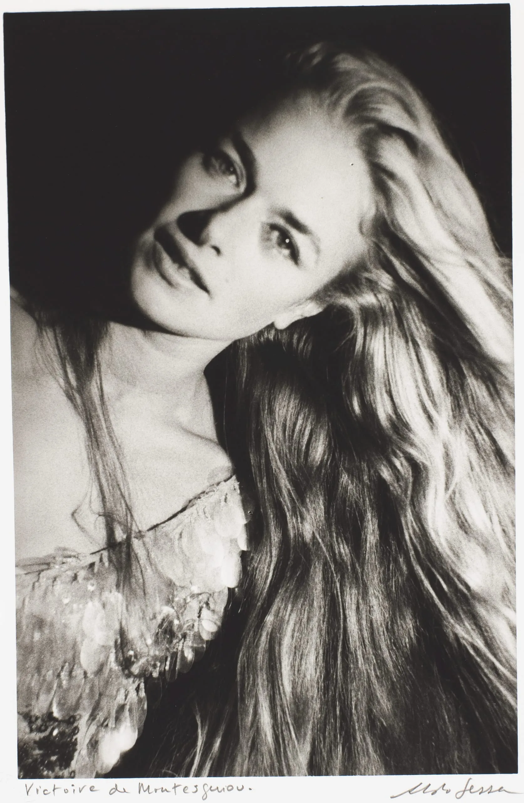 Black and white portrait photograph, woman from the chest up with head tilted back, long wavy blonde hair draped over her shoulder, soft lighting against a dark background