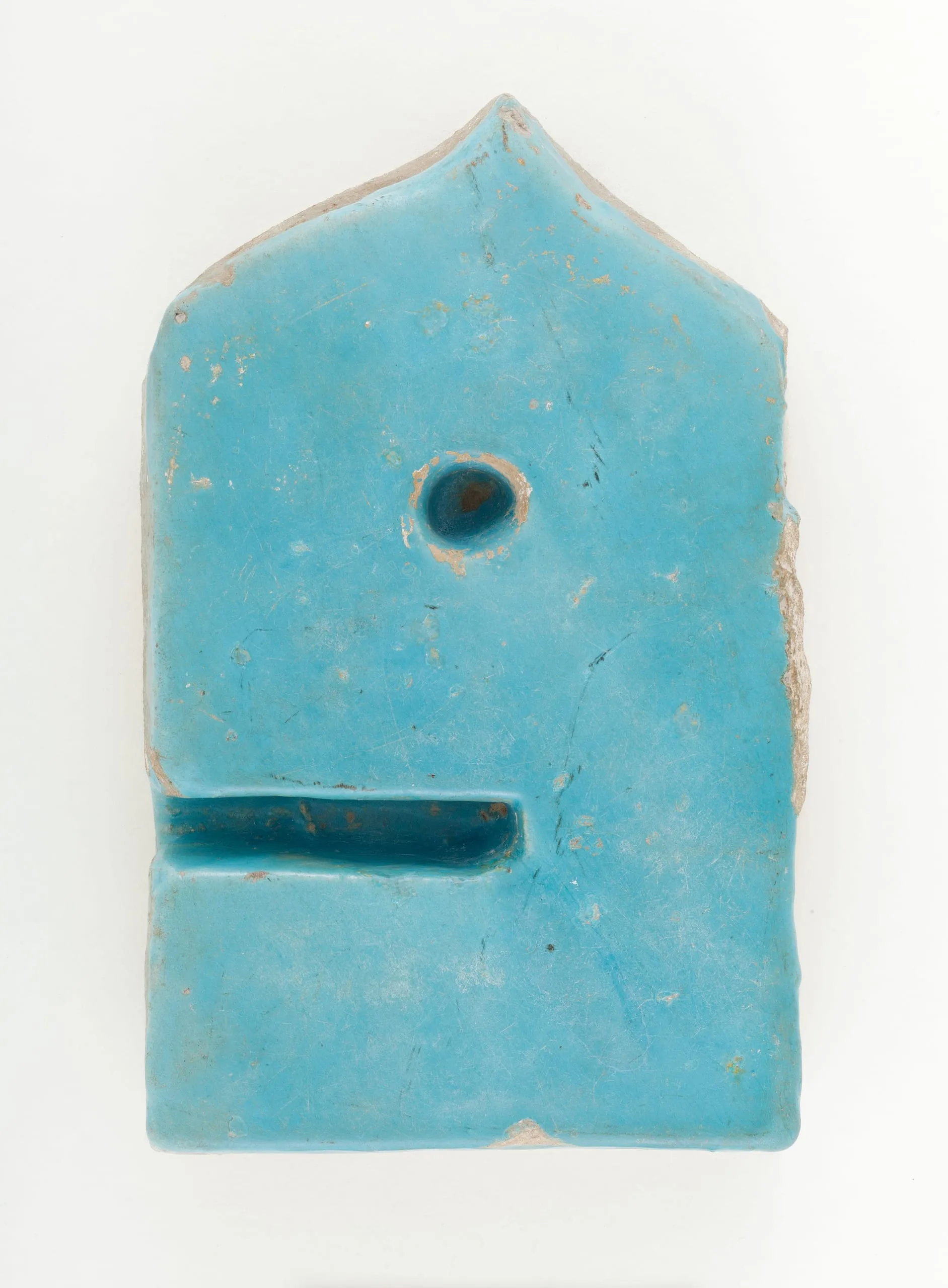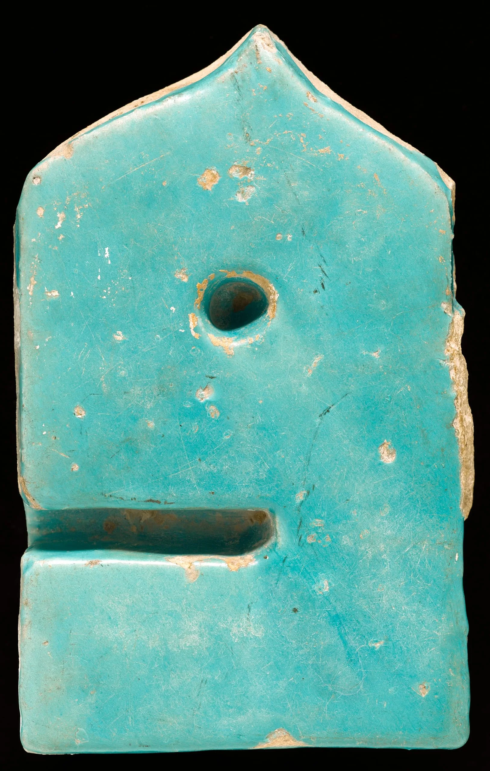 Inscriptions formed from three-dimensional letter-shaped tiles such as this one adorned buildings in Iran and Central Asia in the twelfth and thirteenth centuries. This striking turquoise-glazed tile is the letter waw, which is both a consonant (W) and vowel (ū) in Arabic (the former pronounced as V in Persian). It is impossible to reconstruct the original text from this single tile, but such inscriptions typically included blessings and information about the building’s commissioner.