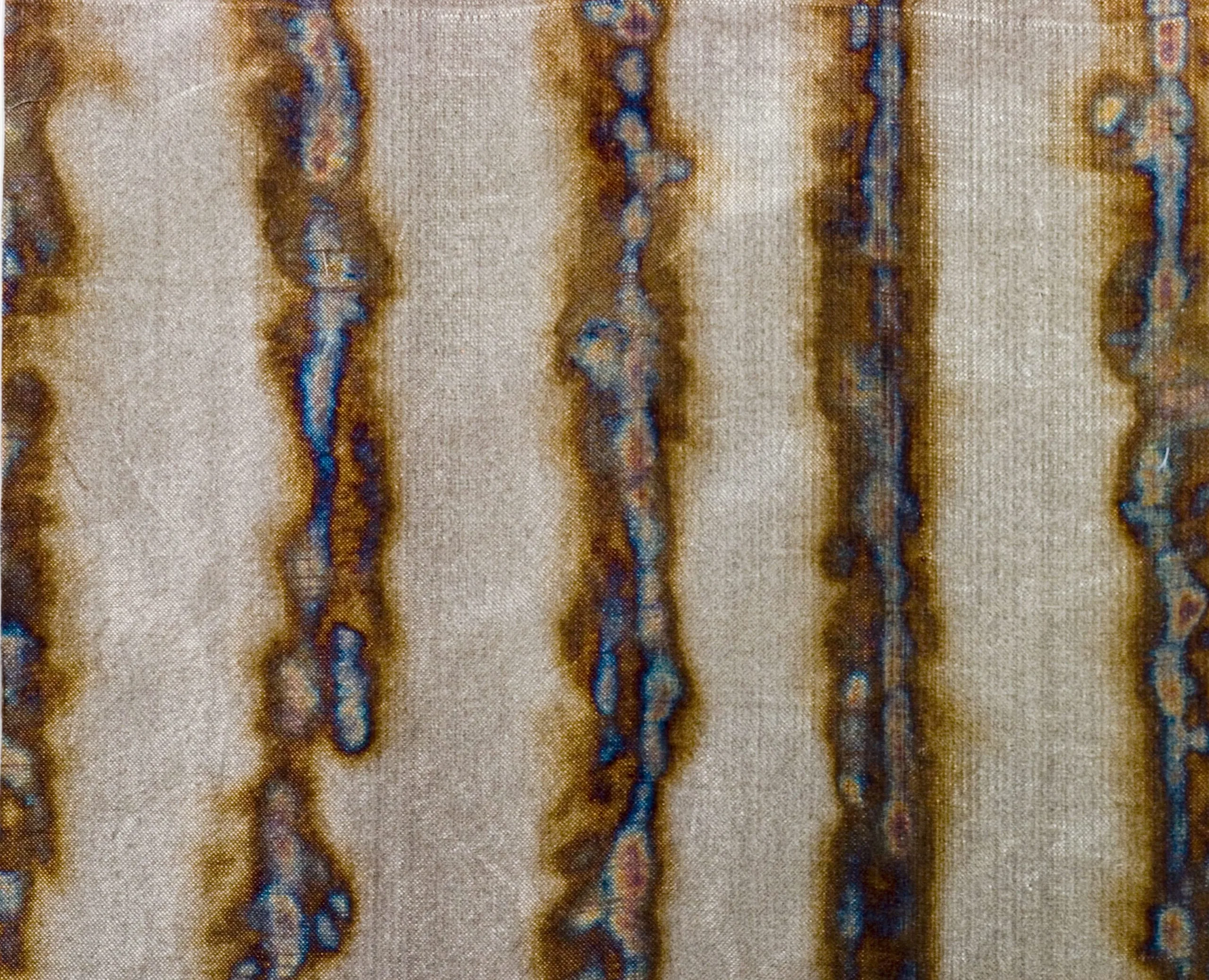 - Stainless-steel (iron, nickel, and chrome) microfiber plain weave bonded to cotton twill with acrylic adhesive, hand torched with gas flames (burner dye)