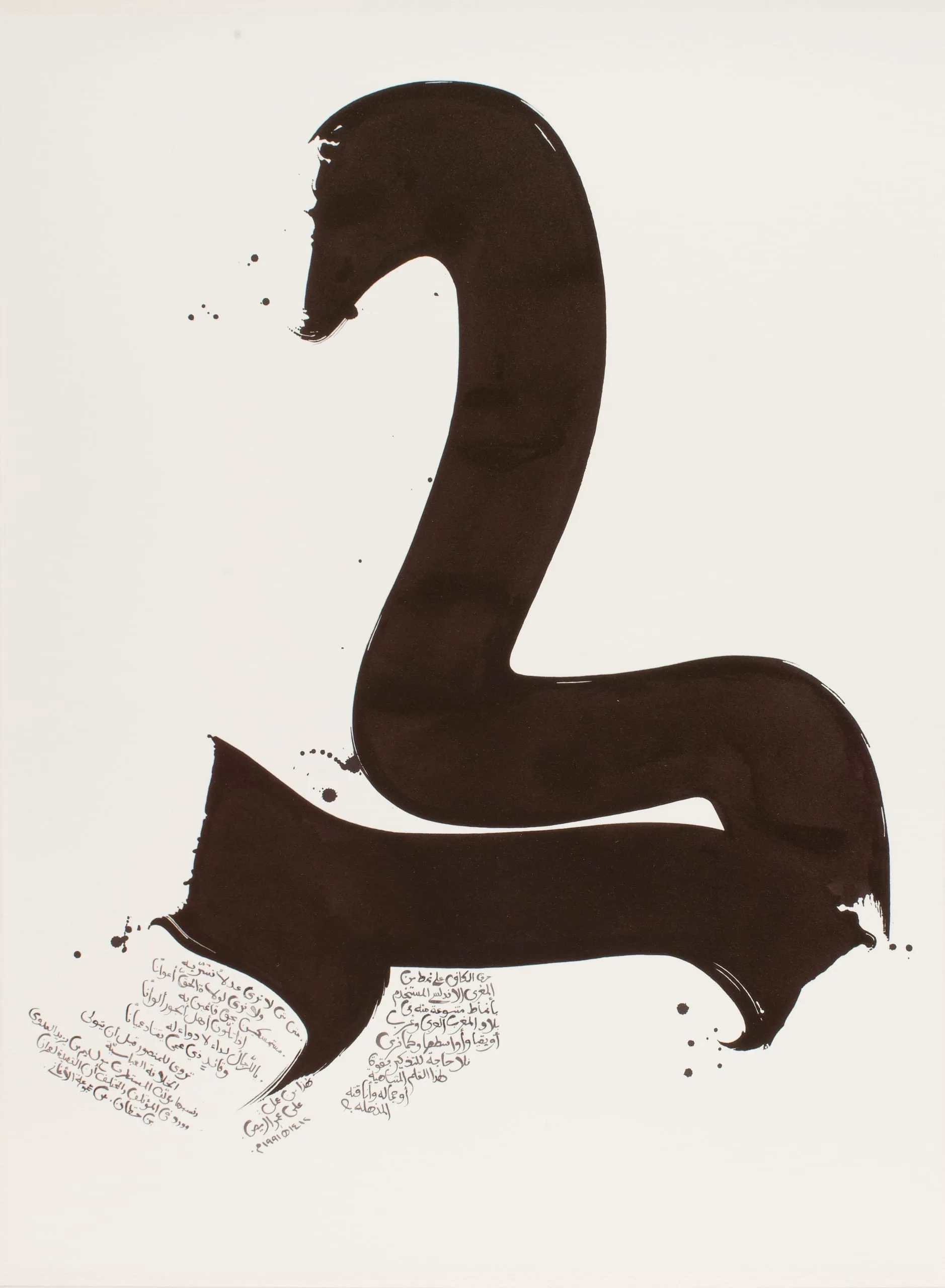 Writing in Arabic is not only a consistent and powerful theme in classical Islamic art but it also resonates with contemporary artists as both an art form and an expression of their cultural or religious identity. In his work, Ermes focuses on a single letter, here a kaf (K). The bold, black letter dramatically offset against the light paper recalls the black inscriptions on a white ground that characterize tenth-century Islamic ceramic wares.