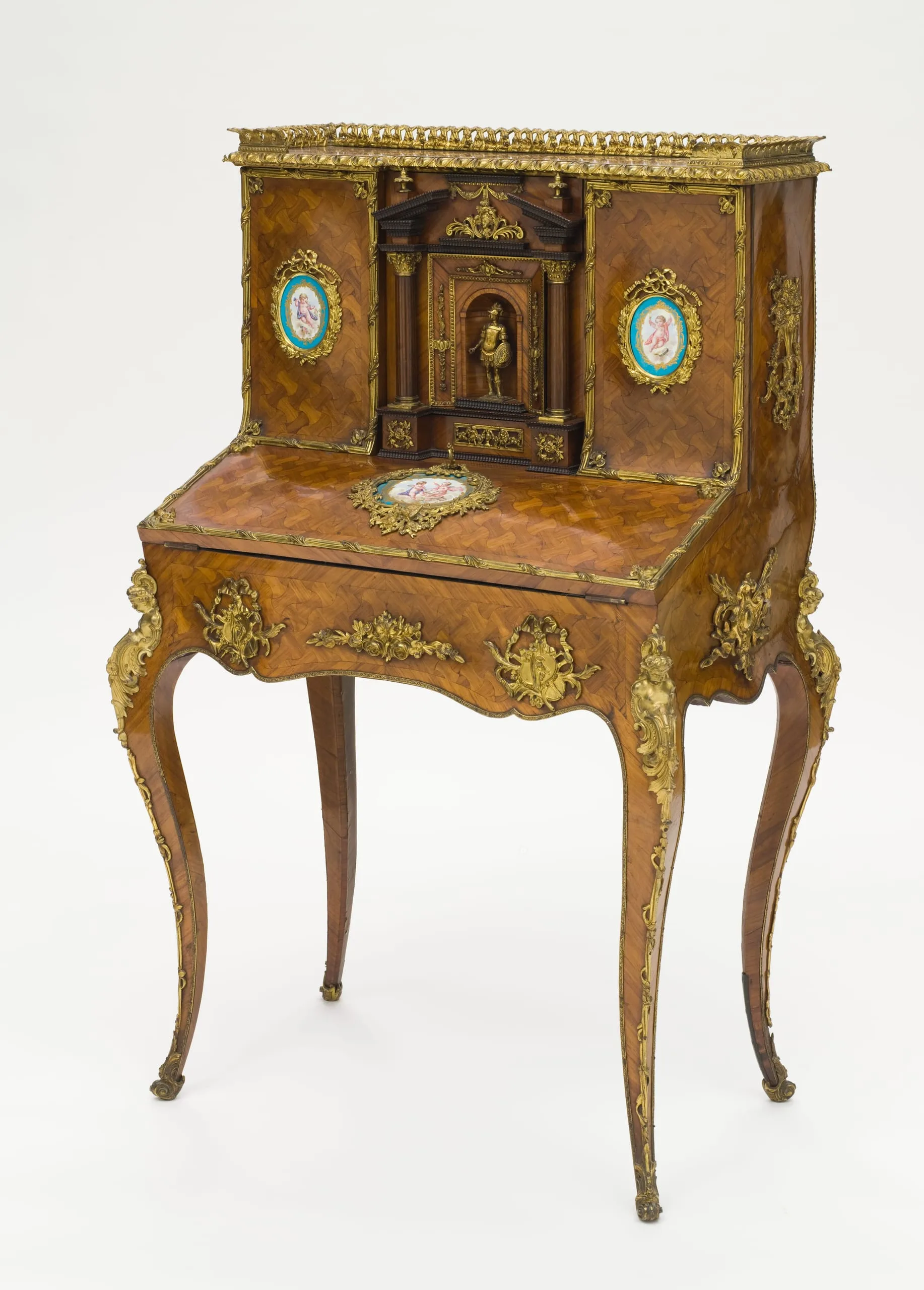- Rosewood, wood veneers, porcelain plaques, metal hardware, gilded bronze, velvet writing surface