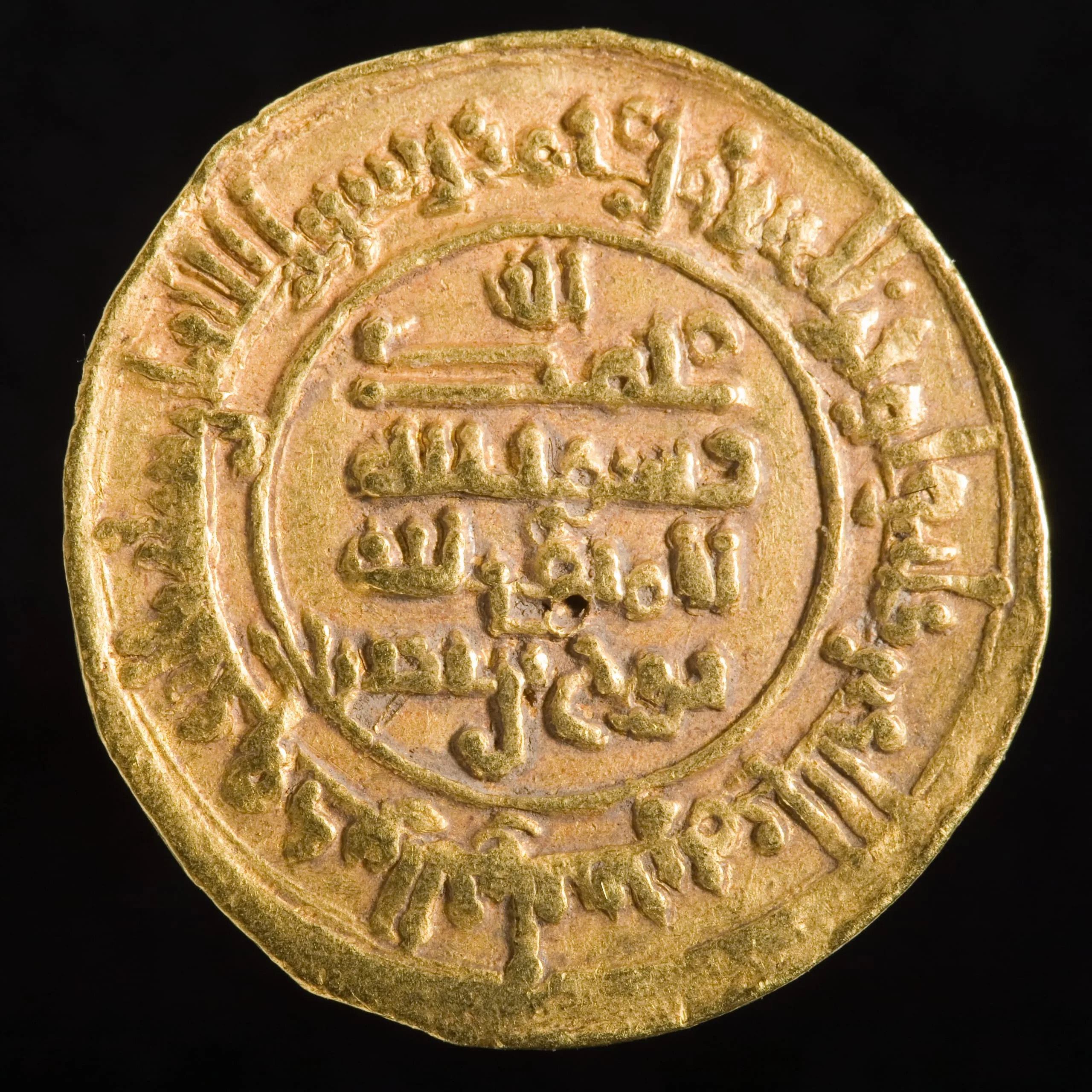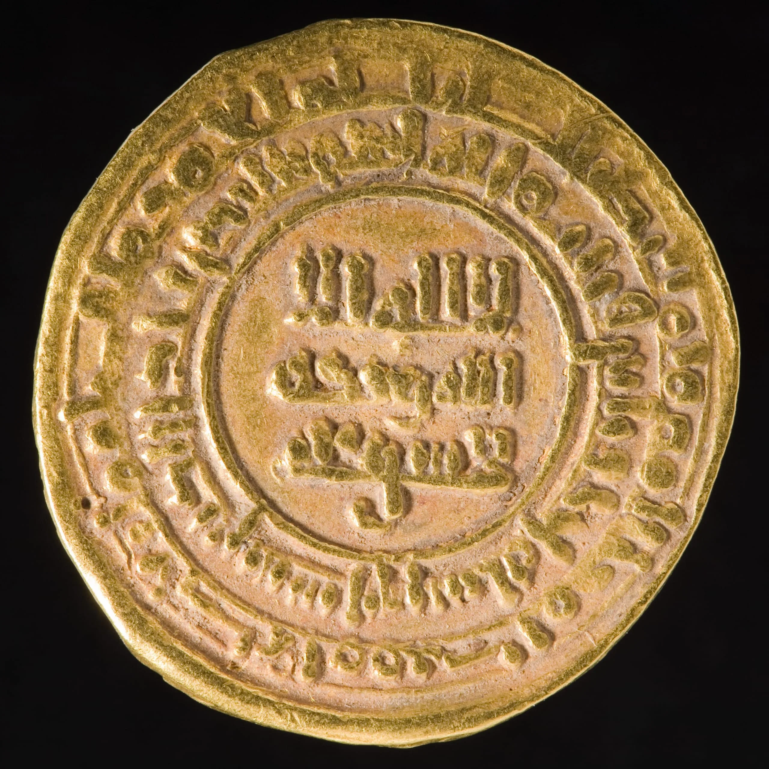 By the 690s, most Islamic coins were decorated only with writing, including the Muslim profession of faith, the date and place of issue, and the name of the ruler. Their purely epigraphic content distinguishes them from Roman and Sasanian coins on which a human portrait appears as a symbol of the government’s authority, as with many coins familiar today. This inscription on this dinar states that it was struck at Nishapur in 331 A.H. in the name of Nuh II (943-954 A.D.). In contrast to the comparatively humbler copper fals, Islamic gold dinars such as this example were not used in day-to-day commerce.
