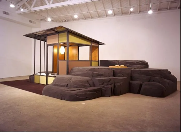 - Powder-coated steel, birch paneling with paint and polyurethane, corrugated metal roof, sculpted foam furniture, fleece blanket, pillows with pillowcases, A-Z Fiber Form Containers (felted wool), camp-stove with tea kettle and water containers