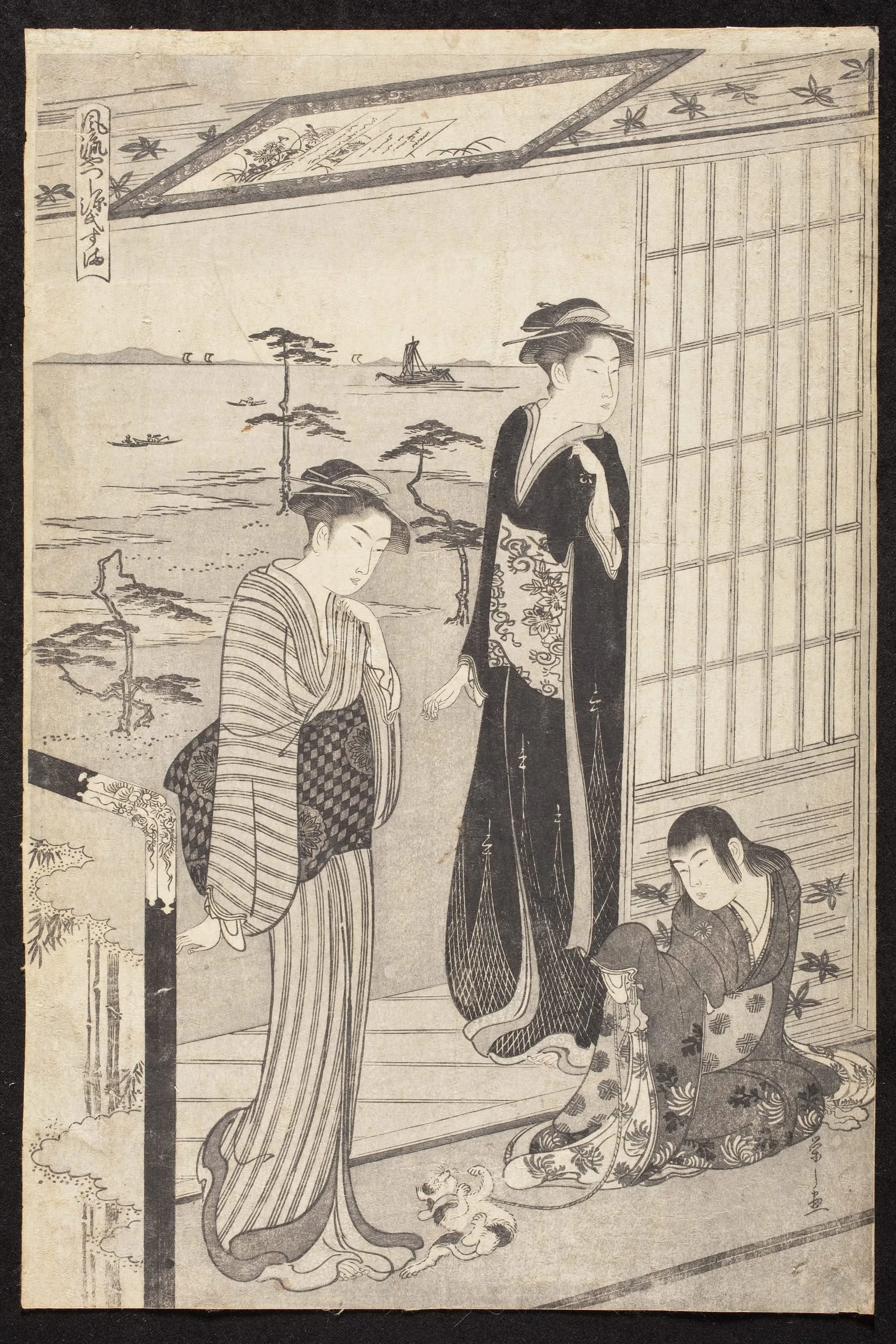 - Color woodblock print, one sheet from a triptych; benigirai-e, red-hating picture