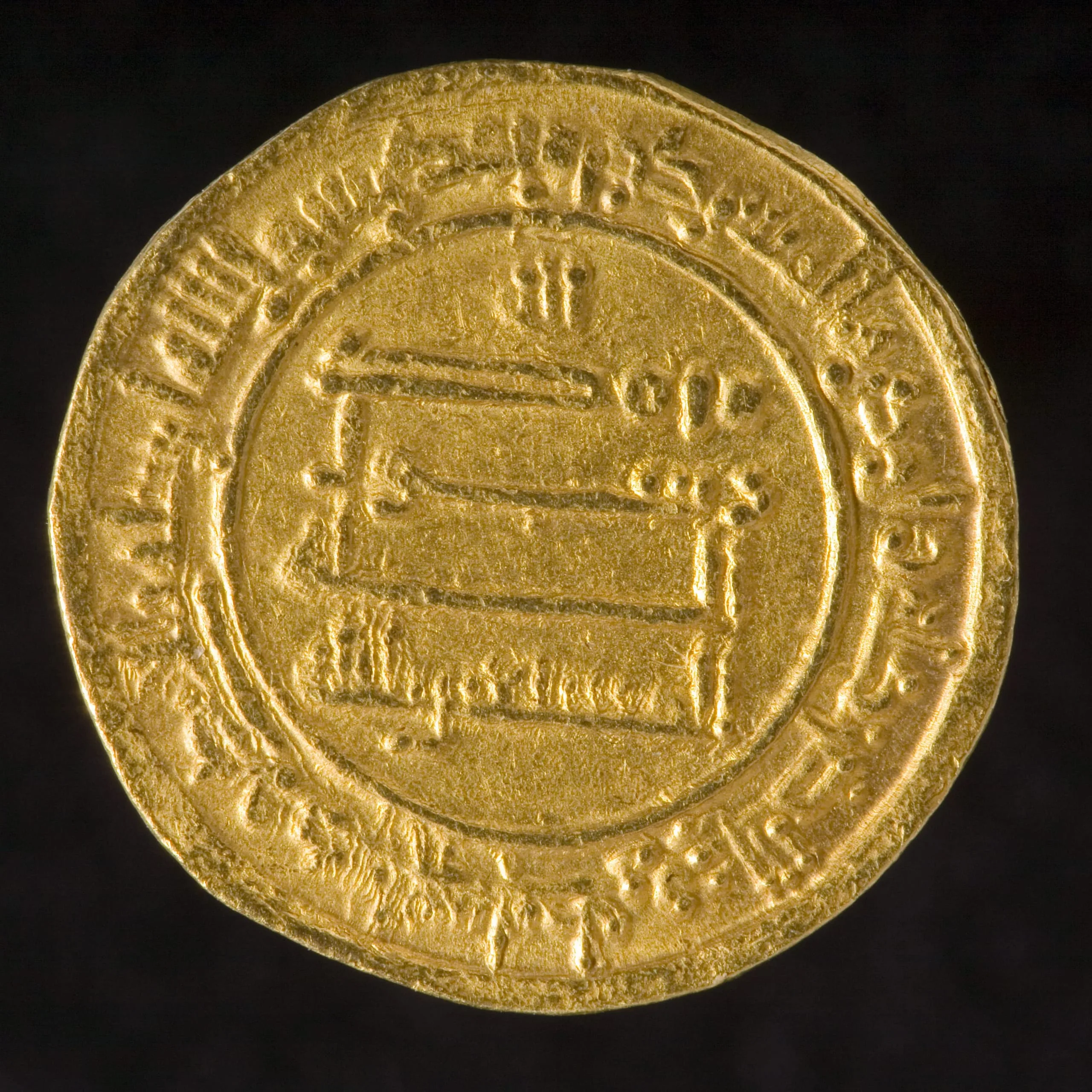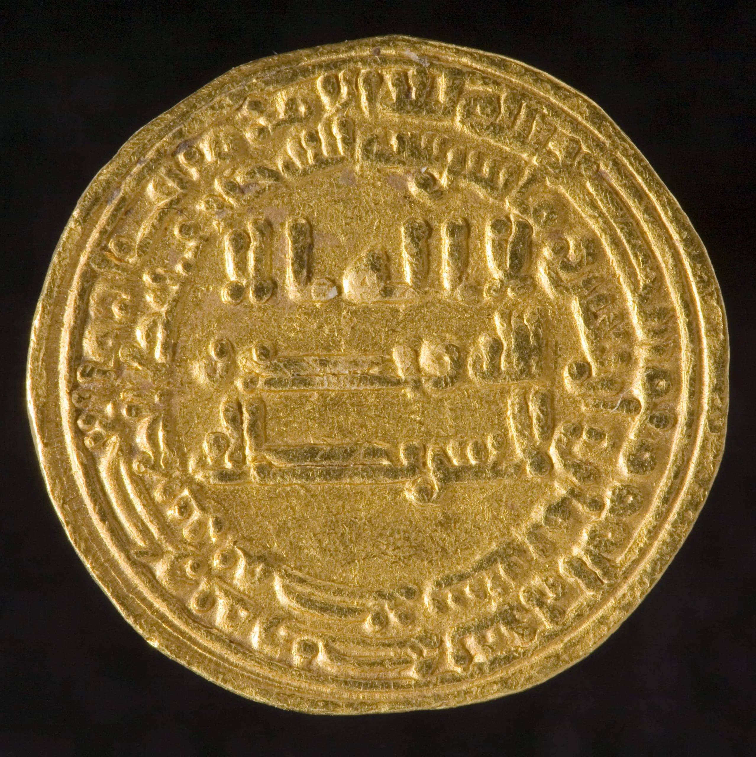 By the 690s, most Islamic coins were decorated only with writing, including the Muslim profession of faith, the date and place of issue, and the name of the ruler. Their purely epigraphic content distinguishes them from Roman and Sasanian coins on which a human portrait appears as a symbol of the government’s authority, as with many coins familiar today. This coin states that it was struck in 248 A.H. in the name of al-Musta'in (862-866 A.D.). In contrast to the comparatively humbler copper fals, Islamic gold dinars such as this example were not used in day-to-day commerce.