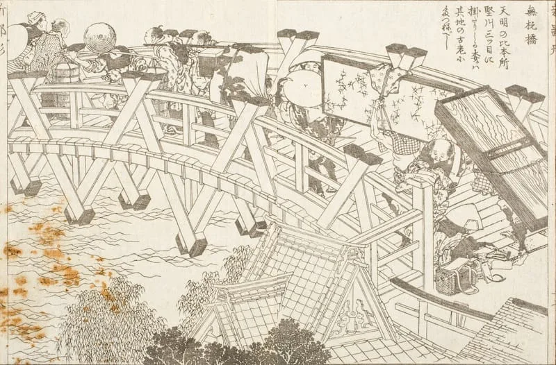 - Double-page book illustration; black and white woodblock print