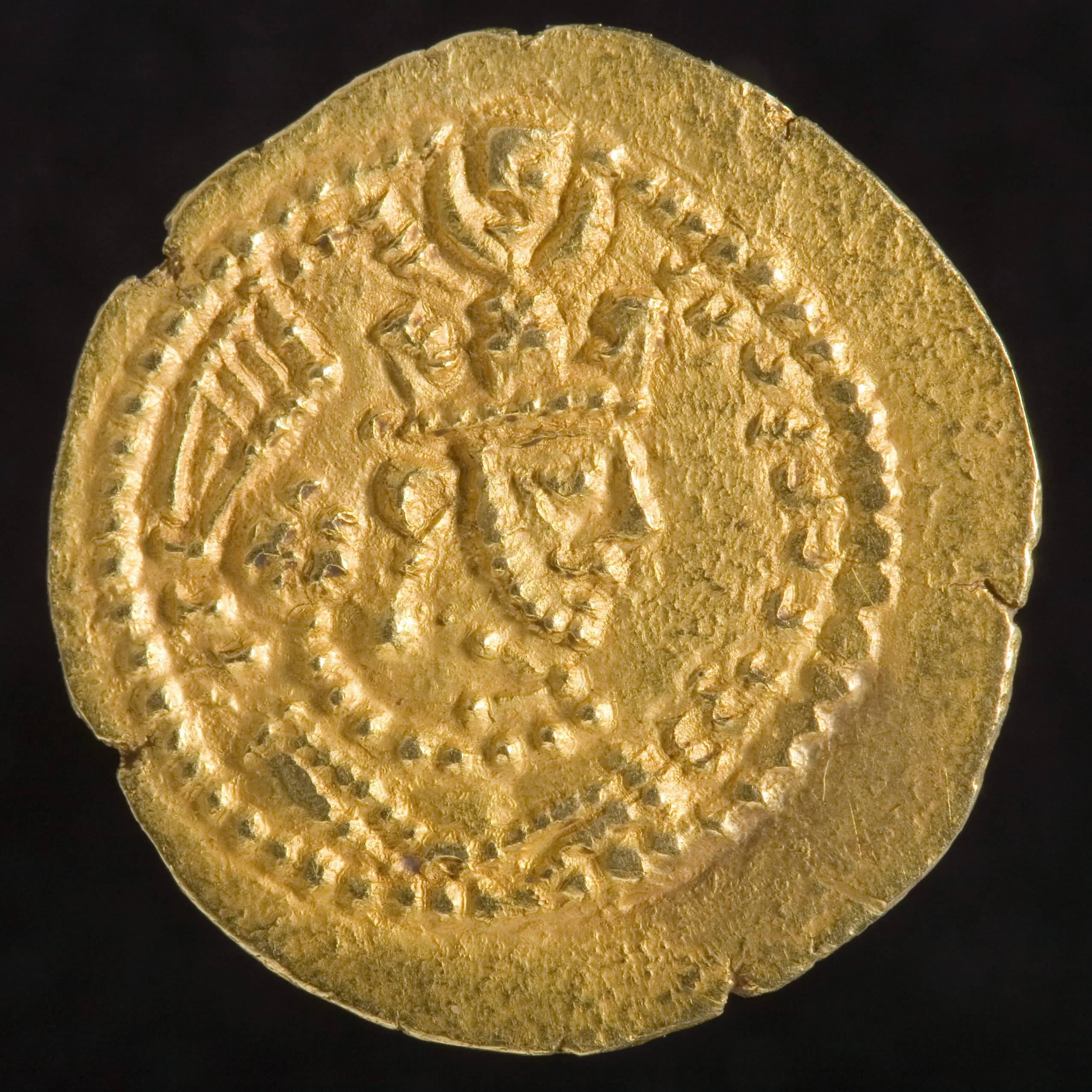 This rare coin follows a type associated with the reign of Yazdigir II (438-457 A.D.). These gold dinars were more ceremonial objects than actual currency. Instead, silver drachms were the main denomination of money in the Sasanian period (see M.2002.1.448). As is typical of Sasanian coinage, whether gold or silver, the obverse here depicts a bust of the king with crenelated crown surmounted by