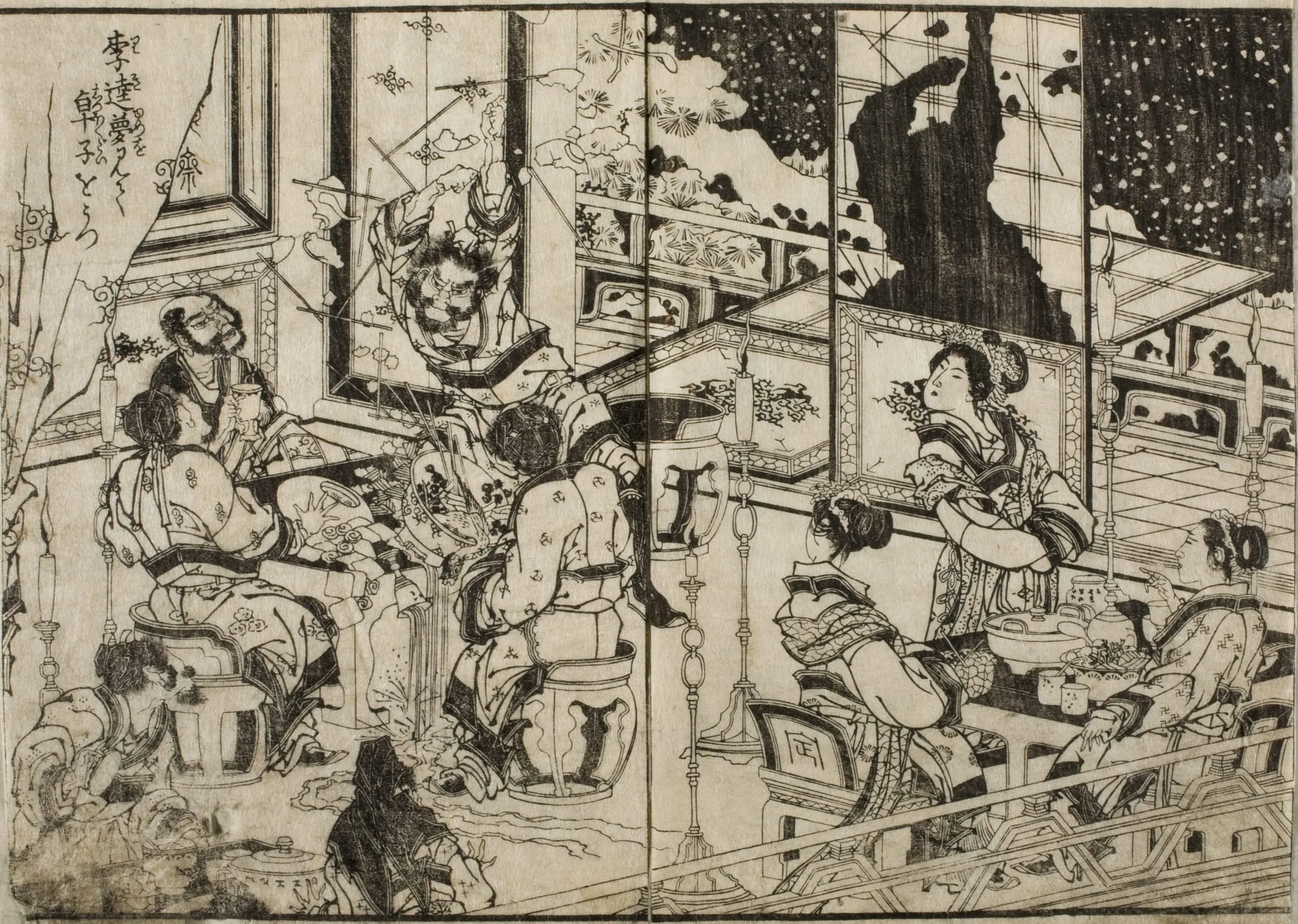 - Double-page book illustration; black and white woodblock print