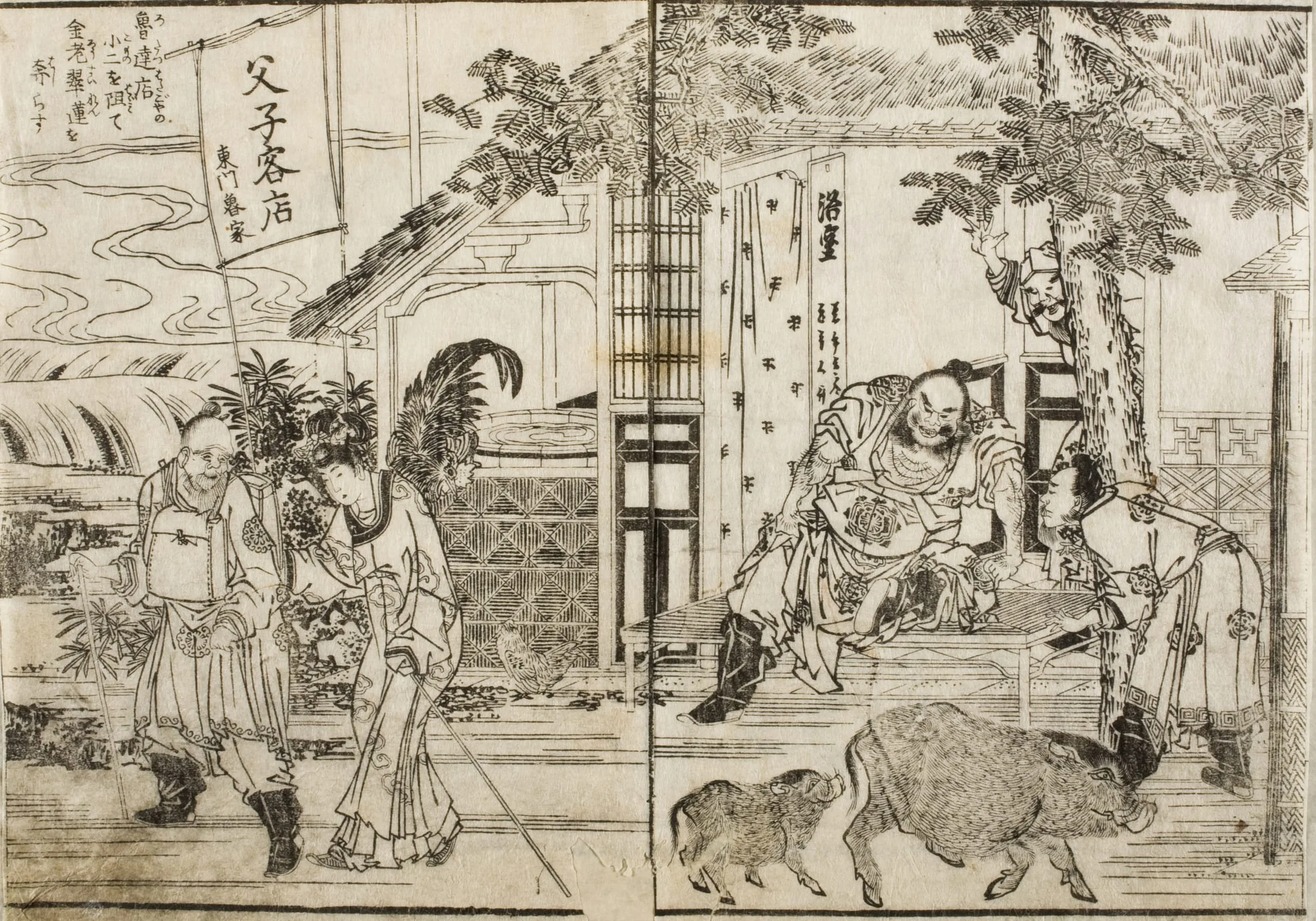 - Double-page book illustration; black and white woodblock print