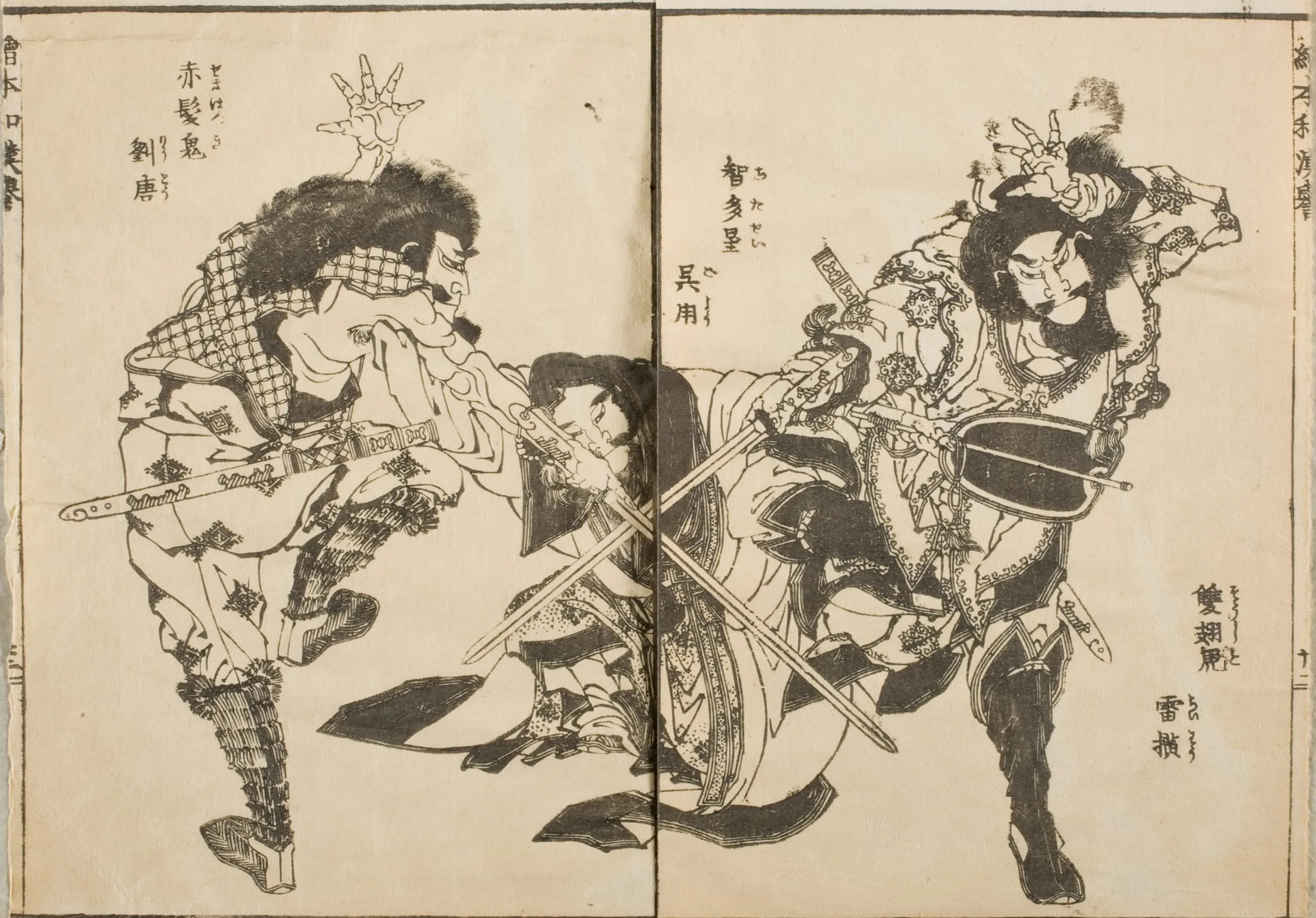 - Double-page book illustration; black and white woodblock print