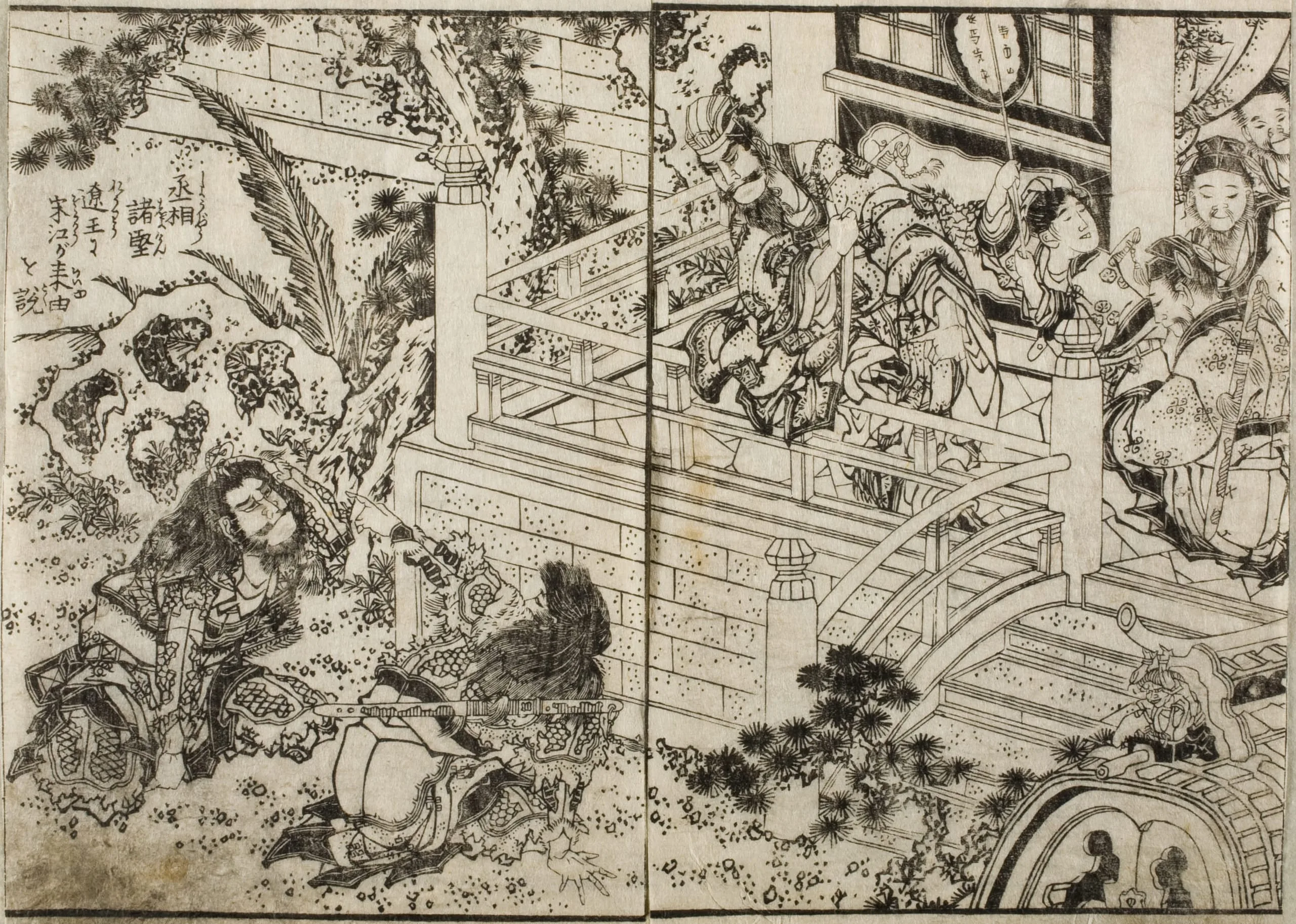 - Double-page book illustration; black and white woodblock print