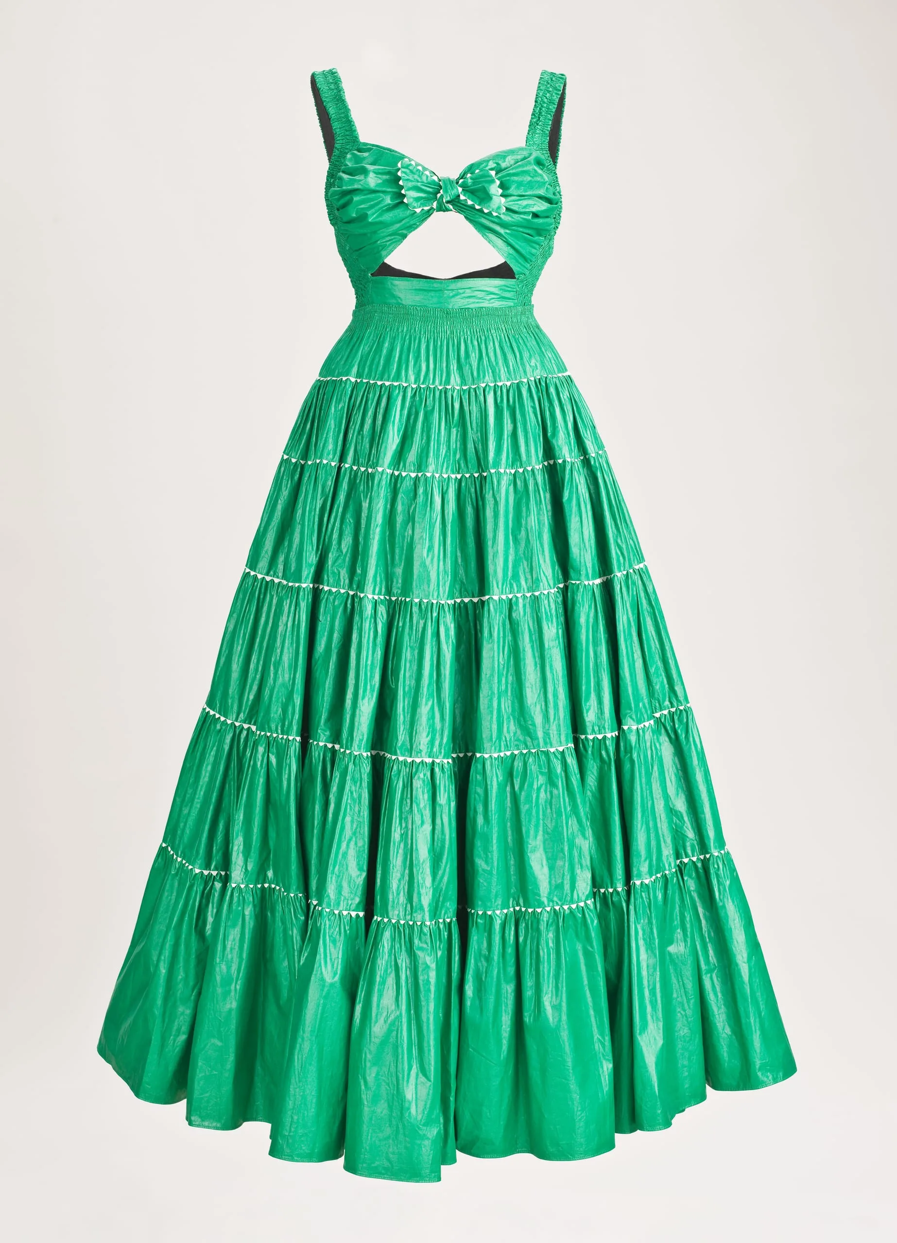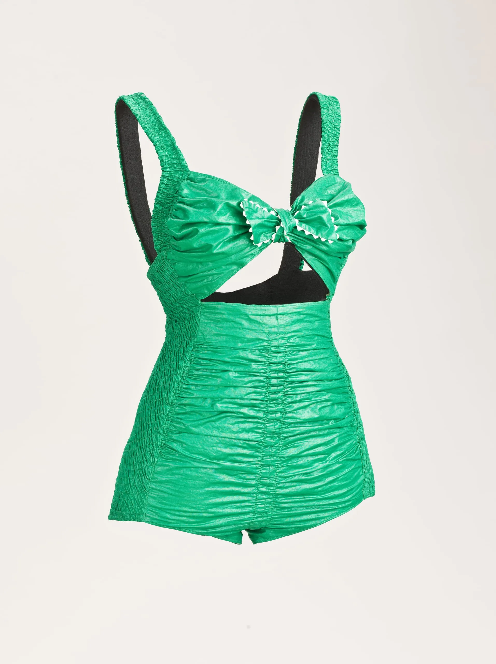 One of California’s most influential contributions to American fashion was the bathing suit ensemble—consisting of any combination of bathing suit, skirt, shorts, pants, and top of the same fabric to mix and match to fit the occasion. Margit Fellegi’s two-piece ensemble could be worn as a bathing suit or, with the addition of the skirt, as seen here, for cocktails by the pool.