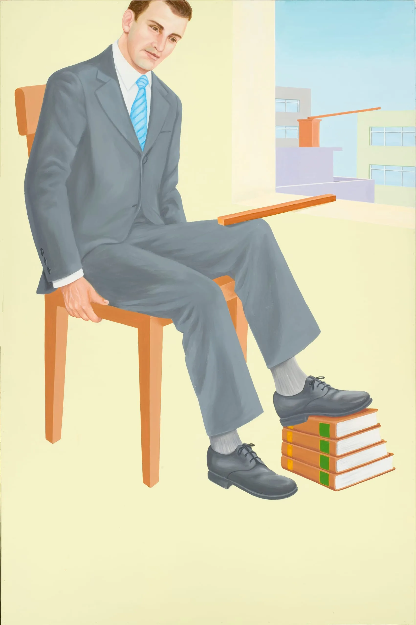 This work, and the rest from the set (https://collections.lacma.org/node/213005" >M.2007.46.1, https://collections.lacma.org/node/213040" > M.2007.46.3, and https://collections.lacma.org/node/213052" > M.2007.46.4), portray a well-dressed businessman seated on a chair and set against a dystopian urban landscape. They belong to Francis Alÿs’s series of sign paintings of the 1990s. Alÿs created an original image, which he then gave to a workshop of trained sign painters, or rotulistas, in Mexico City to copy. The rotulistas in turn introduced subtle modifications to the artist’s design. Each painting is marked by a series of social transactions, making it impossible to discern the original from the copy—a poignant commentary on the larger practice of art making across history and its emphasis on "individual" genius.