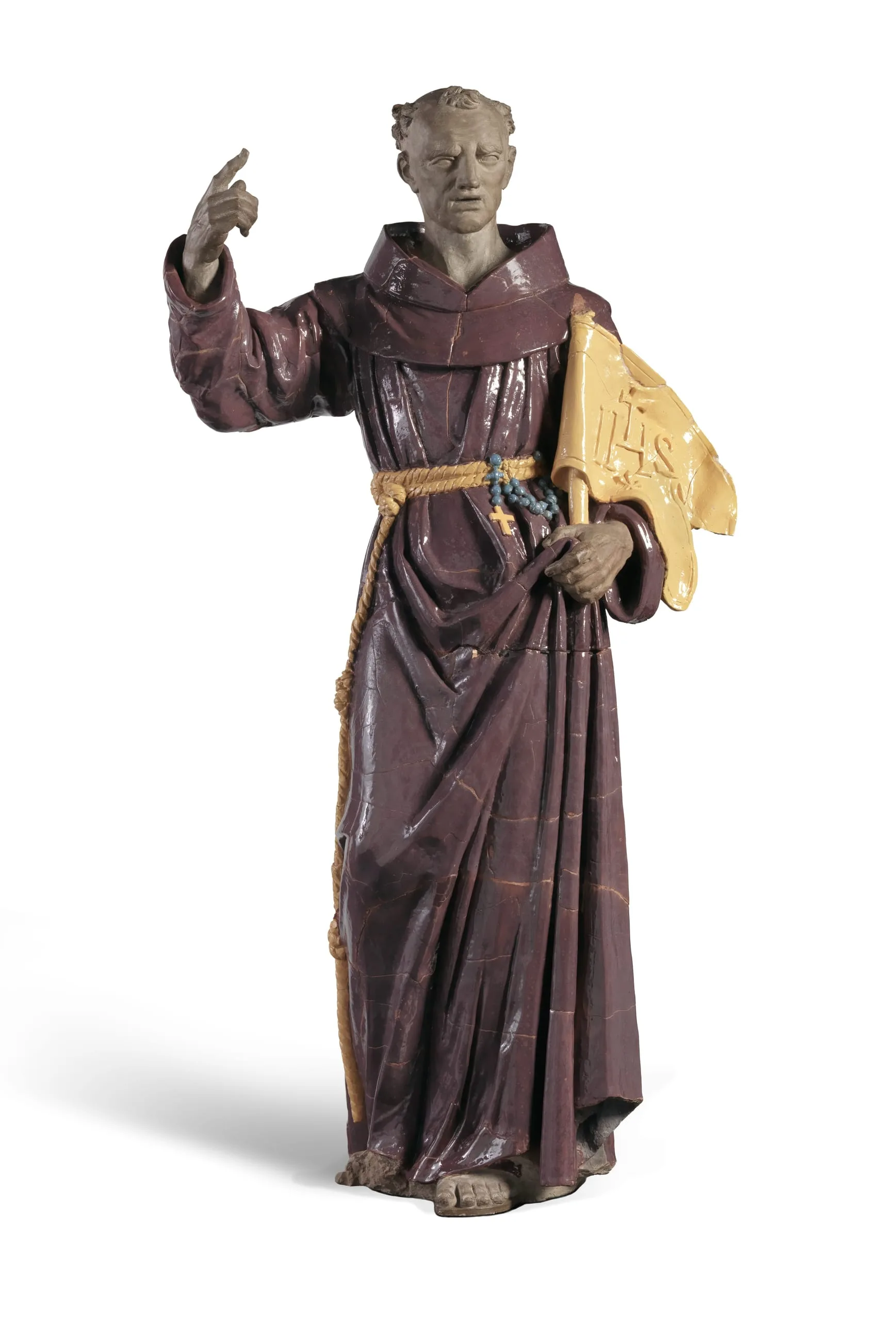 This rare, nearly life-sized Renaissance statue by Santi Buglioni (1494—1576) is believed to represent Saint John Capistran and dates from about 1550. It is made of glazed terra-cotta and worked completely in-the-round. Several full-size glazed terra-cotta statues from the Renaissance are known, but most remain in the churches and sanctuaries in Tuscany for which they were originally commissioned.