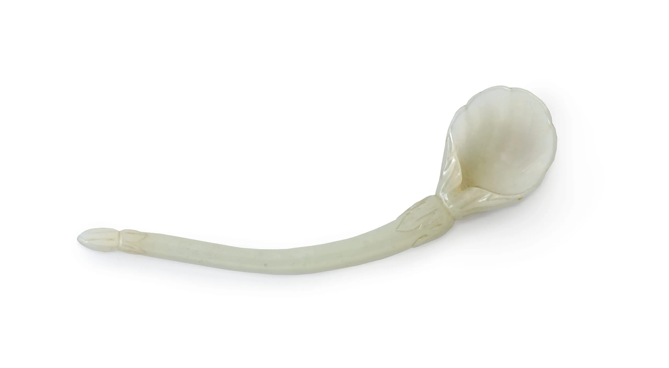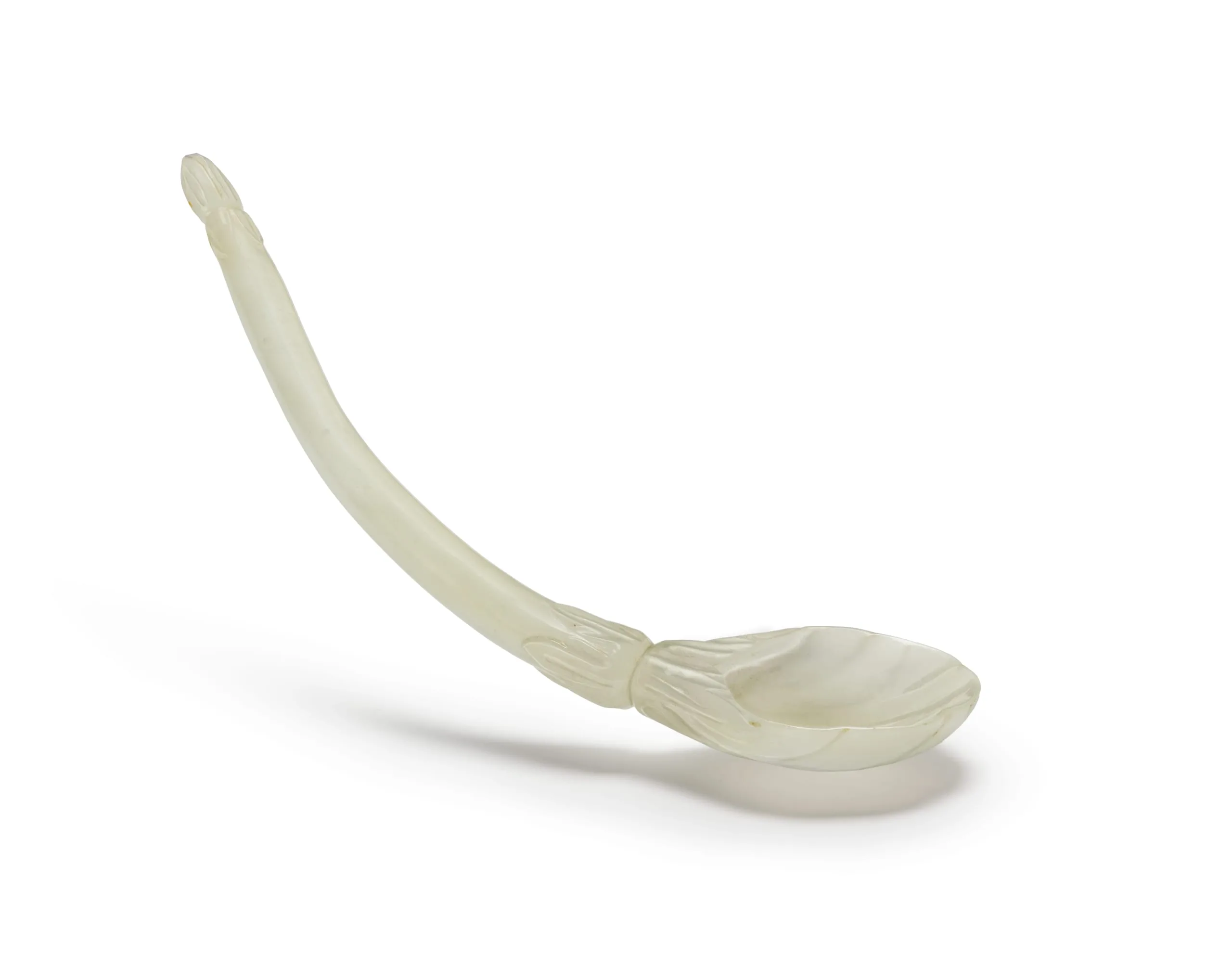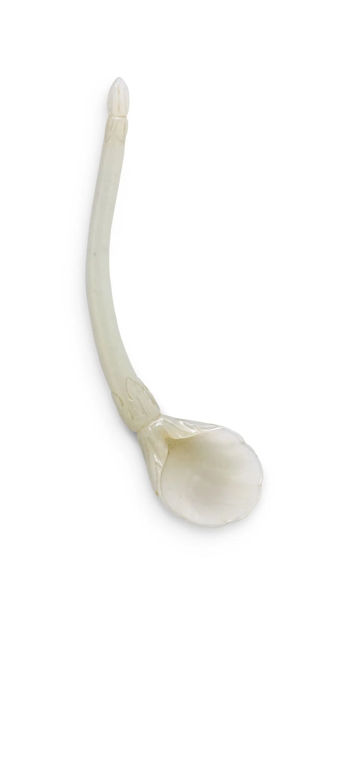 The intended social function of the spoon is uncertain, and there are no known examples of spoons of this type depicted in Mughal paintings that could provide clues to its original cultural context. Although the repertoire of extant Mughal palatial tableware and utensils includes ovoid serving spoons made of jade and precious metals and jade ladles made in a lobed form, these are all considerably larger than the LACMA spoon. Judging from its small size and tiny bowl in the form of a shallow circular scoop, both of which render it impractical for serving or eating a typical portion of food or liquid, the spoon may have been used originally to consume a paste of opium resin mixed with syrup or thickened juices to make it more palatable. Opium spoons used in this manner were described in the late 19th century as a Turkish method of consumption, but on the basis of the LACMA spoon it seems likely that the practice may have also been current in South Asia.