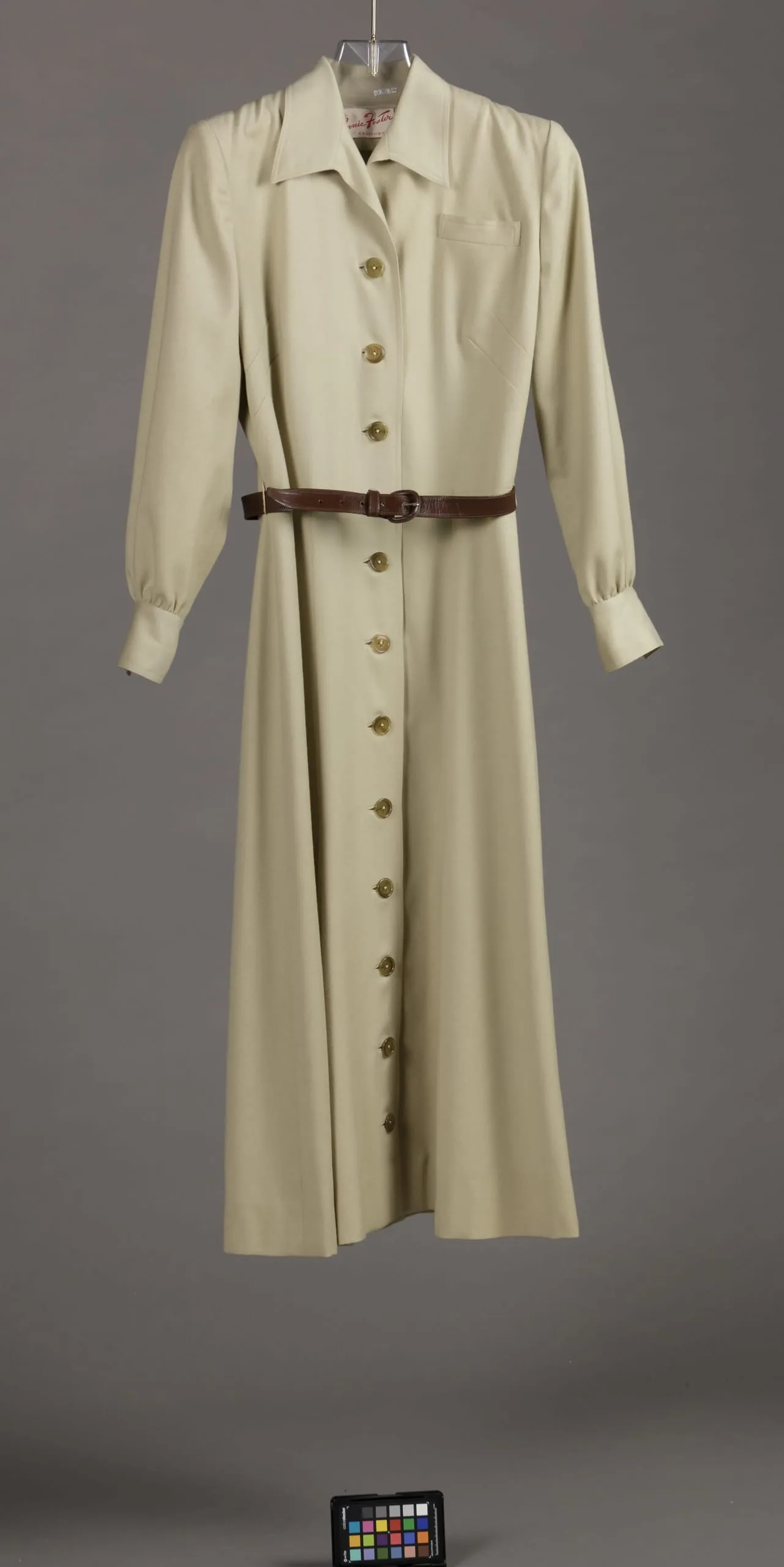 - Dress: wool twill, fulled, with plastic buttons; Belt: faux leather