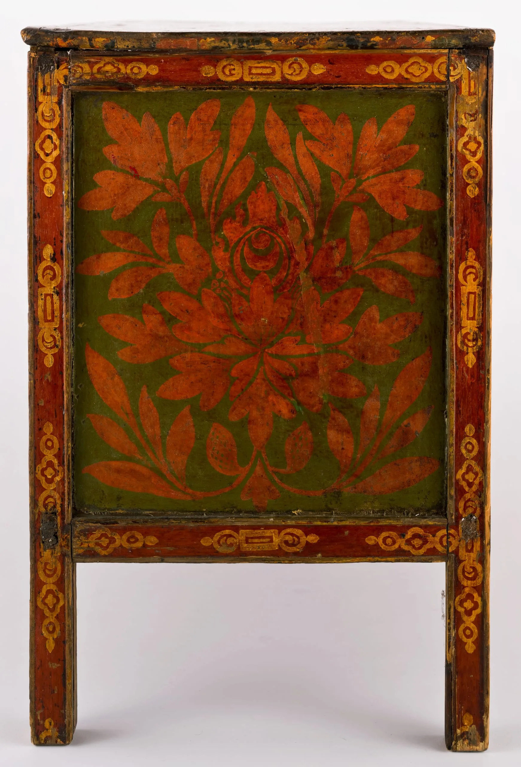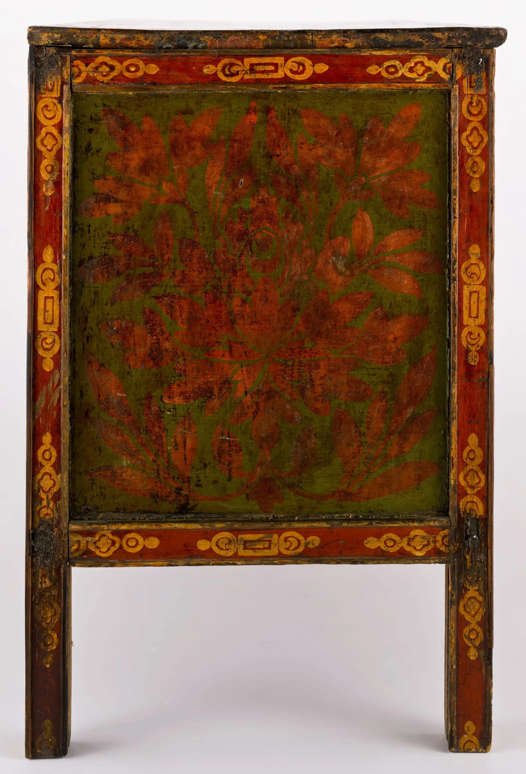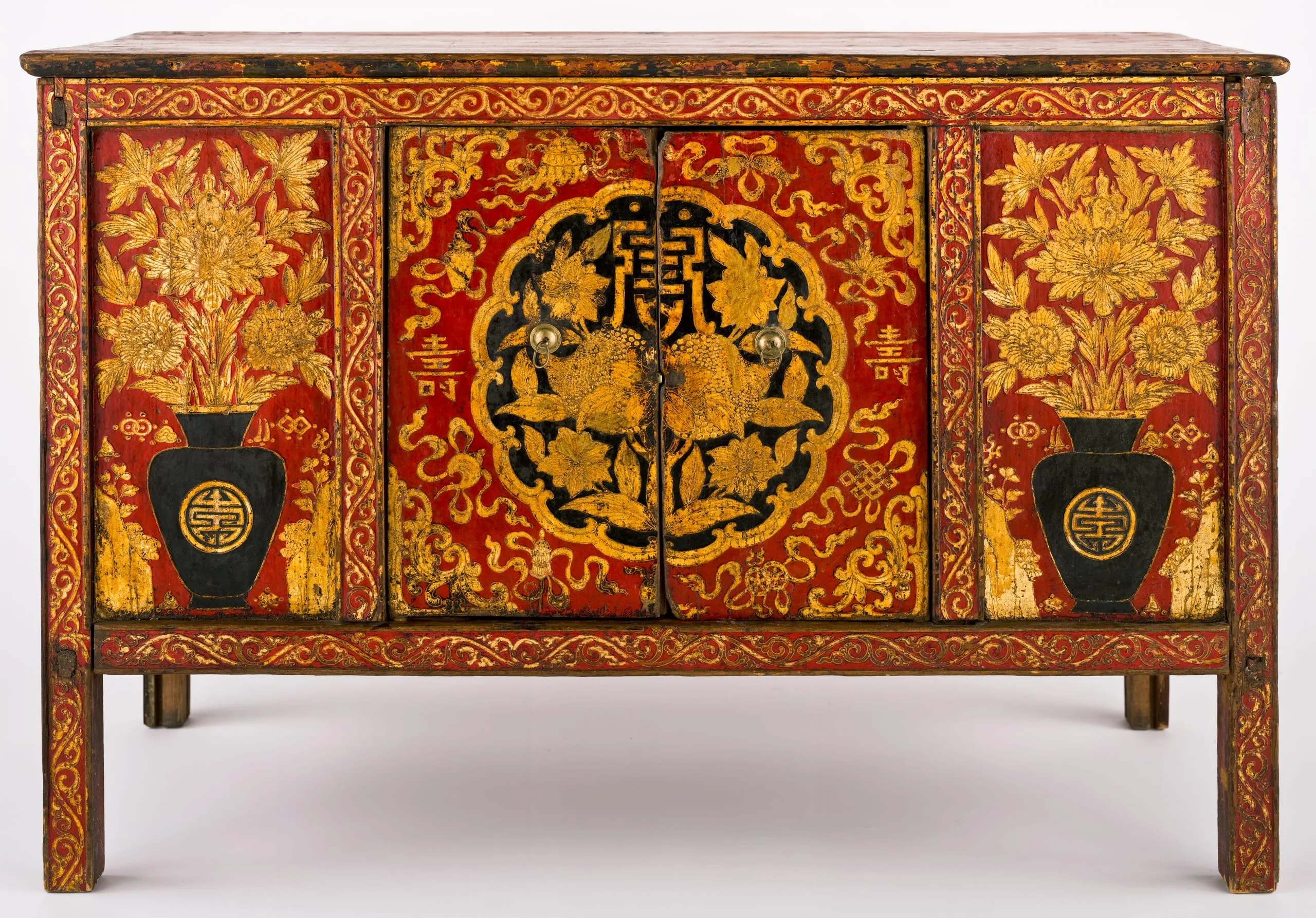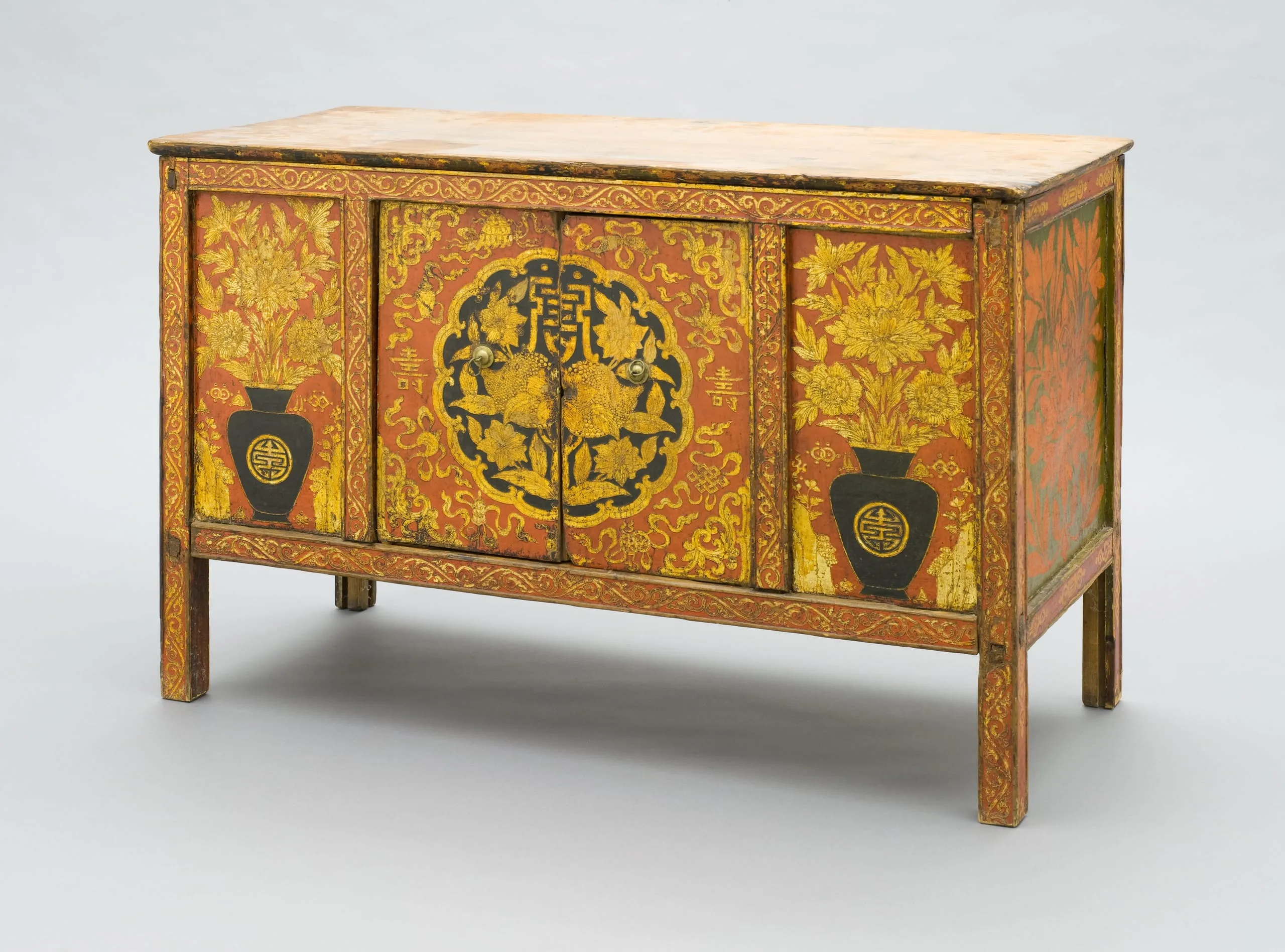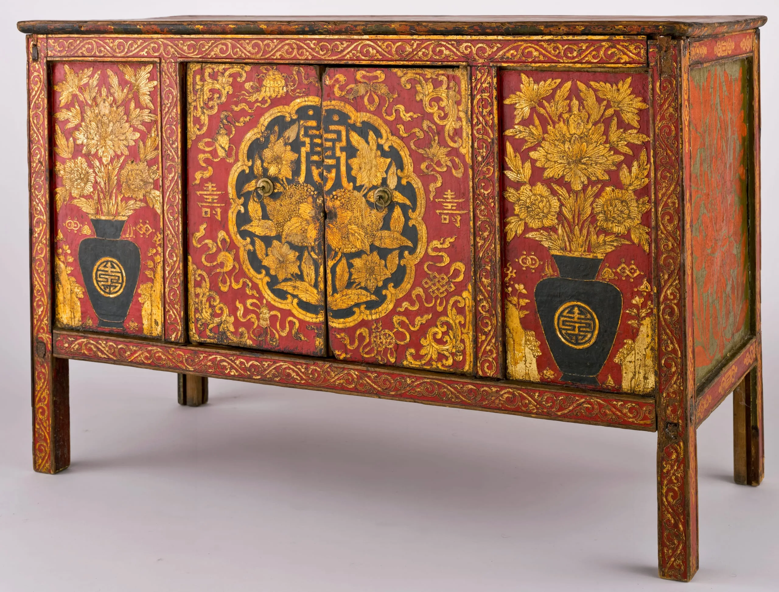 Yangam cabinets are used to house Wealth Vases (yangbum) filled with precious metals, gems, and other auspicious substances. The vases are used in annual ceremonies performed to increase one’s wealth or good fortune. The exterior of the cabinet is adorned on the front left and right panels with symbolic depictions of two black Wealth Vases set in landscapes. They hold golden flowers and are inscribed with the Chinese shou character for longevity. In the center on the cabinet doors is a black lobed roundel with the Chinese character for prosperity and other auspicious symbols. It is surrounded by the Buddhist Eight Auspicious Symbols and the Chinese character for double happiness in gold on either side. Scrolling foliage fills the four spandrels. The exterior ends of the cabinet are each painted with a red flowering plant with a precious jewel on a green ground, The interior of the cabinet is embellished with an eight-spoked wheel, skull cup bowl offerings, animals, and birds in red and gold outlines on a black ground.