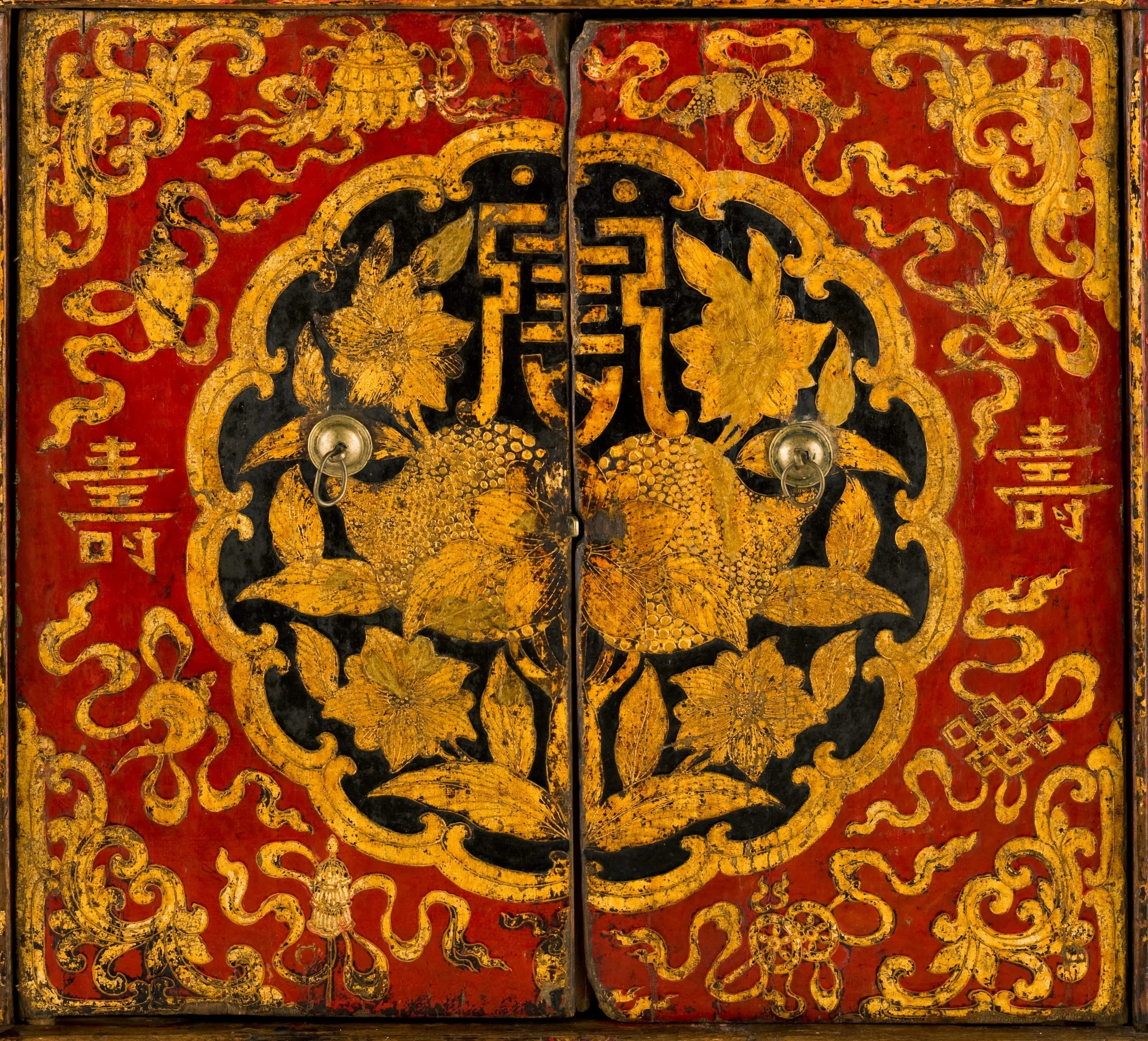 The cabinet’s palette of gold designs against vermilion and black backgrounds represents a luxurious expression in furniture of the red-field and black-field (gser thang) genres of Tibetan painting (see M.83.253, AC1993.190.1 and M.86.292.1-.183). Here, gold leaf is used in place of gold paint to create the composition.