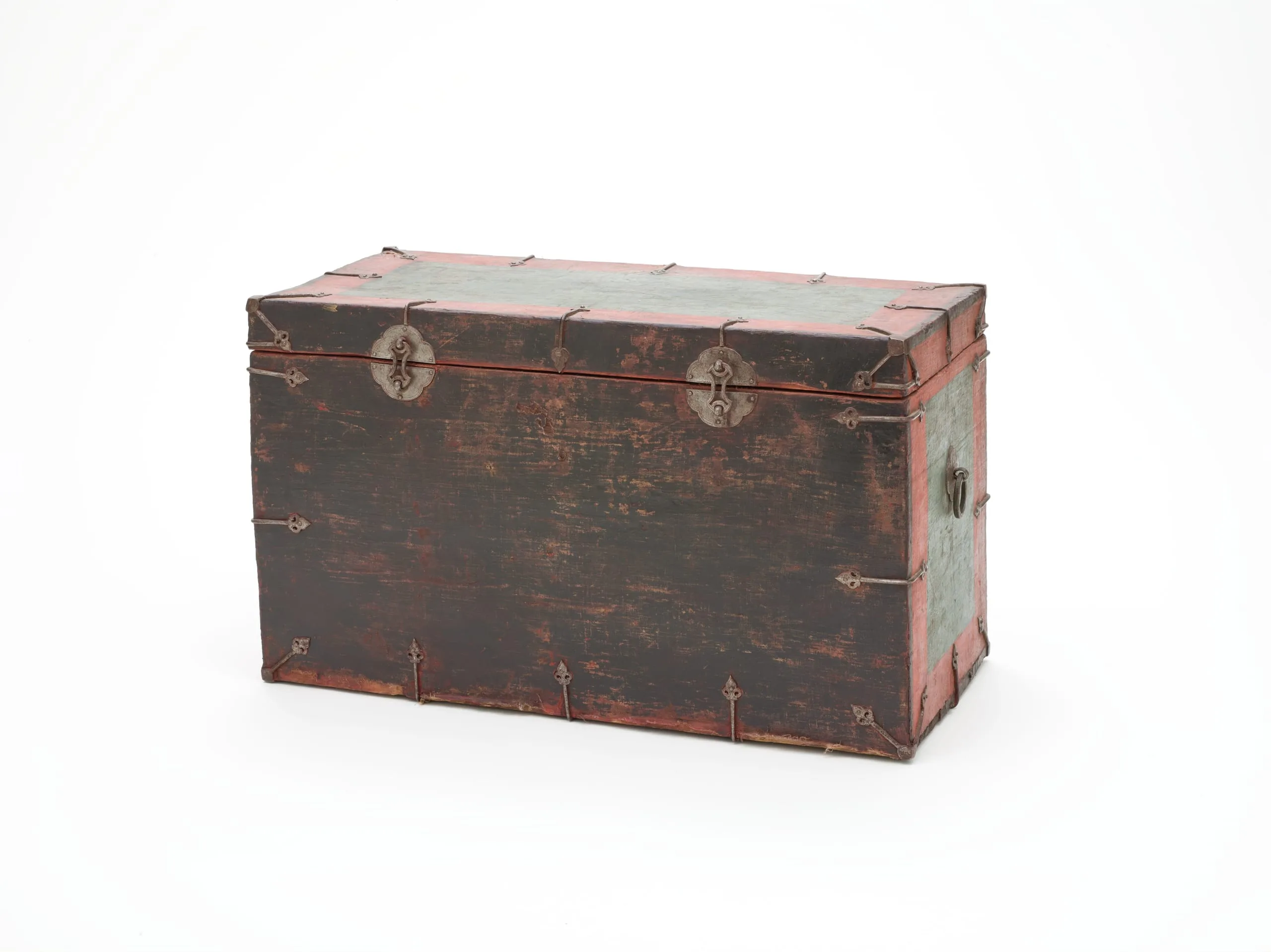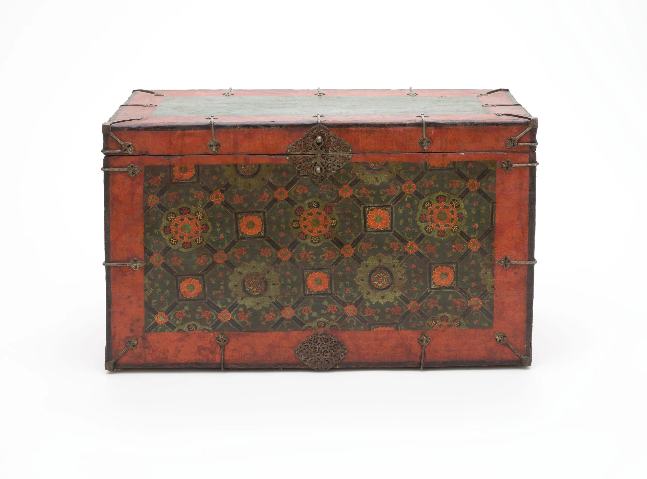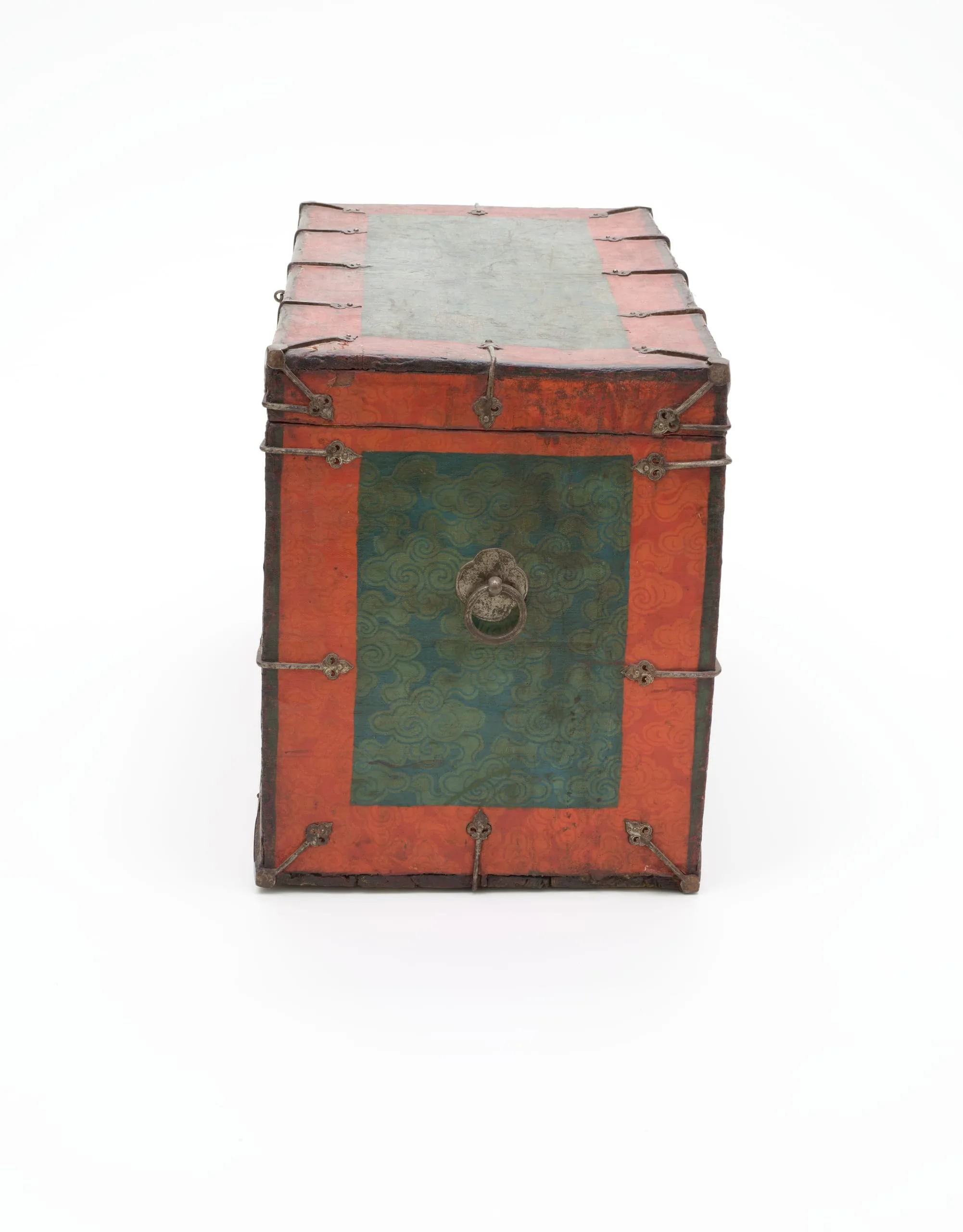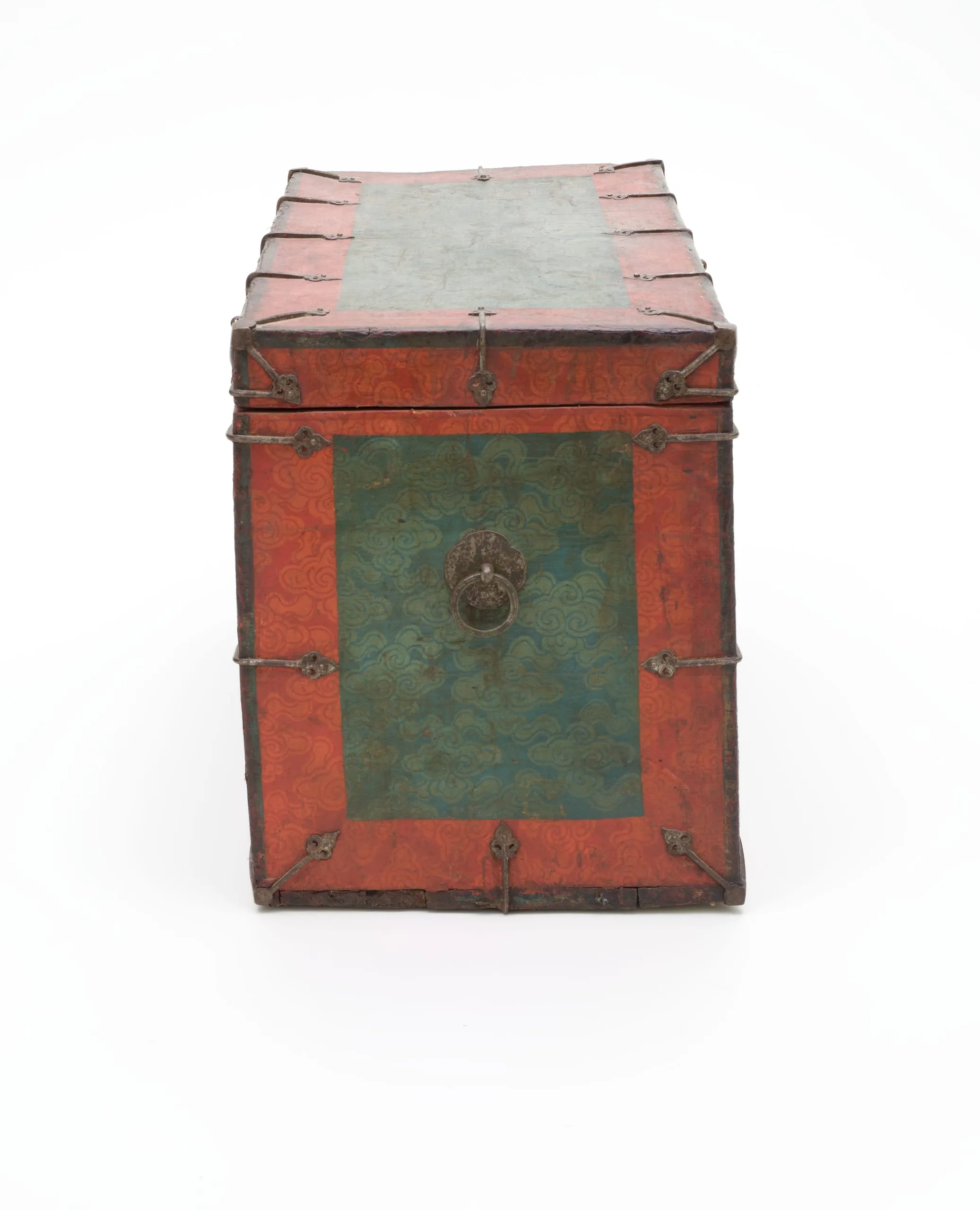 The painted decoration on the exterior of Tibetan furniture is often determined by the intended function of the particular piece of furniture. For example, the painted renditions of intricate textile designs found on some trunks suggests that they were used to store luxury textiles imported from China, India, and Europe. One of the most important textile designs is a latticework motif called kati rimo (brocade), which can be traced back to the Mongol culture of the Yuan Dynasty in China (1279-1368) and even earlier in the western Islamic world. This exquisite trunk is embellished with painted kati rimo designs on the front and puffy cloud panels on the top and ends that derive from Ming Dynasty (1368-1644) cloud-patterned damask textiles (see M.86.404). It has been fitted with extensive metal fittings and handles. See also M.2006.156.3a-b and M.2013.183.1.