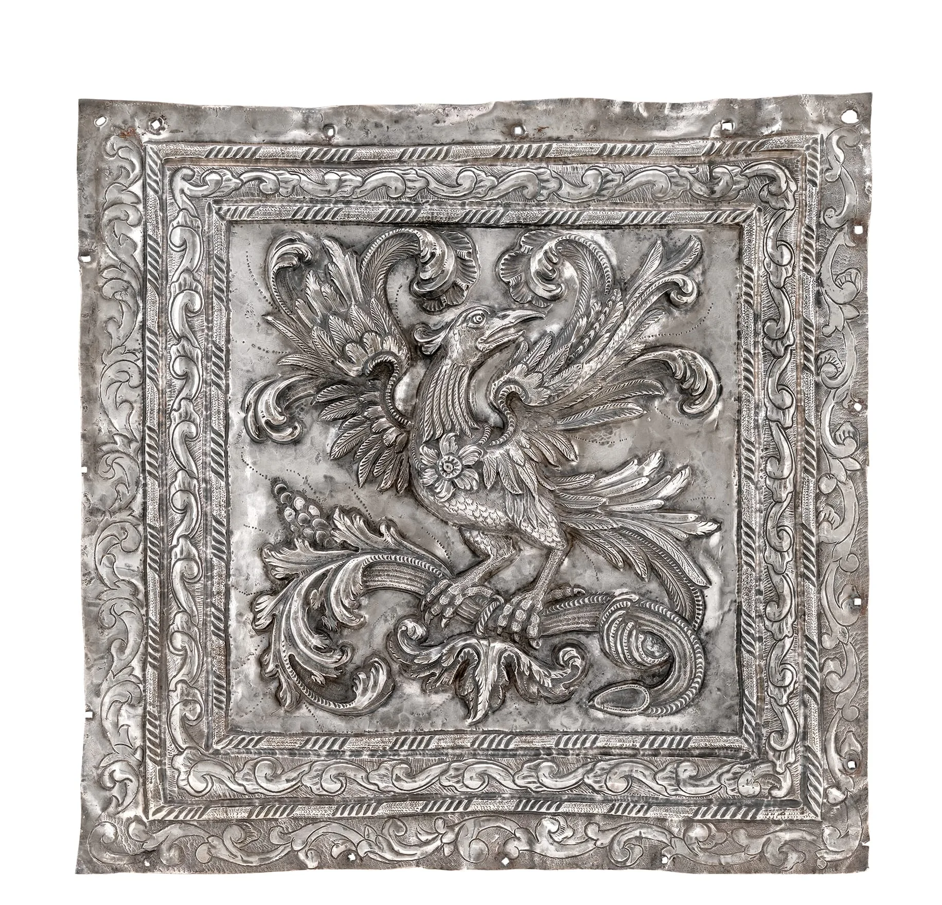 Elaborately decorated silver plaques adorned church altars across the viceroyalty of Peru and were shipped around the world, including to Jerusalem. These fragments were originally nailed to a wooden armature as part of a larger ensemble. The finely rendered bird of this plaque (see also https://collections.lacma.org/node/213397" >M.2007.29.4) resting on a vine with a small cluster of grapes references the Eucharistic wine and hence the blood of Christ, a common motif for ecclesiastical objects, including altar frontals and tabernacles. The recurrence of such motifs, which were popular in Andean silver, woodwork, and textiles before the arrival of the Spaniards, also greatly concerned colonial authorities.