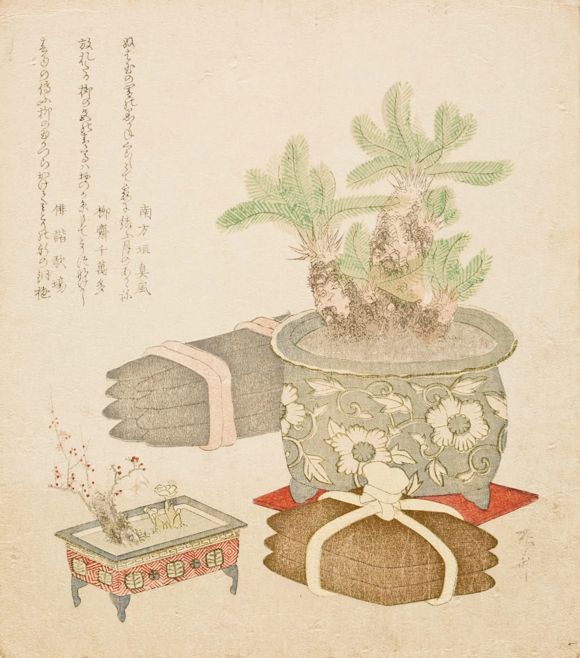 - Potted Sago Palm, Plum and Adonis Plants, with Copper and Silver Ingots