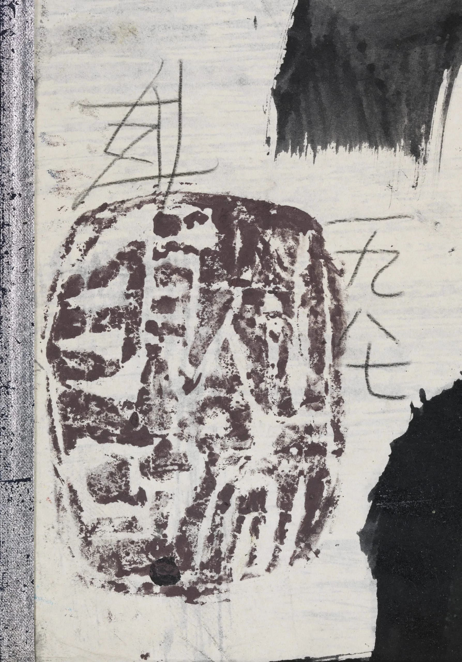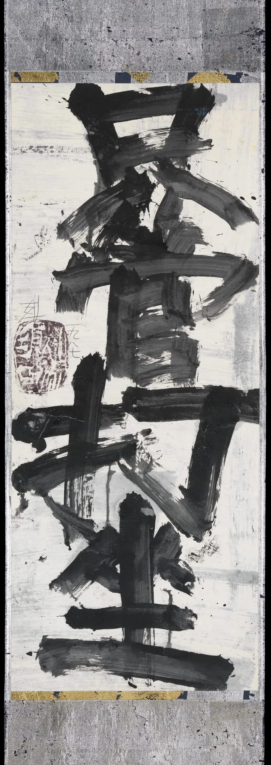 Suda claimed to want to express himself like a child. As such, he approached the ink and paper with pure emotion and intensity, apparently without the diluting overlay of subjectivity that comes with life experience. Suda painted the background paper with a white over dark effect, white pigment on the face of the paper revealing ink washed across the reverse of the sheet that soaked through to the front. He then decorated the mount with randomly placed gold and silver leaf, and called upon his skills as a painter, rather than on orthodox rules of calligraphy, in this bold statement. The enormous seal at the left reads "Suda Kokuta", in a format reminiscent of a section of a tree trunk.