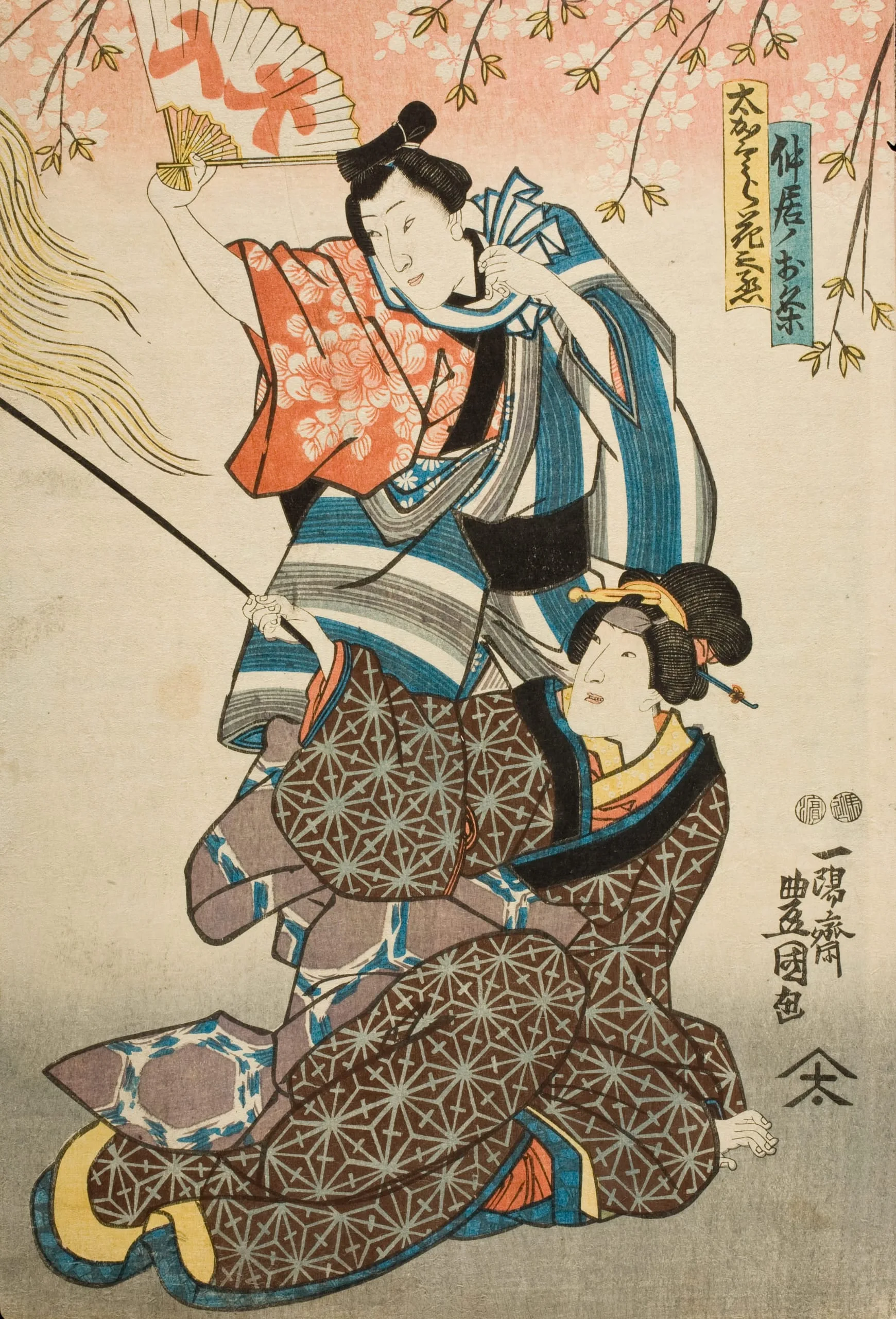 - Actors Iwai Kumesaburō III as Nakai no Okume, Onoe Kikujirō II as Daikagura Hananojō, Bandō Takesaburō I as Kokura-an Chōkichi, and Ichikawa Kodanji IV as Moremore Yoshizō in the Play Iro Ichiza Tegoto no Fukubiki