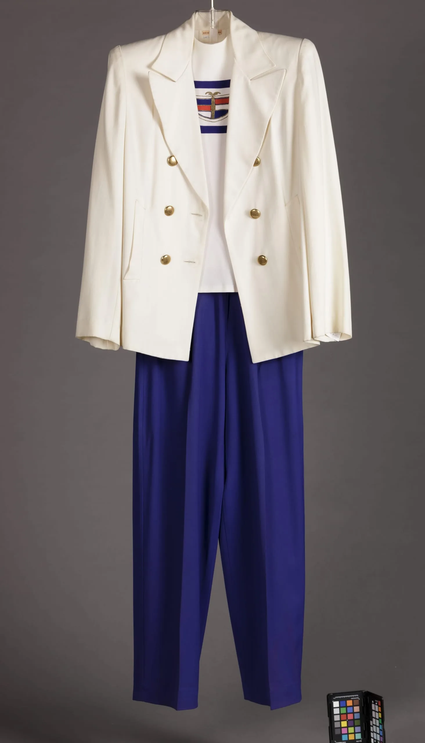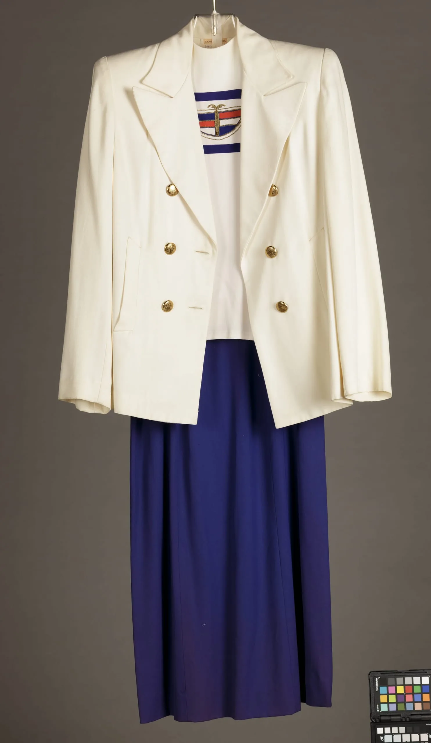- Jacket: Wool twill (gabardine), metal buttons; Blouse: Rayon plain weave (crepe), with metallic thread embroidery; Skirt and Pants: Wool twill (gabardine); Belts: Wool twill, metal.