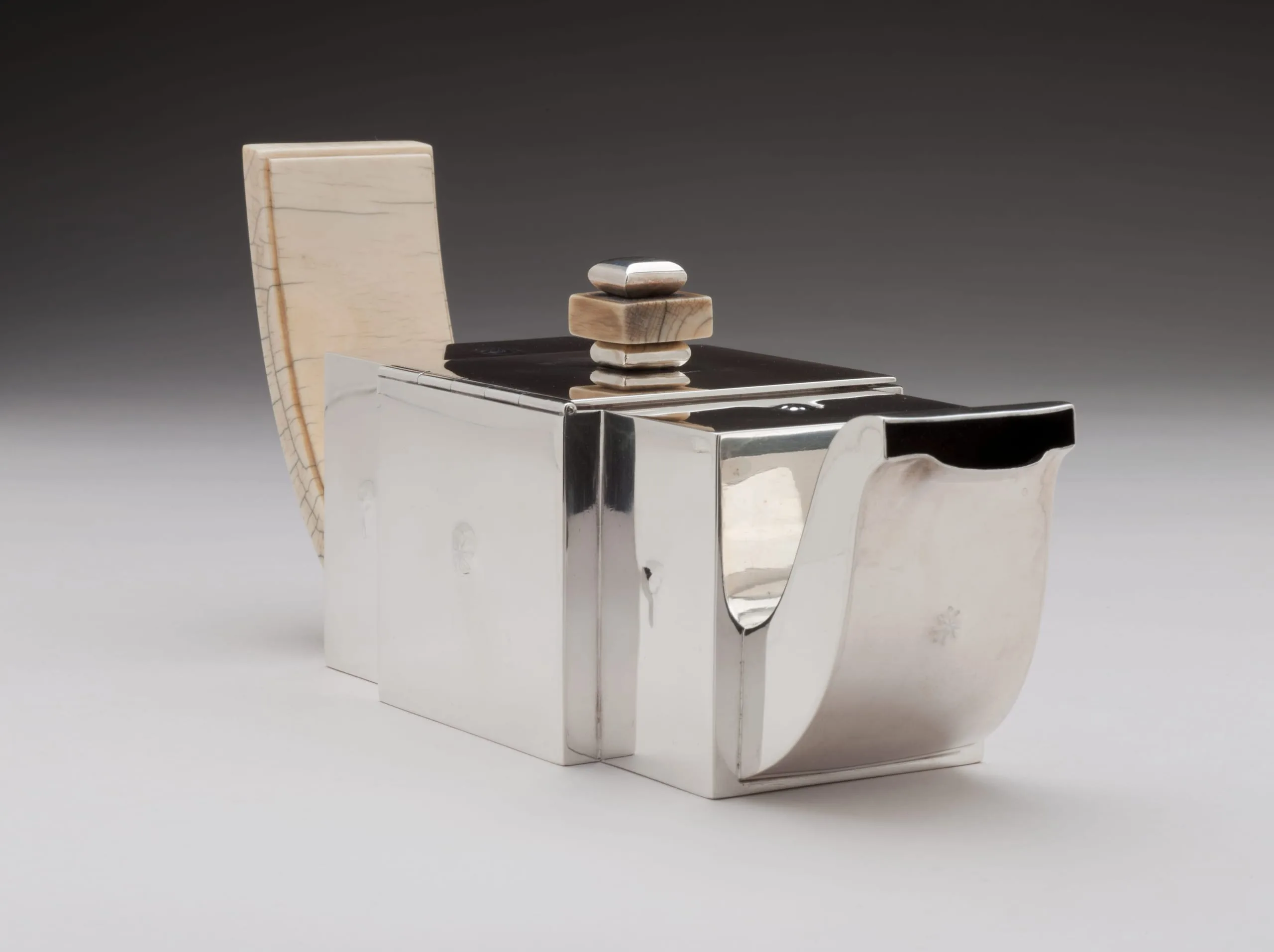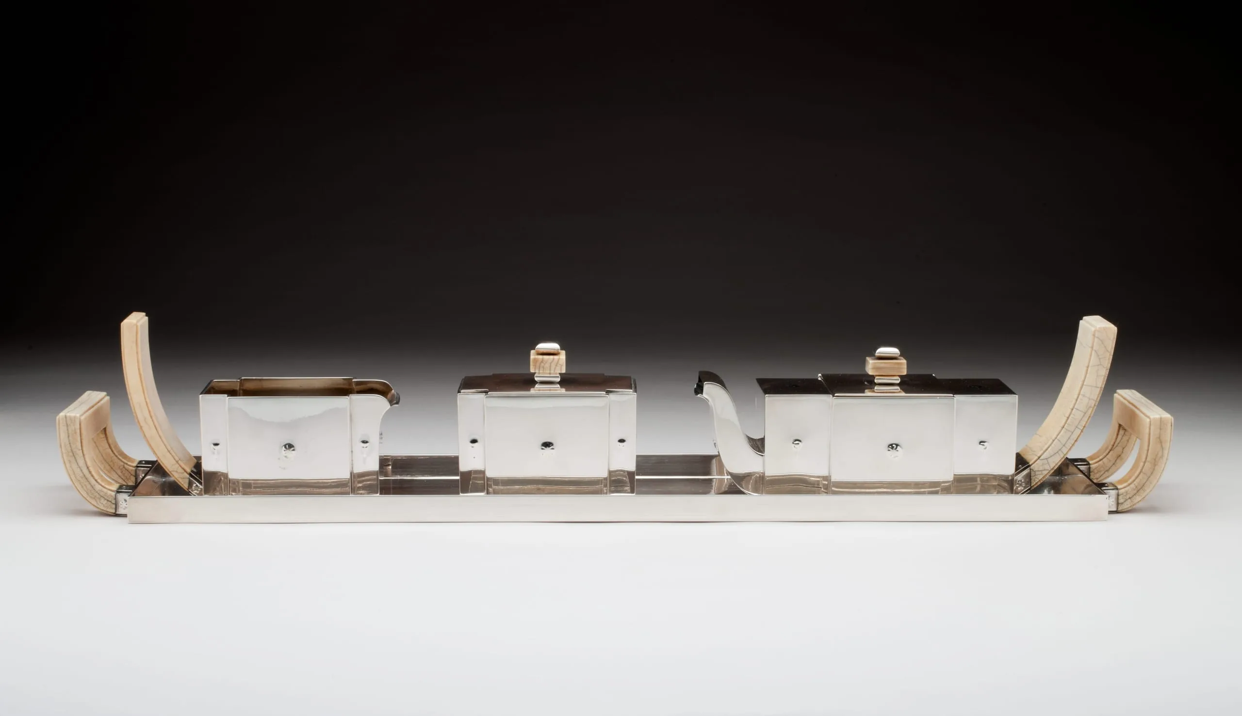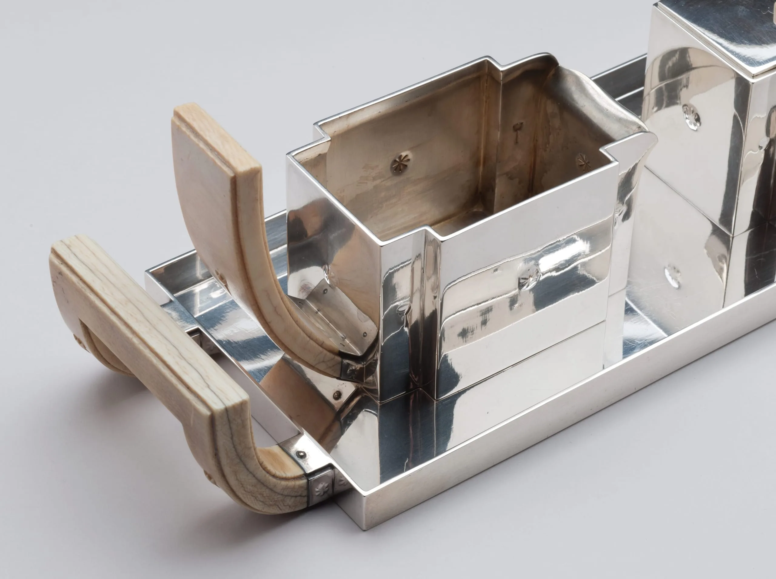 This four-piece tea service—one of only three in existence—is a masterpiece of Hoffmann's mature style. With its sleek surfaces, subtle repoussé ornament, and delicately carved tulips on ivory handles, the service combines luxury with modernity, a hallmark of Hoffmann's work for decades. In 1903, he established the cooperative workshop in Vienna, the Wiener Werkstätte. He and Koloman Moser (who left the firm in 1907) created departments for metalwork, bookbinding, leatherwork, cabinetmaking, glass, and ceramics, as well as an architectural office. A few years later, departments for printing, fashion, and textiles were added. Ambitiously, they aimed to cover all the crafts necessary to create a Gesamtkunstwerk—a total work of art that integrated every aspect of the design. In June of 1922, Hoffmann's friend, the émigré designer Joseph Urban, opened a branch of the company on Fifth Avenue in New York, where the silver tea service was sold. Trained as an architect, Urban immigrated to the United States in 1912, where he became the chief set designer for the Metropolitan Opera and for the Ziegfeld Follies in New York, and continued practicing as an architect. Urban had gone back to his native Vienna after World War I and was deeply affected by the serious depression that came after Austria's defeat in the war. When he returned to the U.S., he launched the "Artists Fund" to send aid to destitute artists. As another way to help his practically starving countrymen, he raised the money to open a salesroom for the Wiener Werkstätte in New York. This silver tea service of consummate craftsmanship was illustrated in the company brochure and priced at $650, a staggering figure for the time. We can date the set very precisely, since the Wiener Werkstätte kept detailed records, and the company archives are at the National Museum of Applied Art (the MAK) in Vienna. According to the records, the head of production, Philipp Häusler, signed off on the drawings for the tea set in March of 1922, authorizing it to be made. Three sets were produced, and the work was finished in March, 1923. (Another example is at the Richmond Museum of Art; the location of the third is unknown.) The Wiener Werkstätte of America closed in December 1923 after only eighteen months, however, as only a small minority of adventurous New Yorkers were patrons of proto–art deco. (The style was popularized at the Paris Exposition of 1925.) Hoffmann himself considered this service of such importance that he included it in the sumptuous catalogue celebrating the company's twenty-fifth anniversary, The Wiener Werkstätte 1903-1928: Modern Decorative Art and its Path. The teaset was purchased from Joseph Urban by Frances Marion, a renowned screenwriter in Los Angeles, the first woman to win an Academy Award for the best original screenplay. Urban and Frances Marion knew each other well from their close association with William Randolph Hearst. Urban was Hearst's favorite art director and personal friend—during the 1920s, he designed dozens of films for Hearst's company. And since Frances Marion was one of Hearst's favorite writers, she and Joseph Urban worked together on several Hollywood films. In the 1921 feature Enchantment, Urban placed the first modern interior design in an American movie—a Wiener Werkstätte dining room.