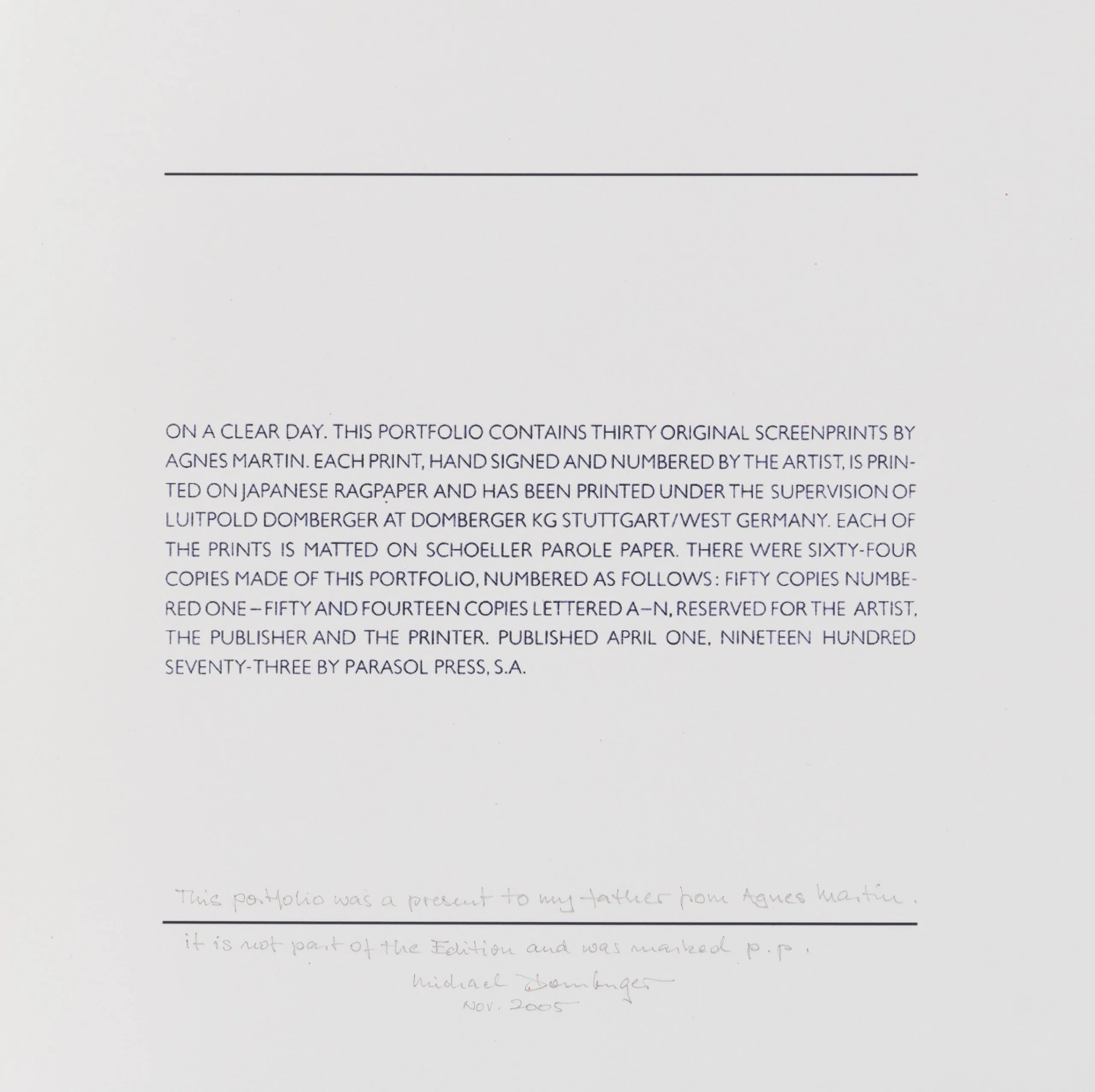 Agnes Martin's monumental thirty-print suite, On a Clear Day, was produced near the end of a seven-year period (1967–1974) in which the artist ceased painting entirely. Living in self-imposed isolation on a lonely mesa in New Mexico to which she had escaped after several years in New York, years in which she had achieved both fame and critical success, and fleeing what she saw as the burden of endless distractions, inescapable impediments to the necessary clearing of her mind to achieve her goal of an "egoless" art embodying beauty, freedom, and happiness, she sought refuge in near-total seclusion.