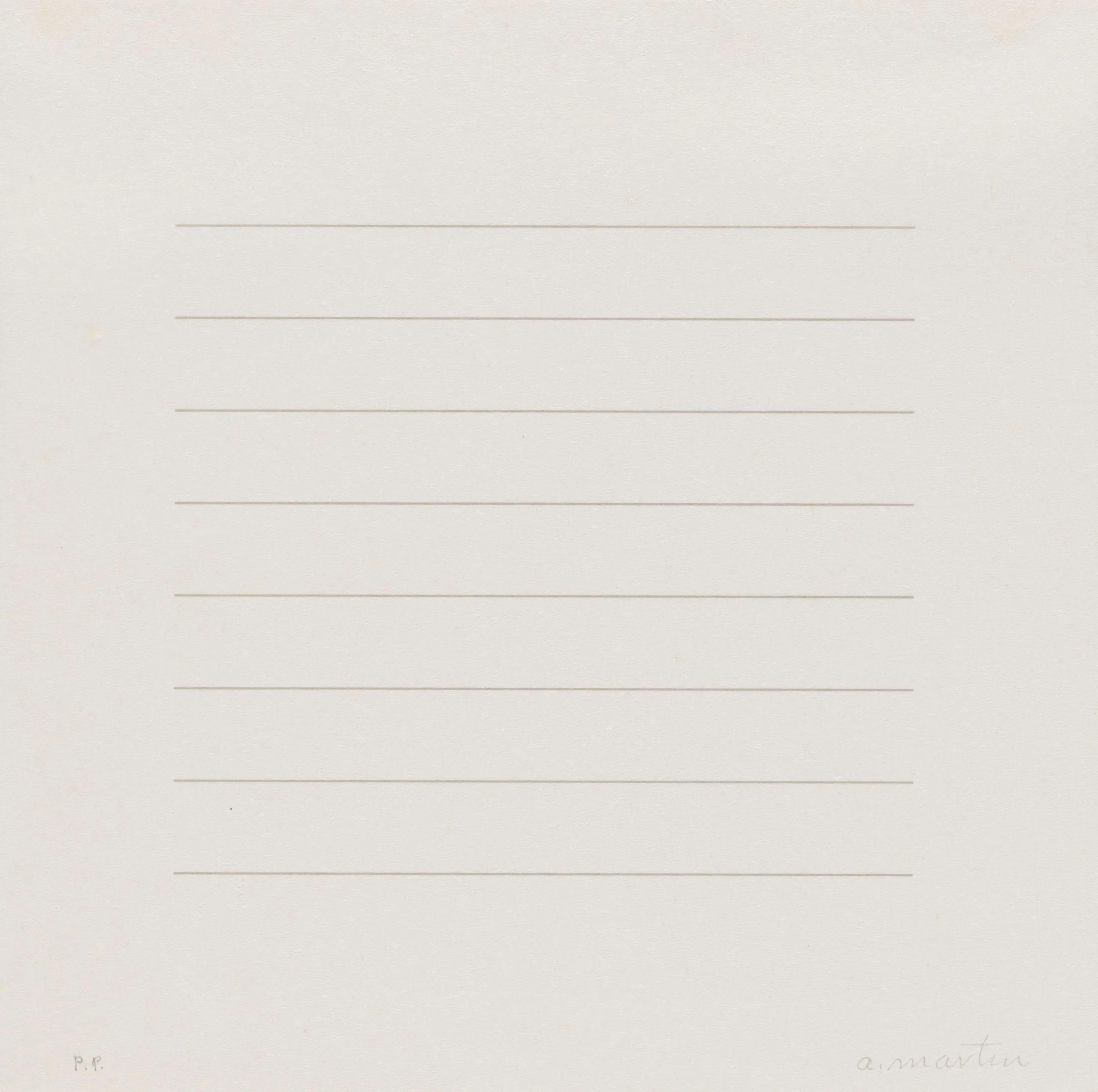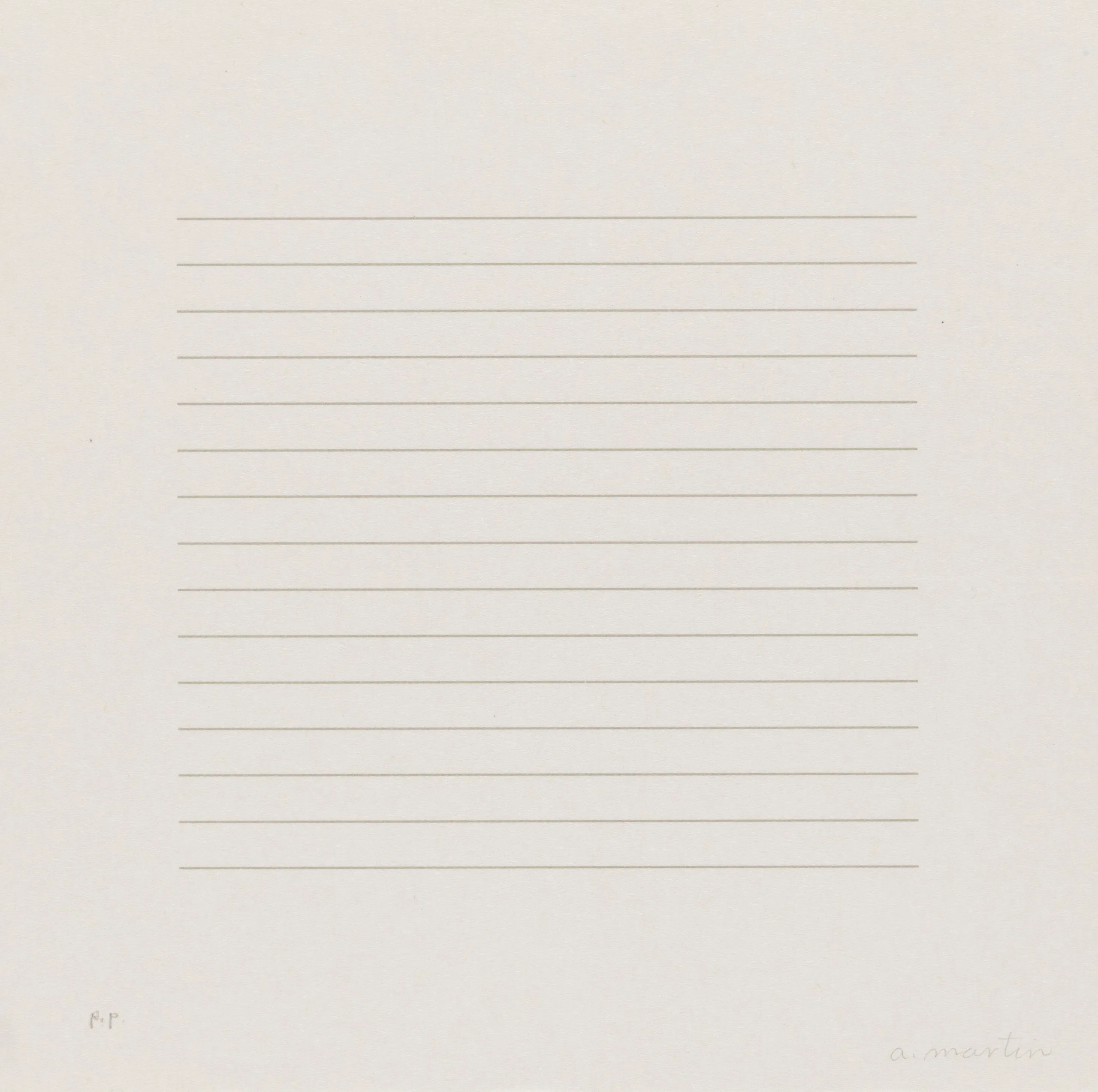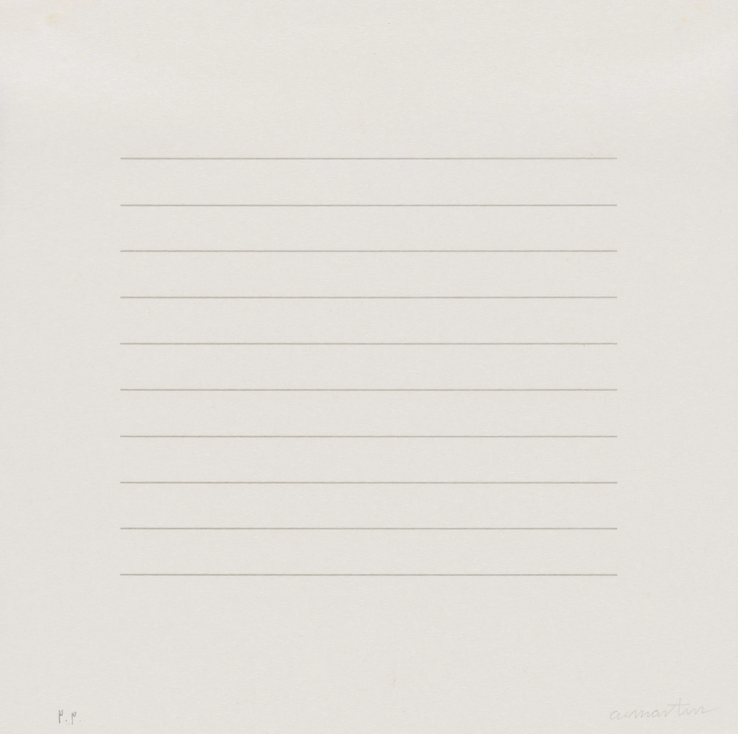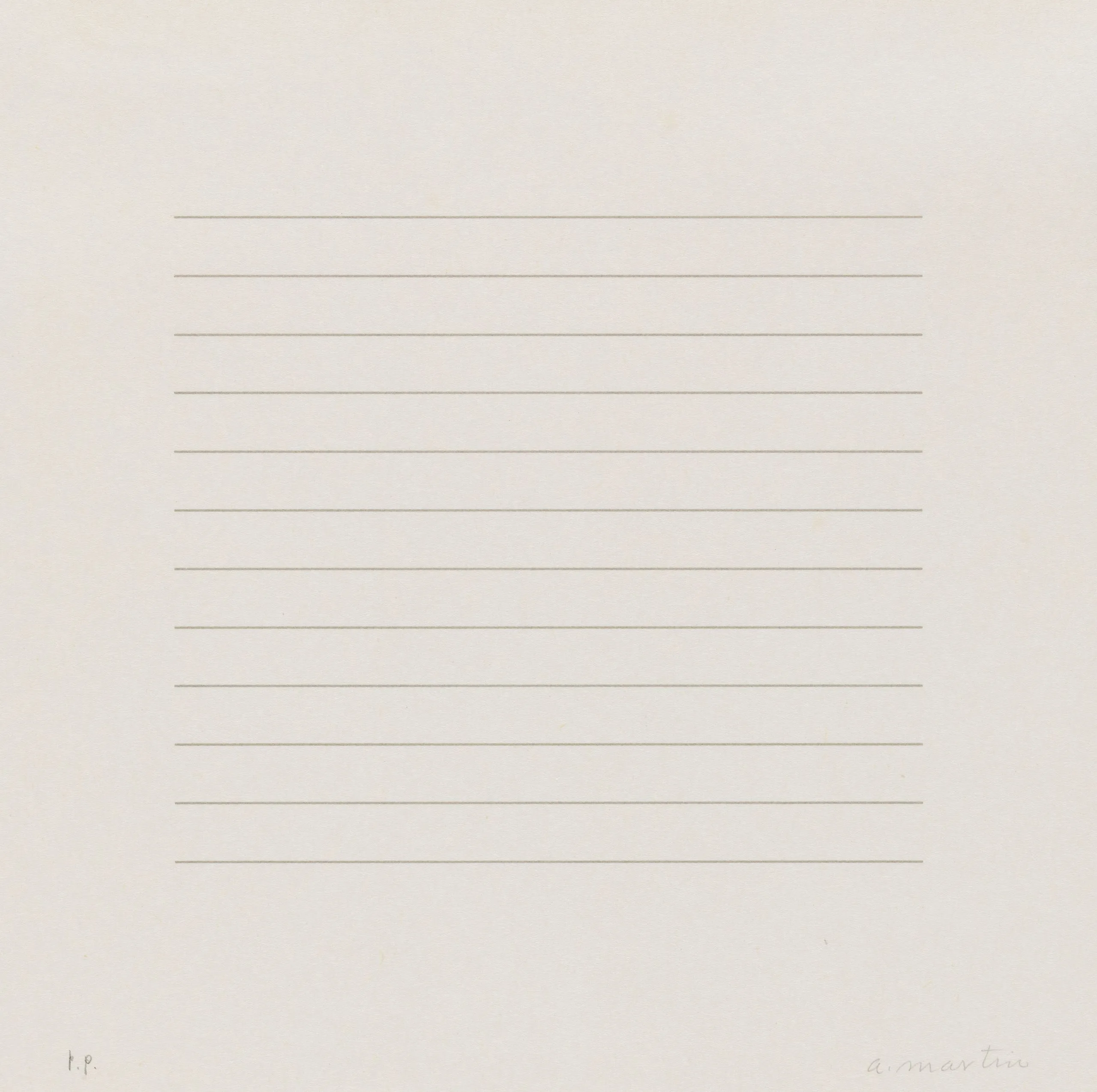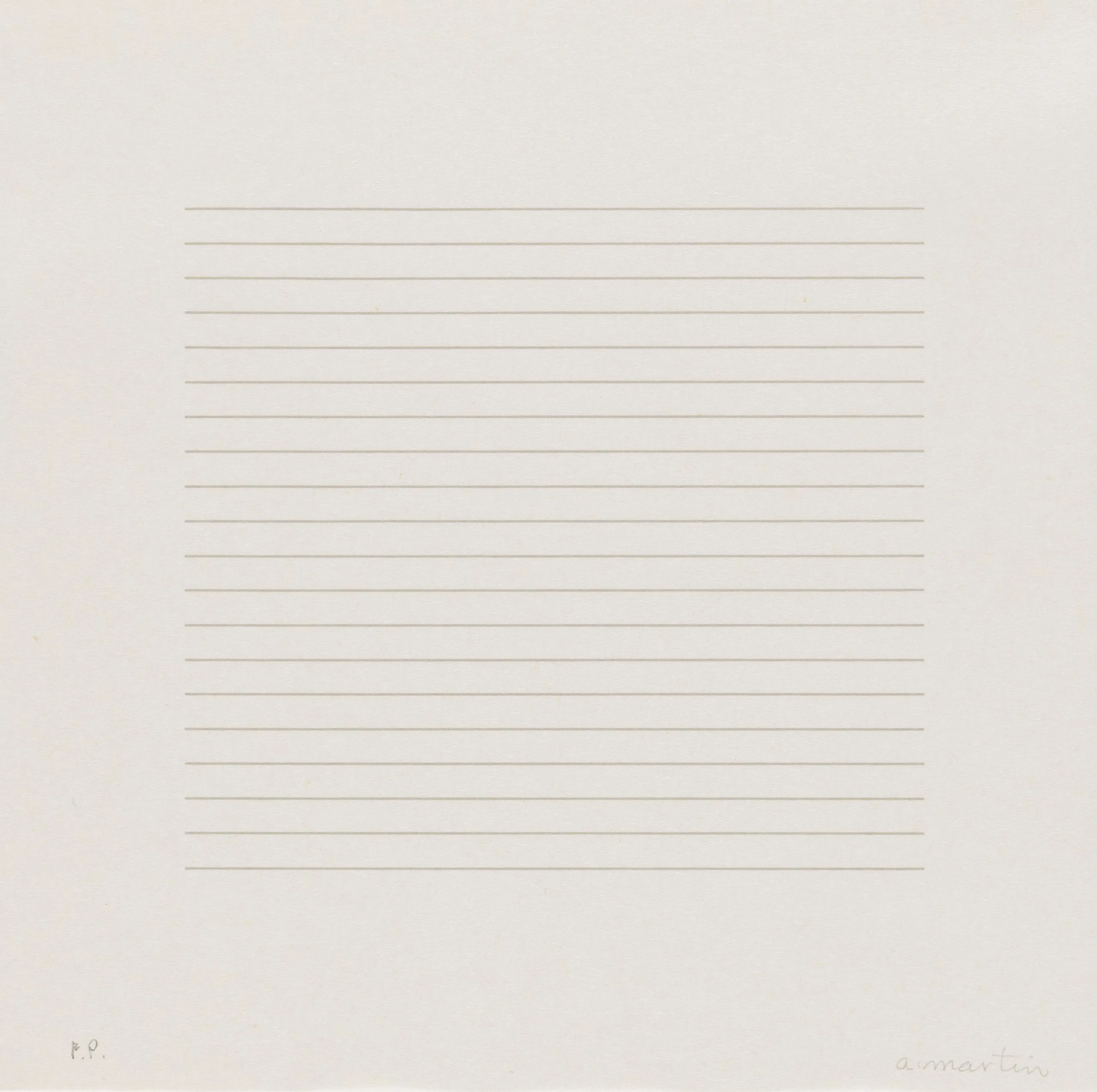 Print on off-white paper with evenly spaced fine horizontal lines across a square central field, with a pencil signature at lower right.