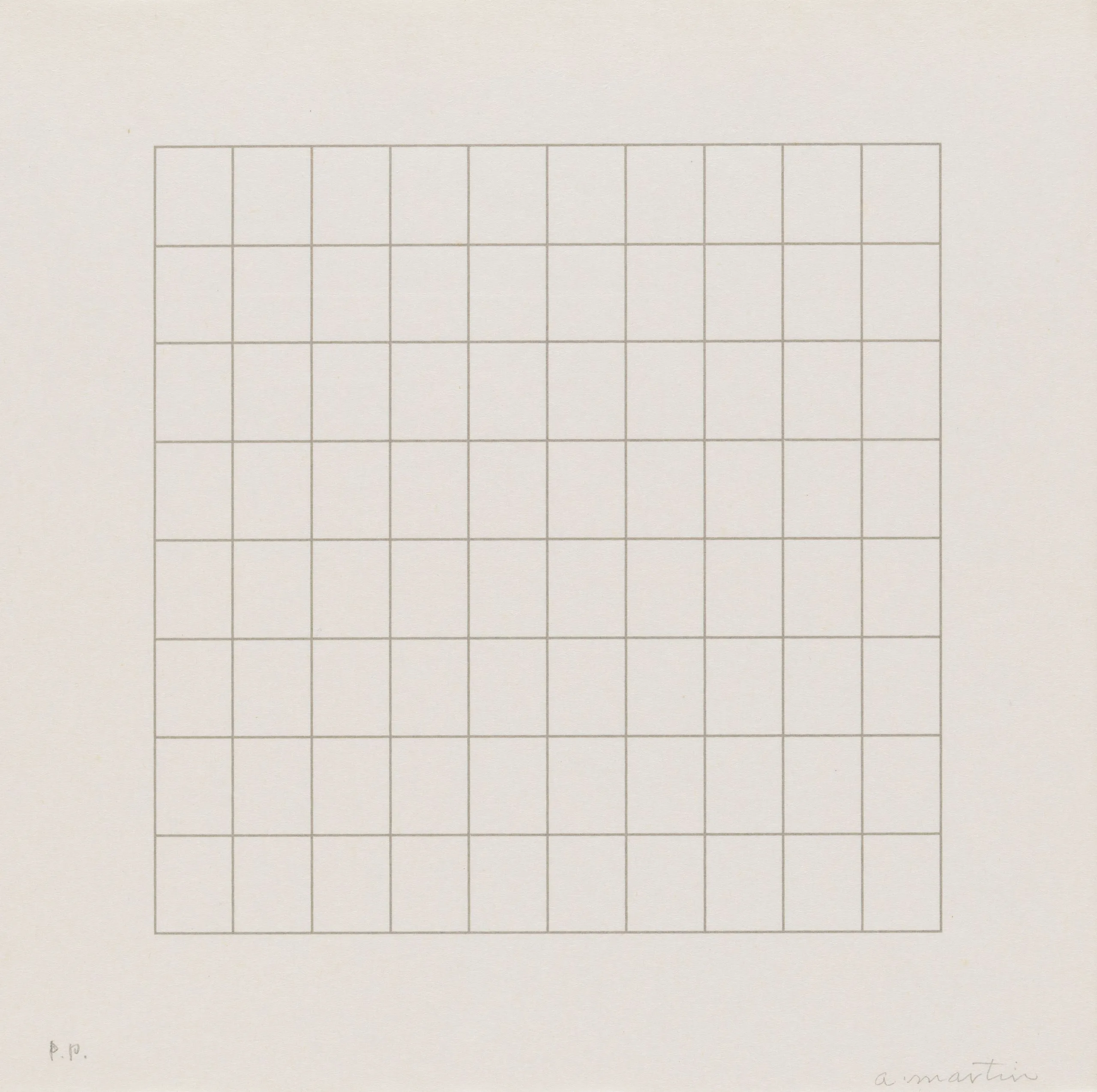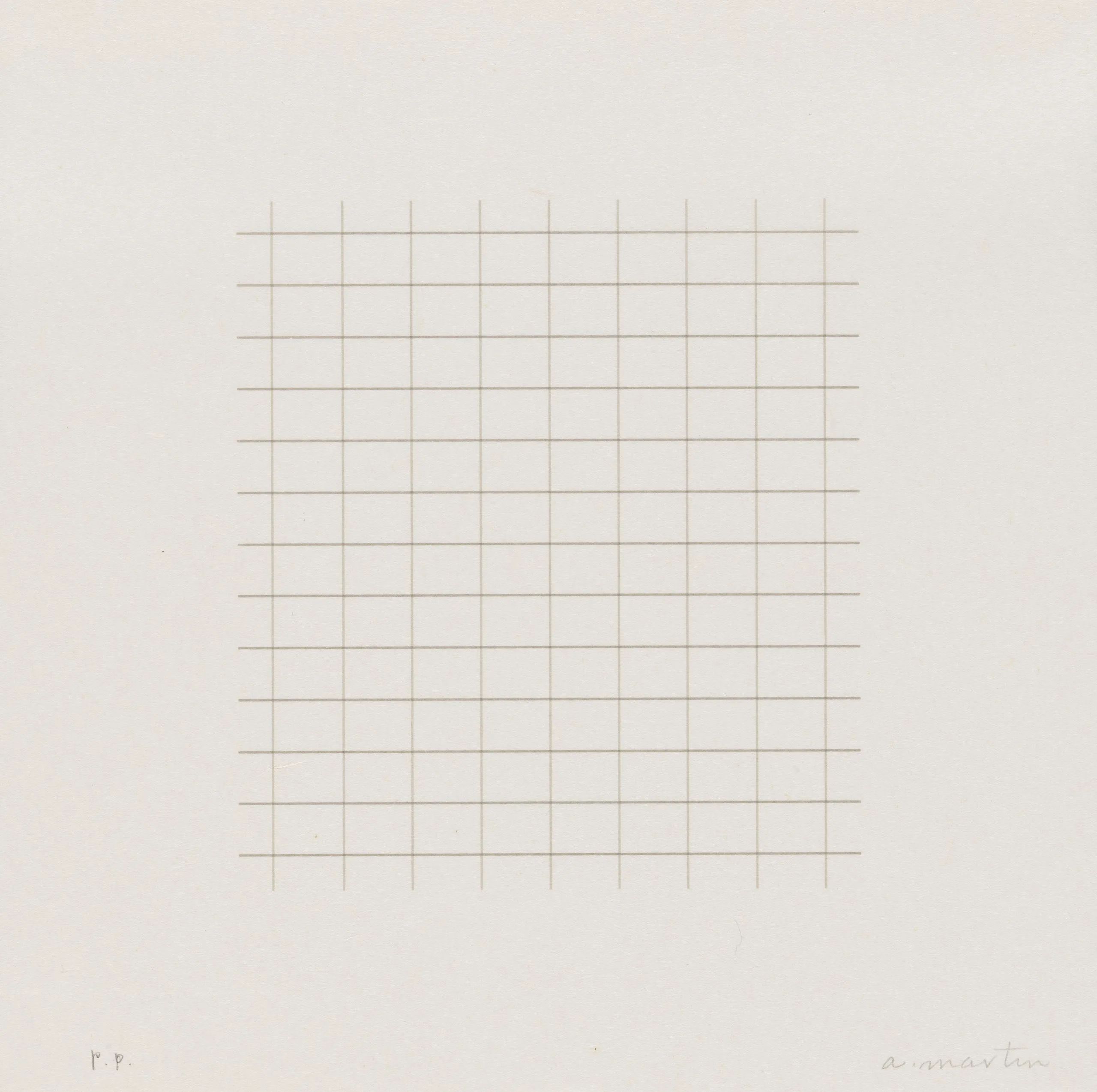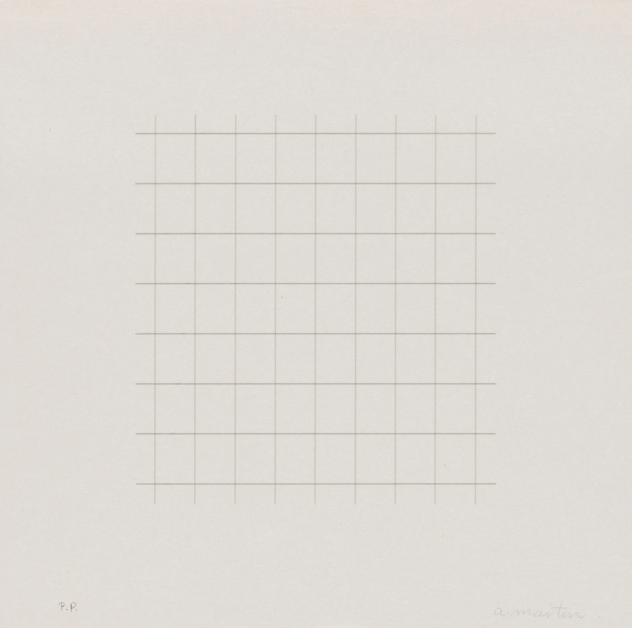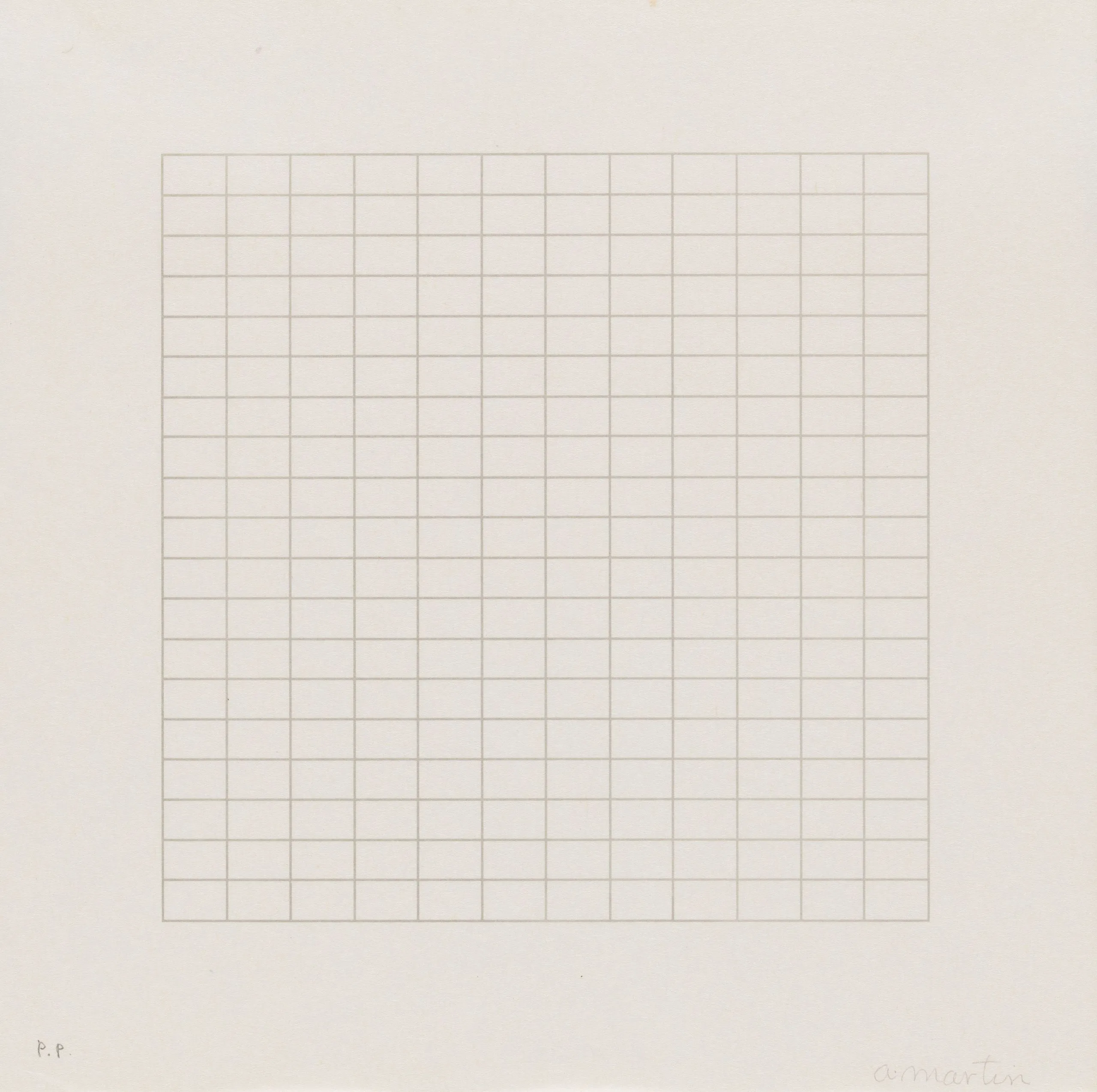 Print with a centered square grid of fine, evenly spaced horizontal and vertical lines in pale tan on white paper, with a handwritten inscription at lower right and "P.P." at lower left.