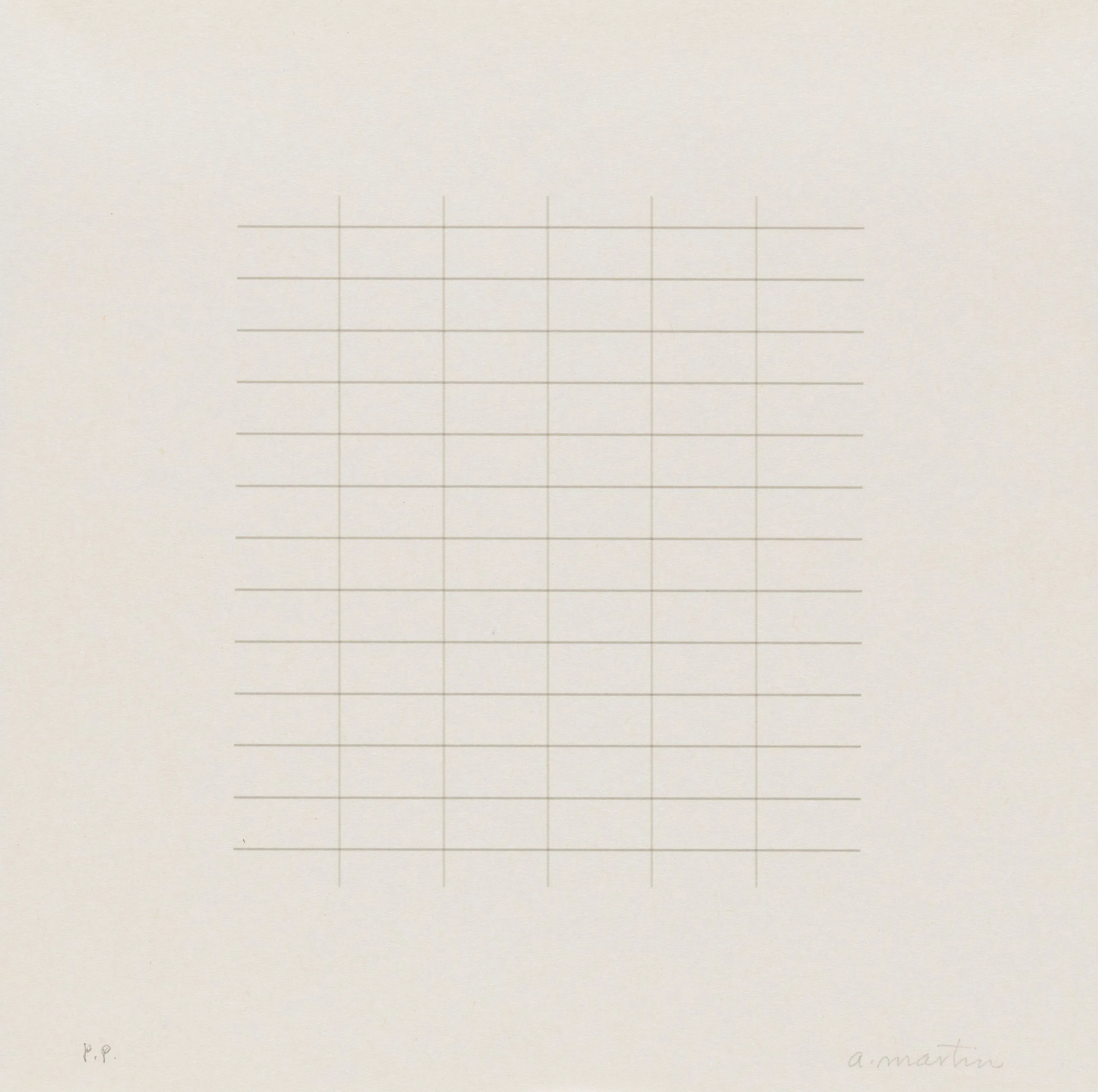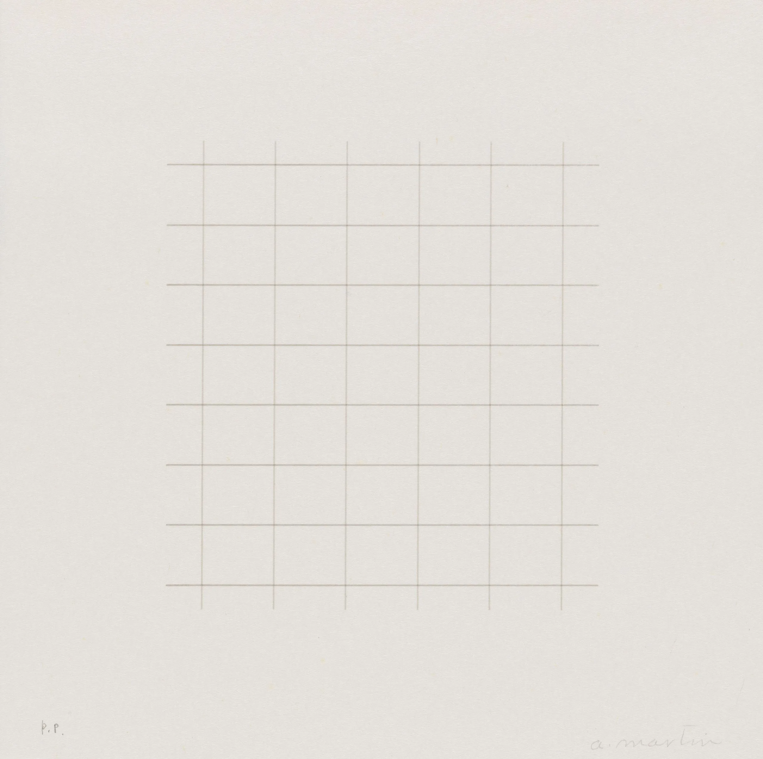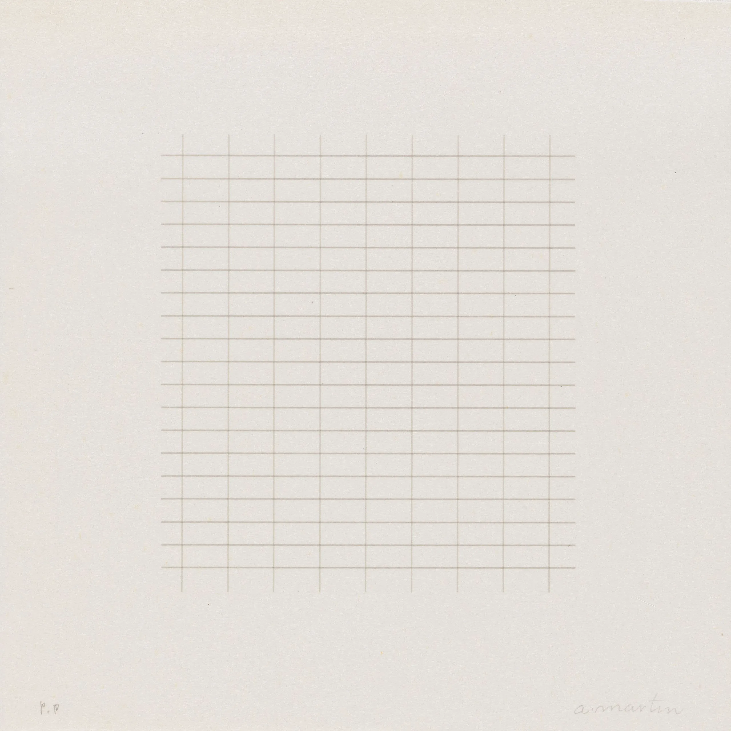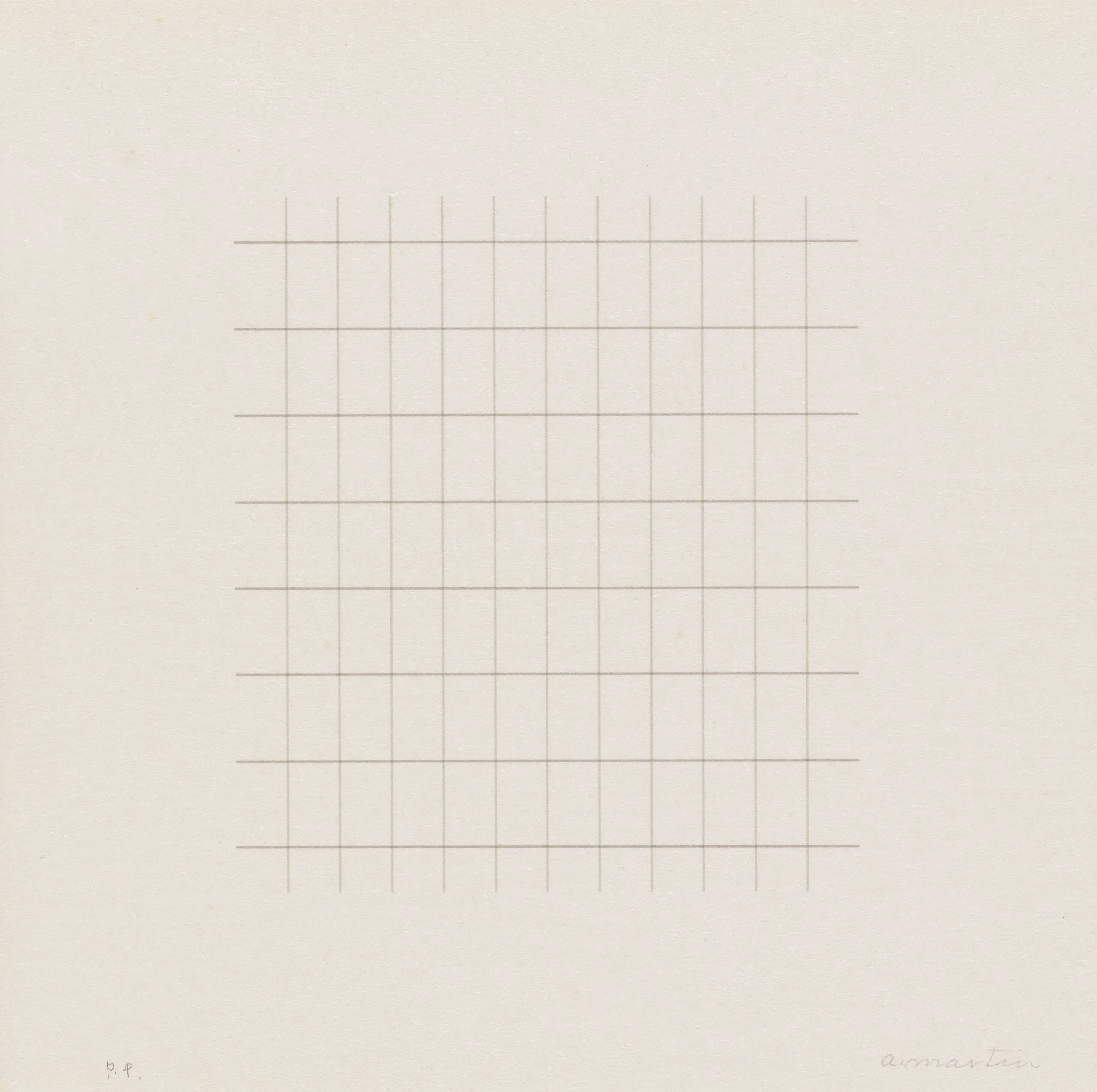 Print with a centered square grid of fine, evenly spaced horizontal and vertical lines in pale tan on white paper, with a handwritten inscription at lower right and "P.P." at lower left.