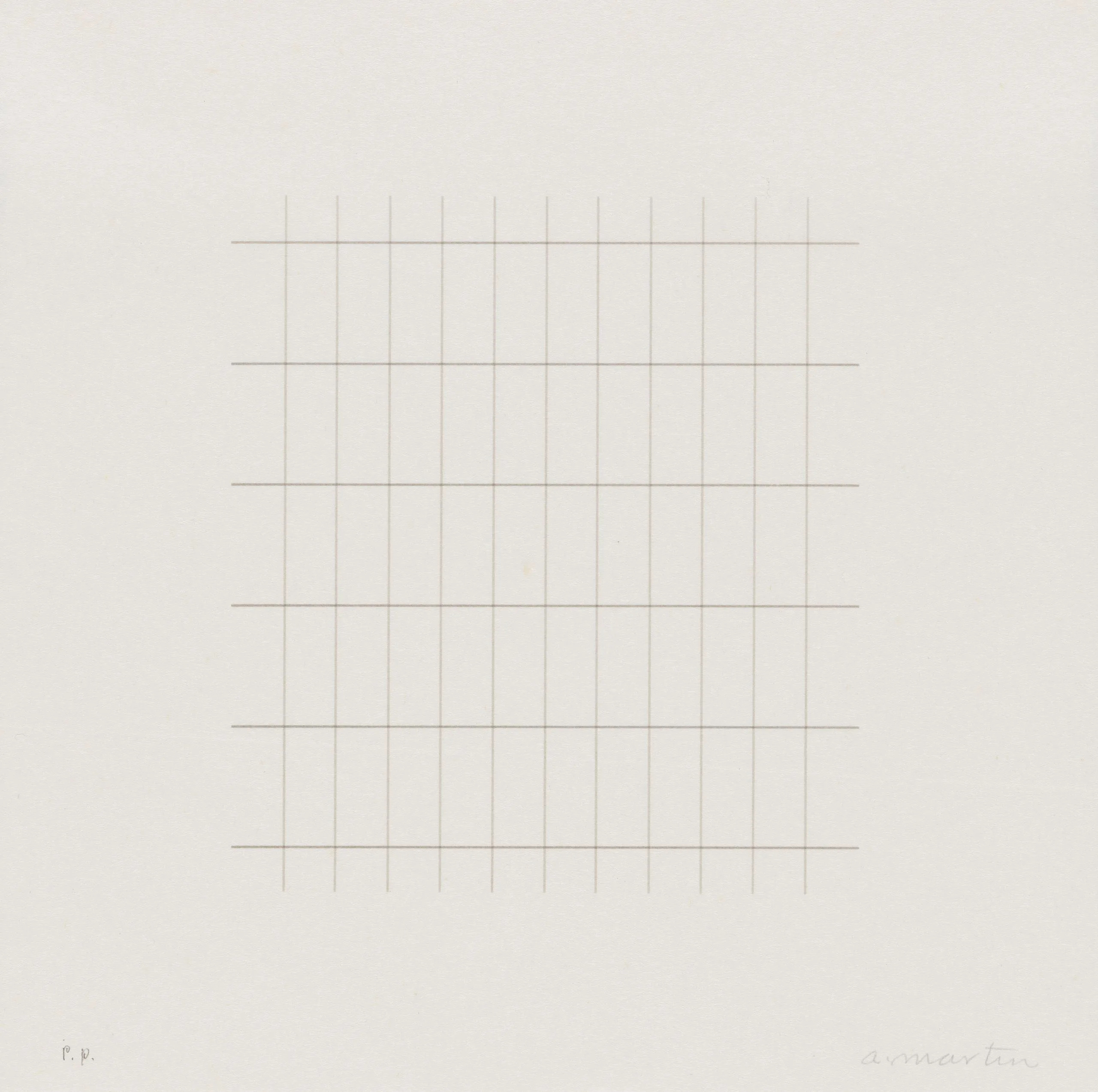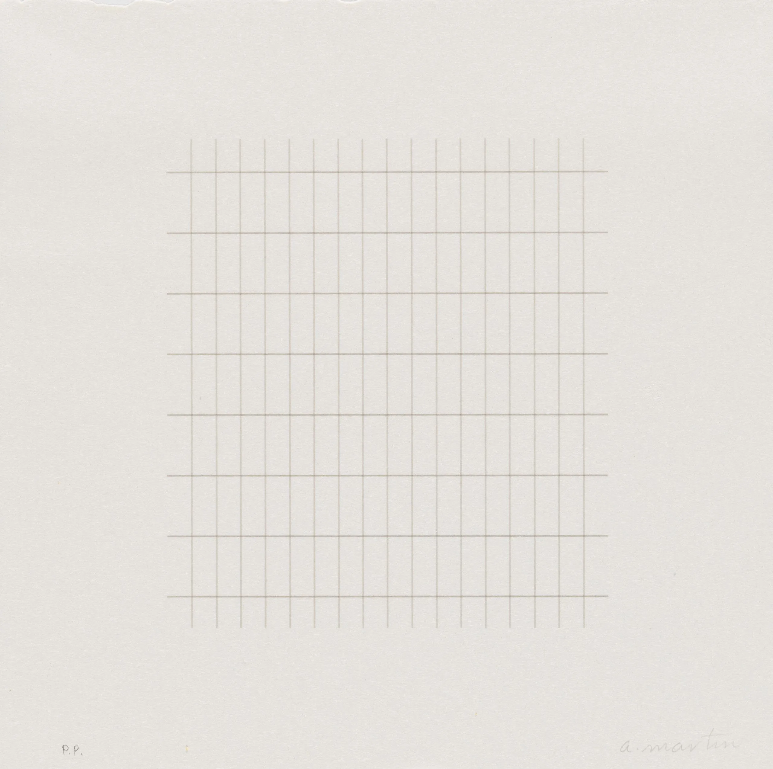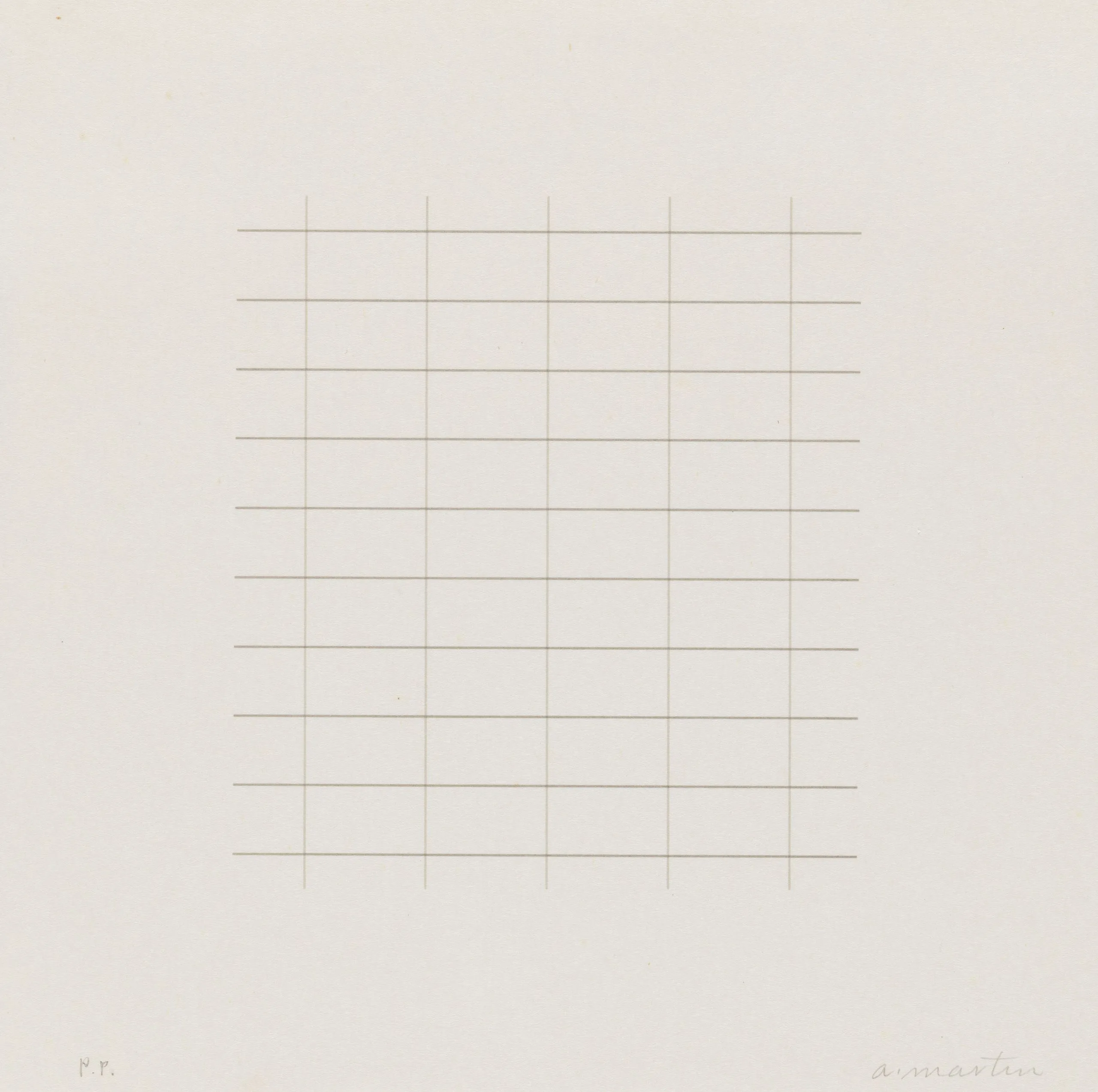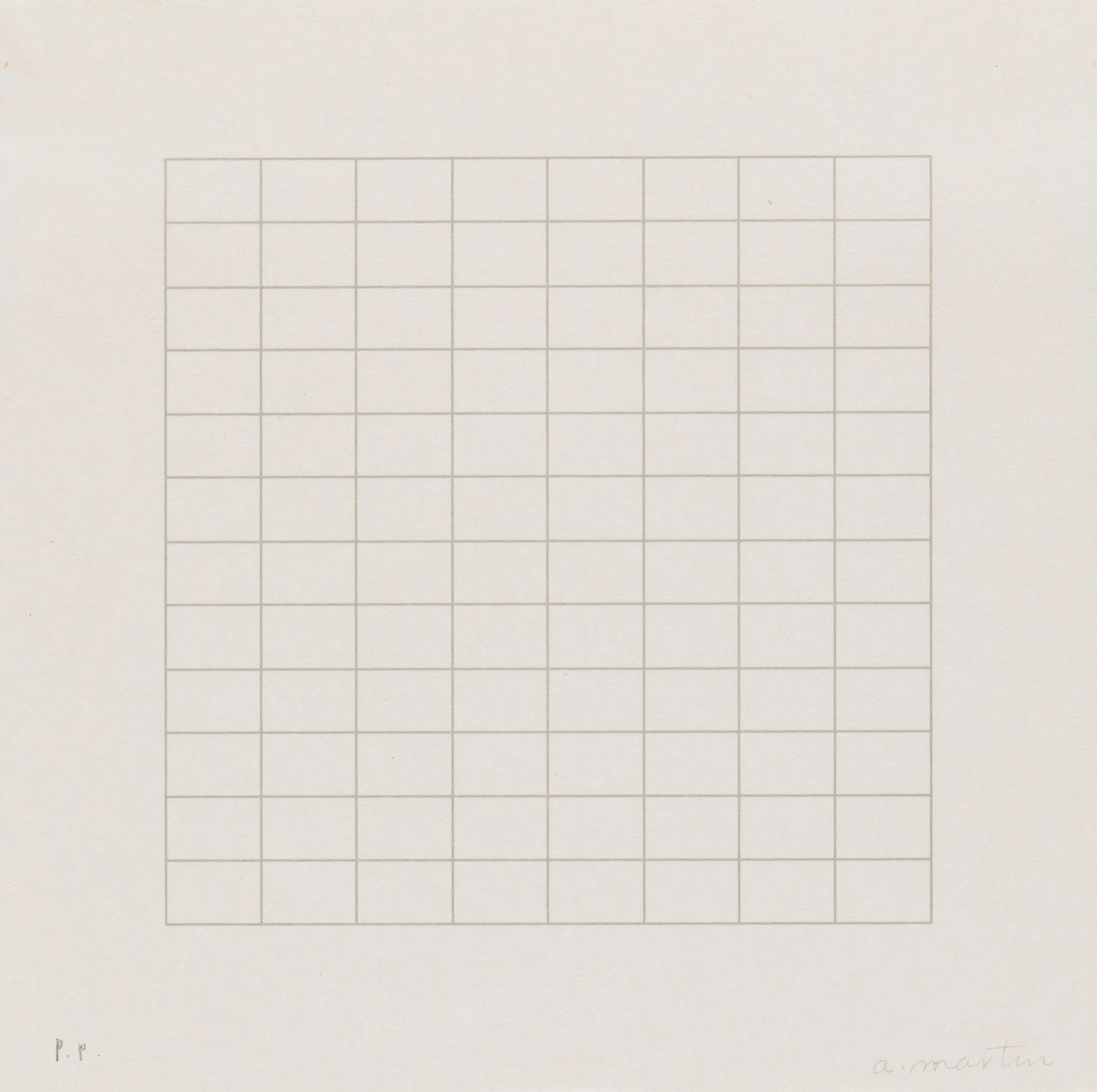 Print with a centered square grid of fine, evenly spaced horizontal and vertical lines in pale tan on white paper, with a handwritten inscription at lower right and "P.P." at lower left.