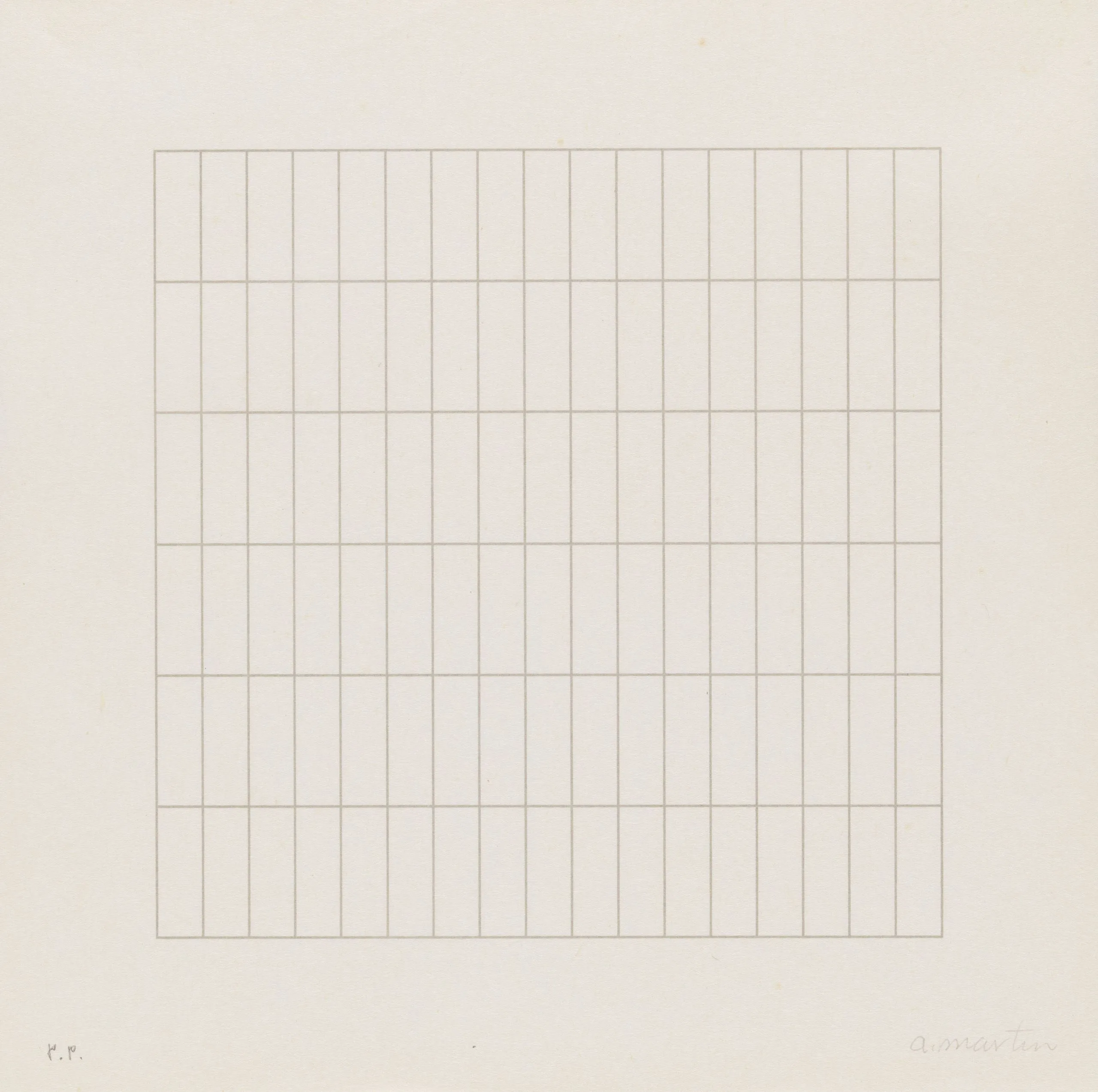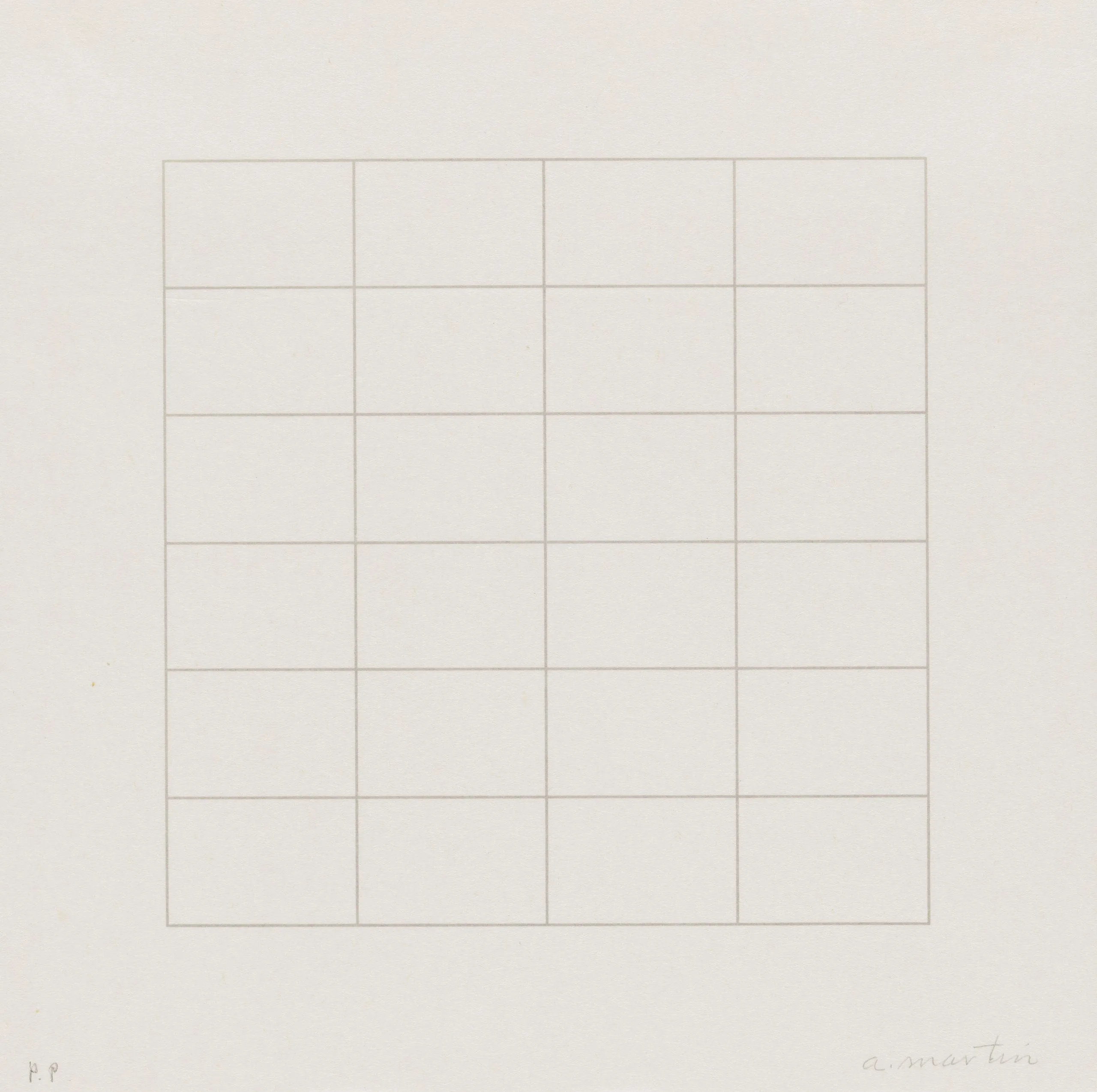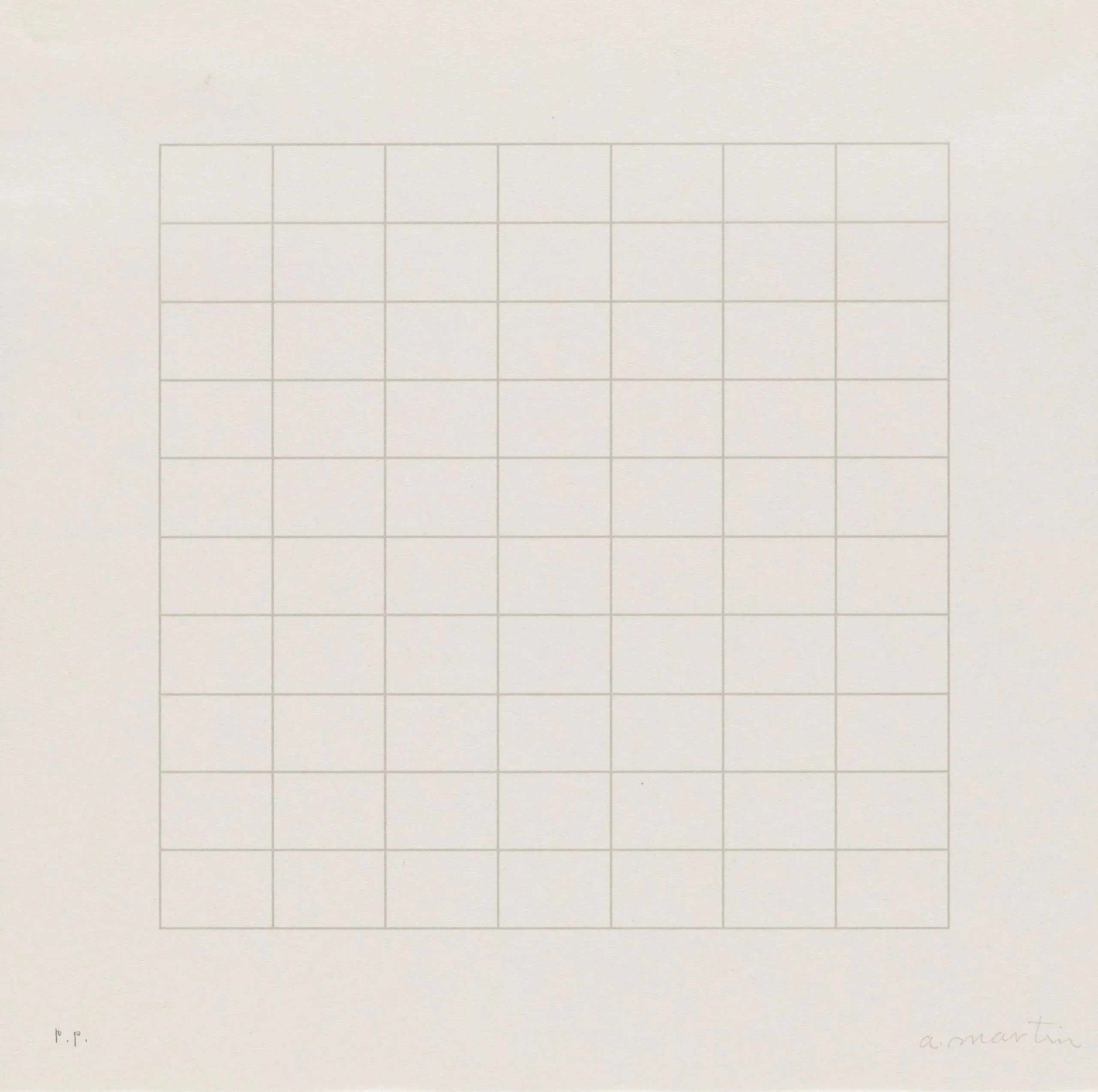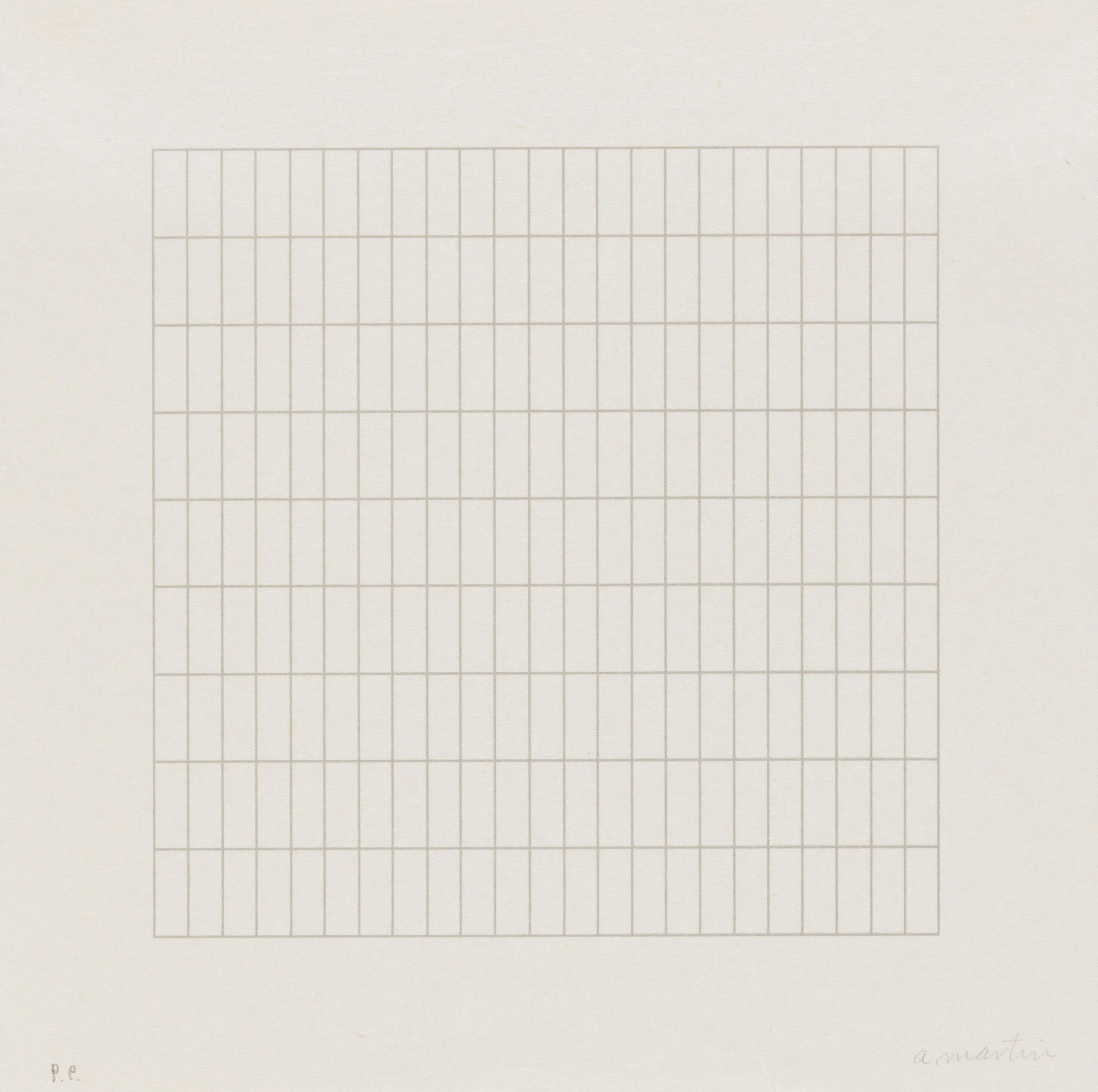 Print with a centered square grid of fine, evenly spaced horizontal and vertical lines in pale tan on white paper, with a handwritten inscription at lower right and "P.P." at lower left.