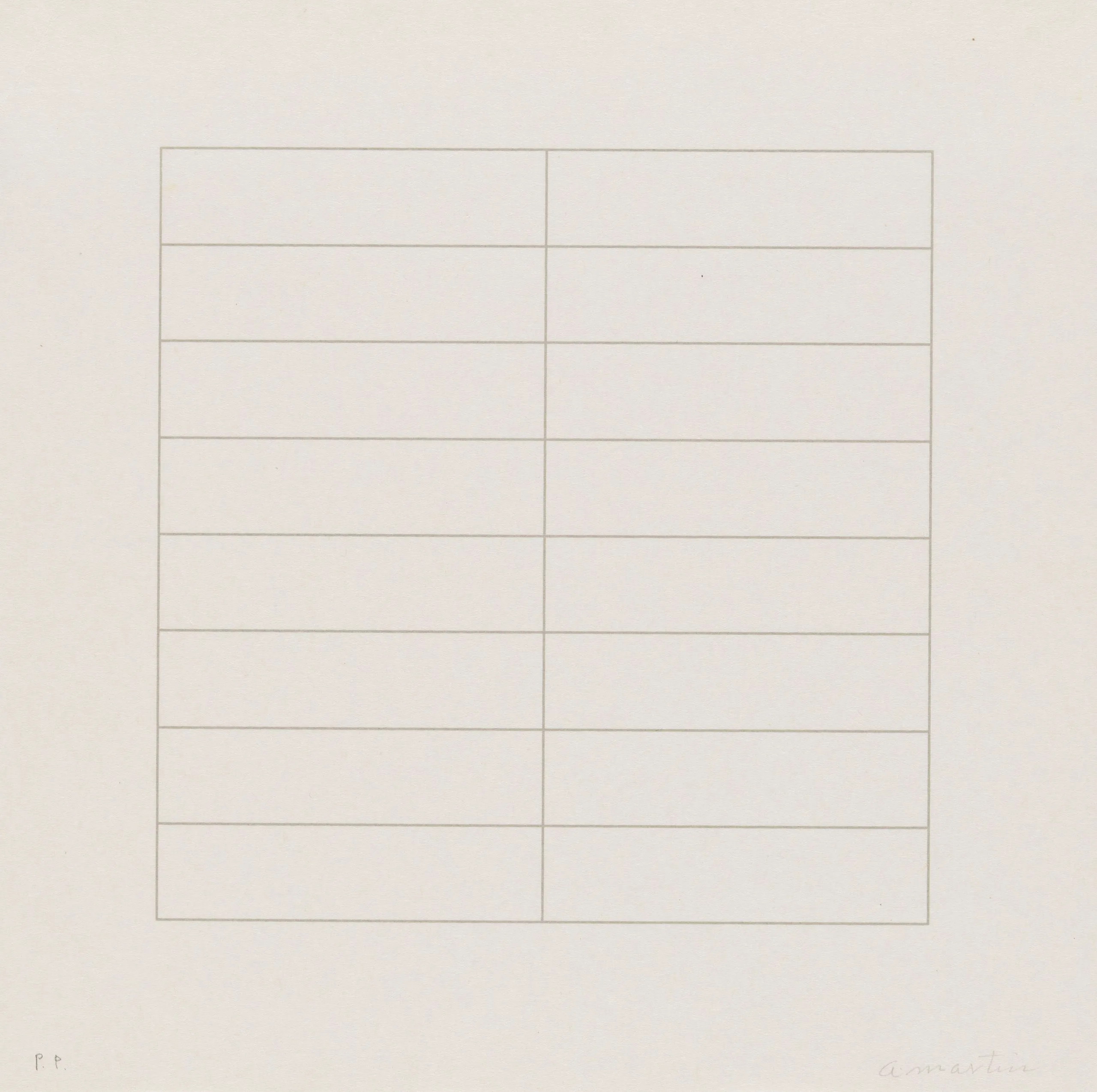 Print on cream paper featuring a centered rectangular grid of fine graphite lines forming two columns and ten rows of uniform horizontal bands, with a handwritten signature at lower right.