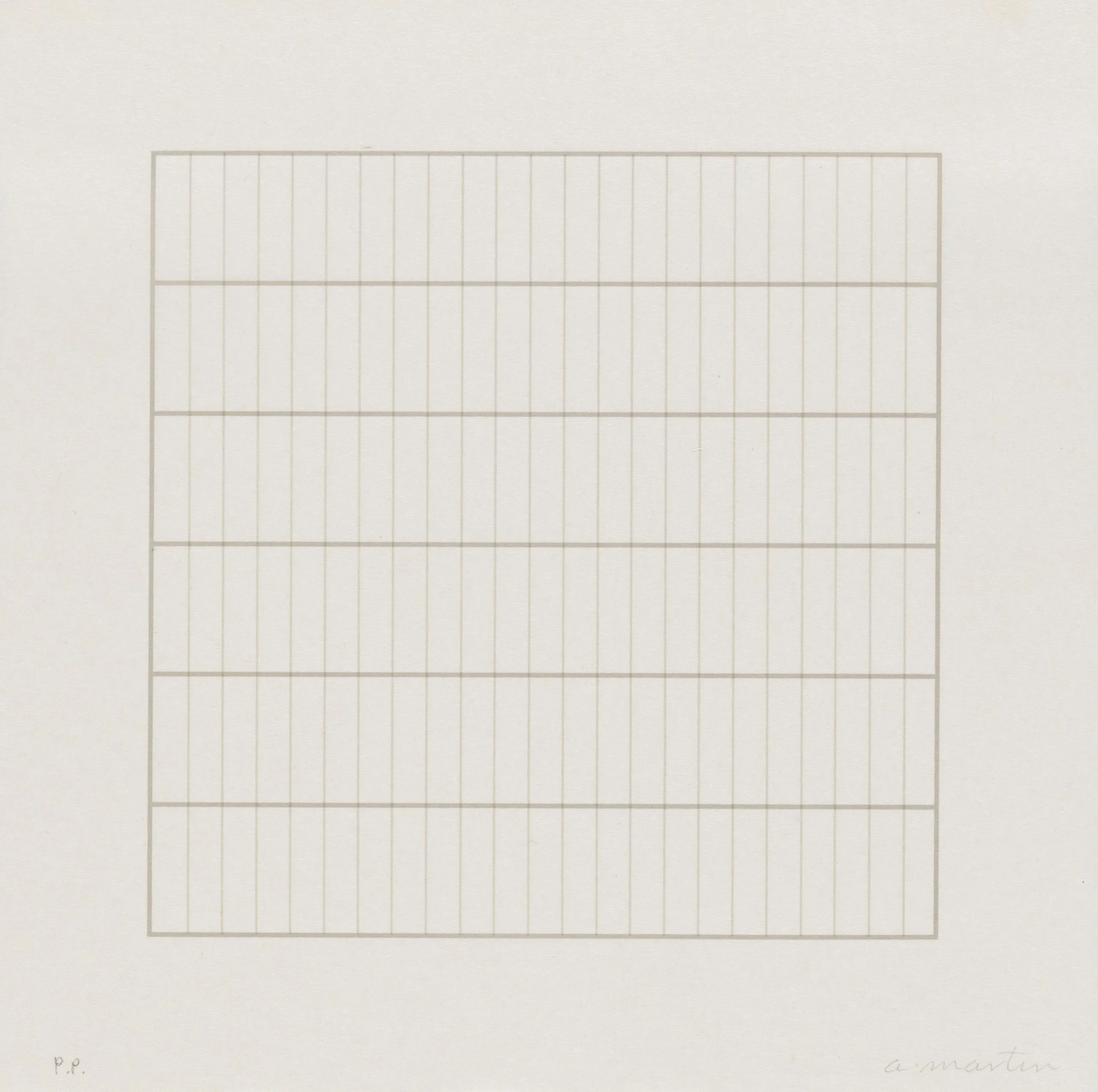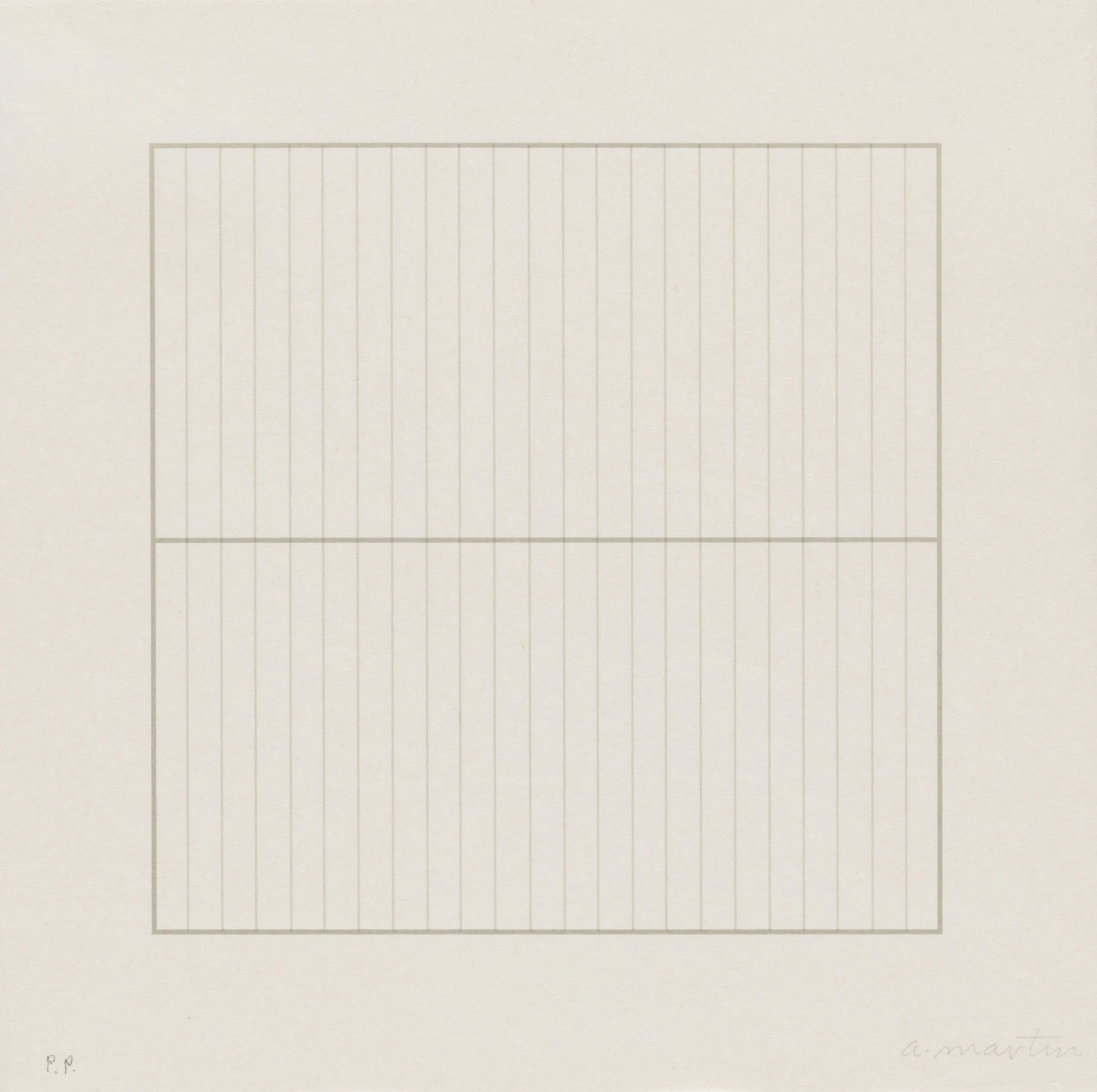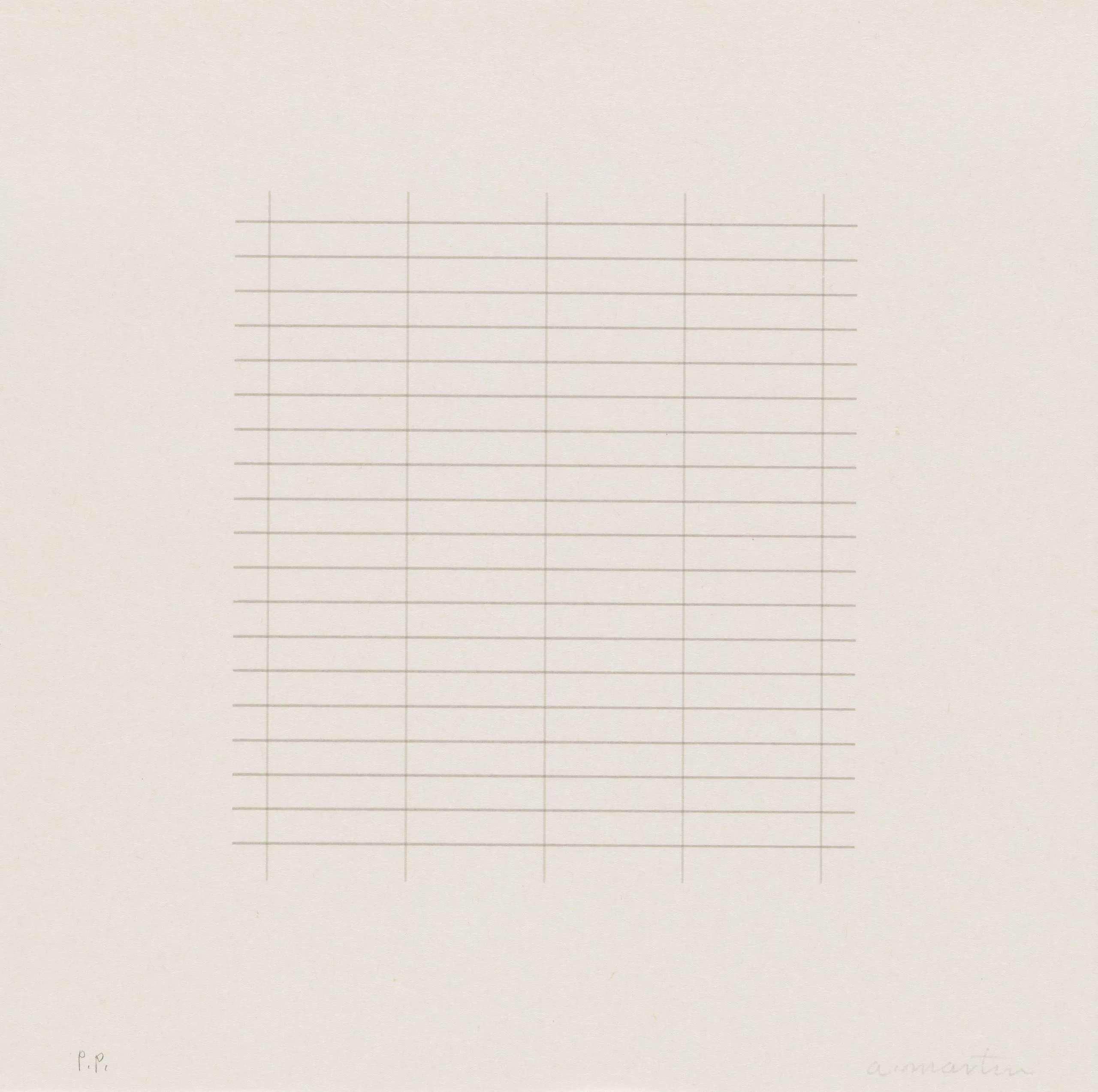 Print with evenly spaced horizontal lines in pale gray-brown forming a square grid on an off-white ground, with wide margins on all sides.