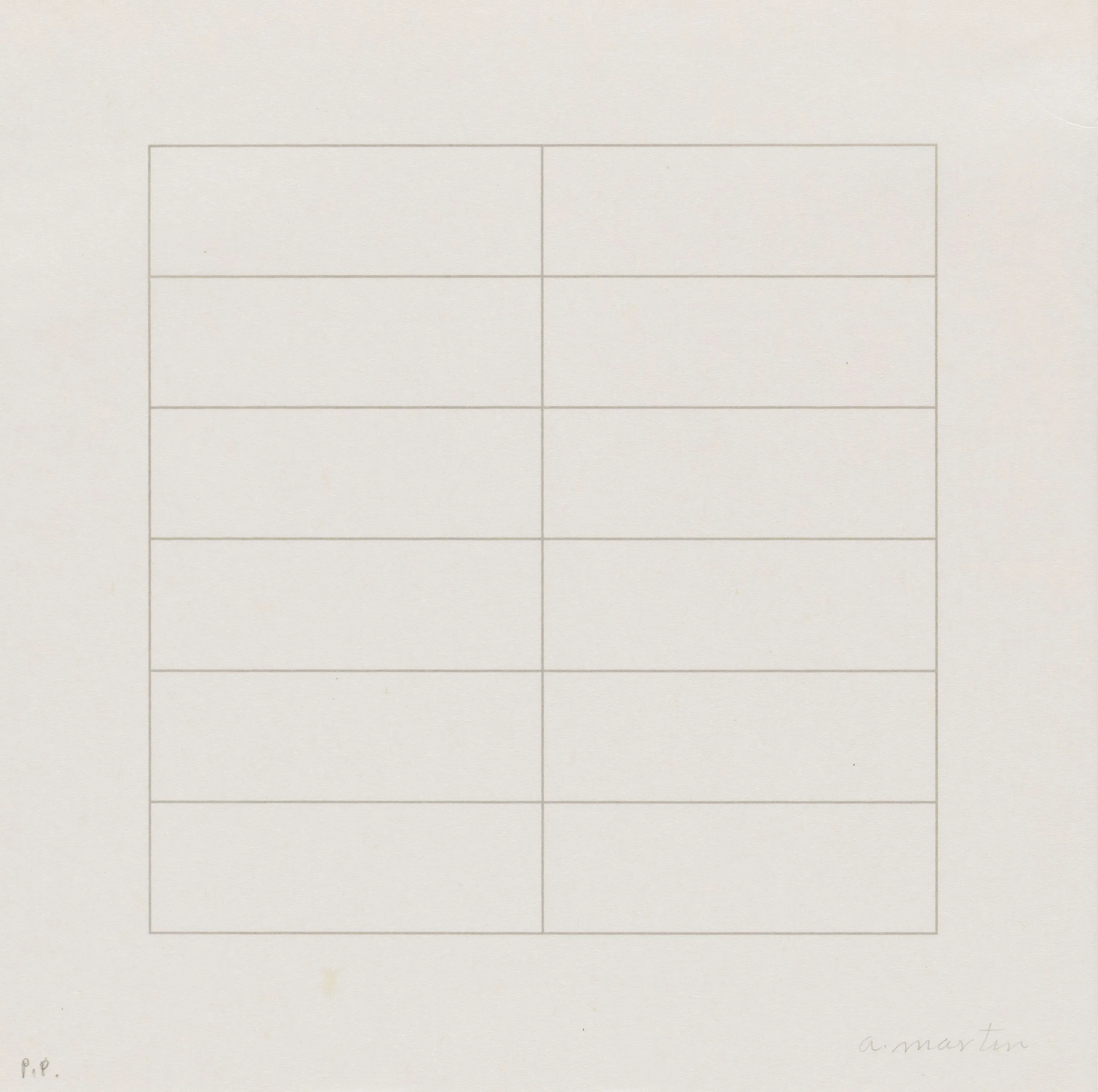 Print with a square grid of fine graphite lines forming two columns and six rows of rectangles, centered on off-white paper with a handwritten signature at lower right.